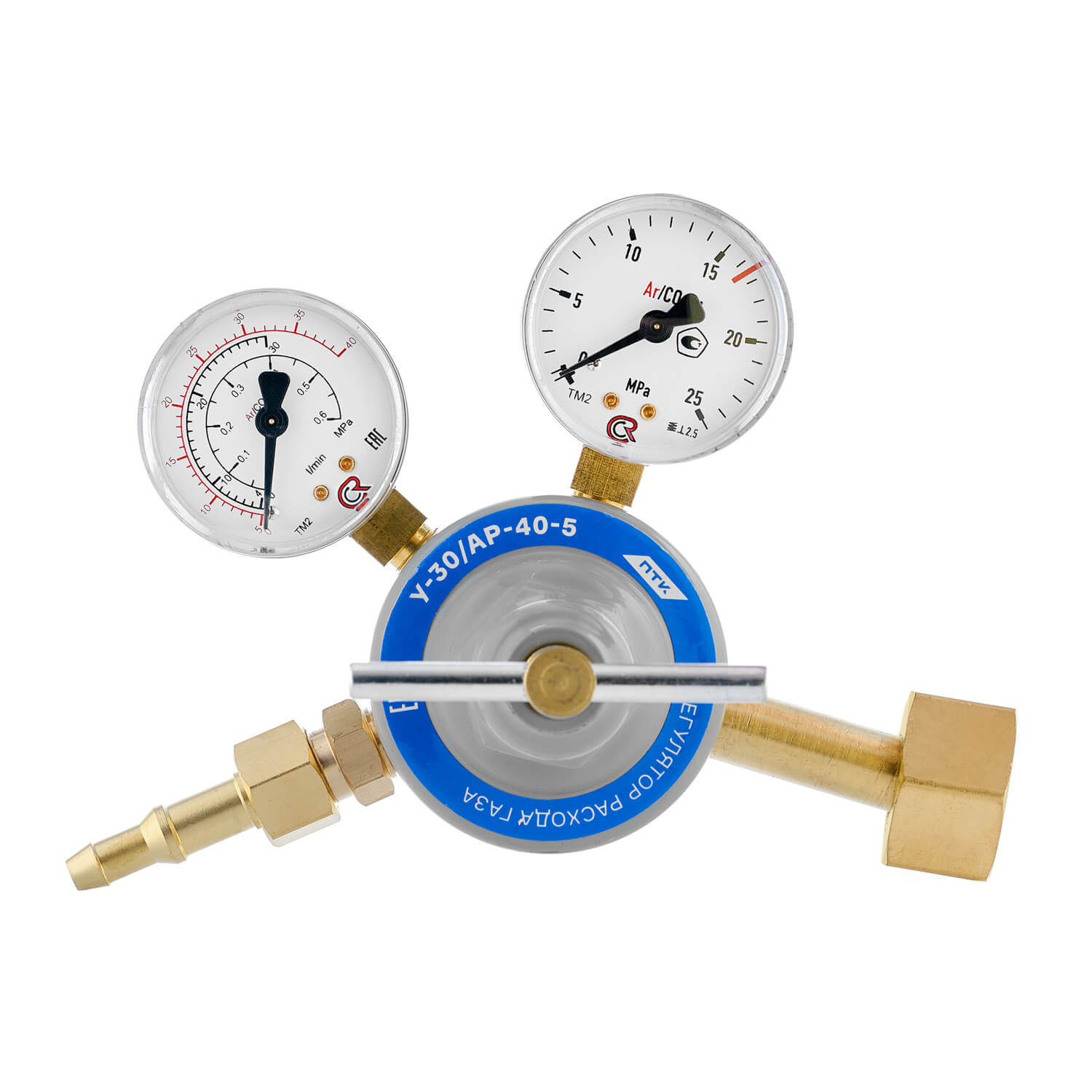 Регулятор расхода газа У-30/АР-40-5 с манометрами для углекислоты и аргона предназначен для понижения давления газа и автоматического поддержания постоянным заданного расхода при питании постов и установок в среде защитных газов.