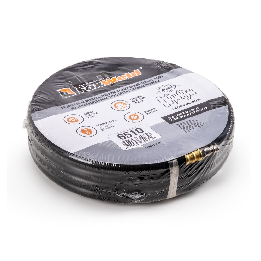 Воздушный резиновый армированный шланг AERO от FoxWeld с фитингами Rapid F - Rapid M, длиной 10 м. Используется для подключения пневмоинструмента к компрессору, достаточная длина оснастки позволяет осуществлять работы на требуемом расстоянии. Увеличенный внутренний диаметр шланга 9 мм обеспечивает лучшую пропускную способность для сжатого воздуха и обеспечивает сохранение максимальной производительности. Шланг класса С - произведен из маслостойкой резины (полиуретан), что обеспечивает ему высокую износоустойчивость и возможность подключения его к воздушной магистрали с содержанием частиц масла при работе в связке с масляным воздушным компрессором. Также благодаря армированию, шланг выдерживает высокие нагрузки по давлению сжатого воздуха до 25 бар и может храниться и эксплуатироваться при температурах от -25 до +70 градусов Цельсия. Концевые муфты типа рапид изготовлены из качественного сплава, устойчивого к коррозии и деформации. Изделие имеет соответствие стандарту ГОСТ ISO 2398-2014.