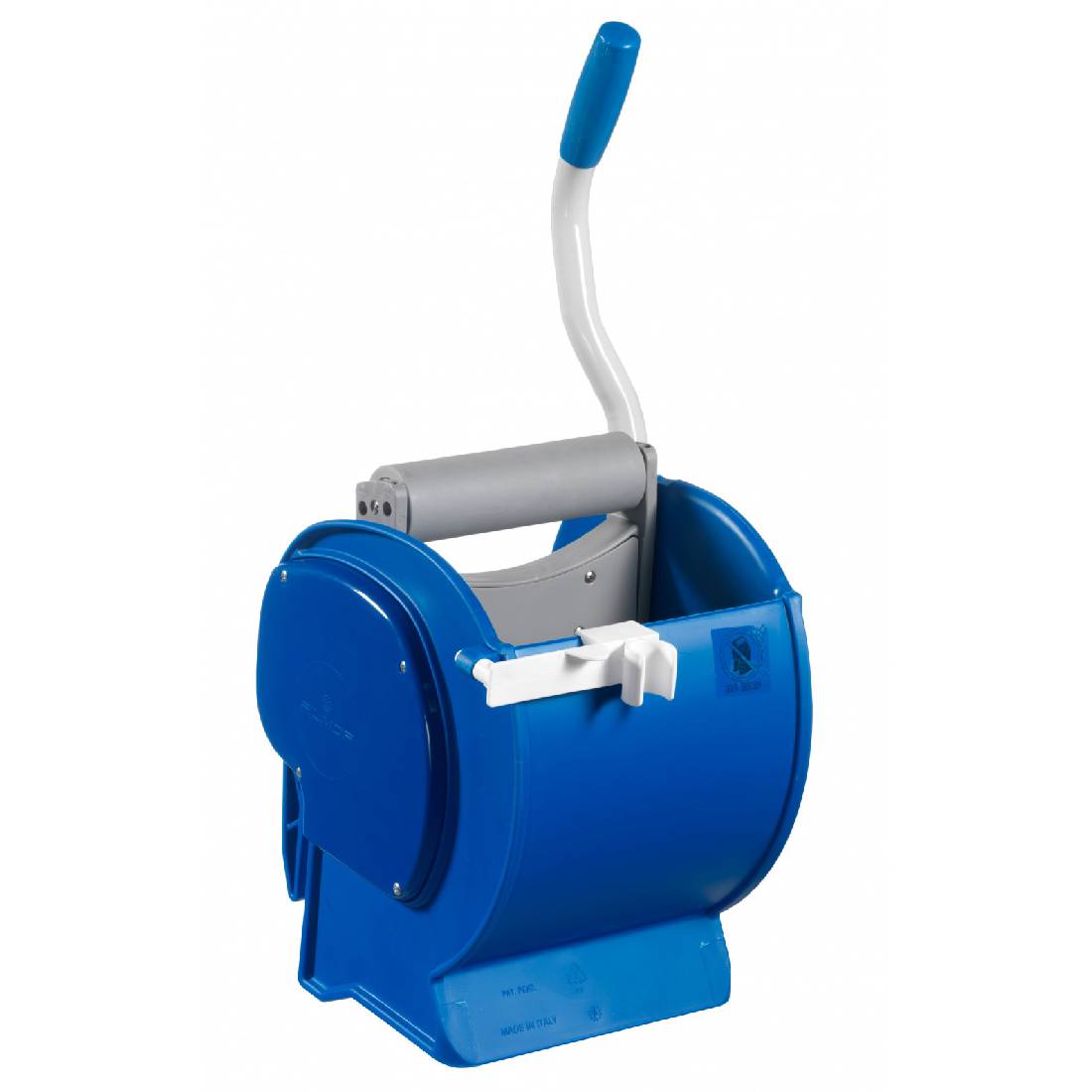 Роликовый отжим PUNTO предназначен для отжимания плоских МОПов. Корпус выполнен из полипропилена, механизм из алюминиевого сплава, а ролик состоит из полипропилена с прорезиненной основой. Конструкция отжима состоит из направляющей, ручки и валика, который прижимает мокрый моп к стенке отжима, тем самым осушая его.  Идеально выжимает моп за счёт наличия в нижней части отжима множества отверстий, через которые сливается в ведро вода из мопа. В комплект поставки вместе с отжимом также входит удобный зажим-крепление, для фиксирования рукоятки уборочного инвентаря. Фиксатор крепится непосредственно к корпусу отжима. С помощью данного зажима Вы можете надёжно зафиксировать уборочную швабру в ведре тележки. Механический отжим значительно облегчает и ускоряет работу уборщика.