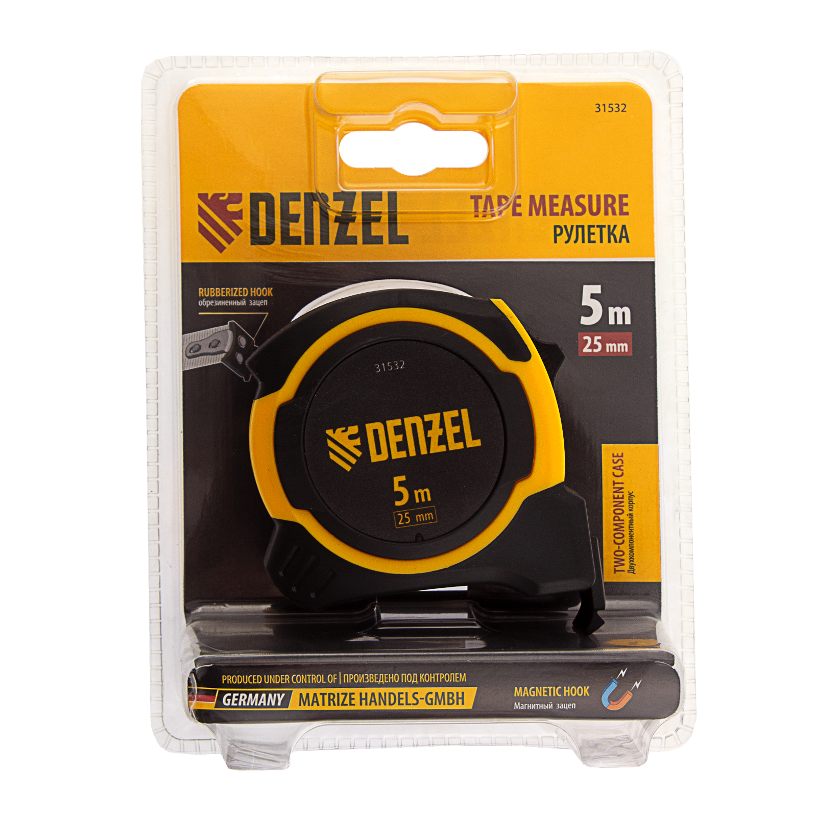 Рулетка 5м х 25мм, двухкомп. корпус, магнитный обрезиненный зацеп Denzel в Уфе