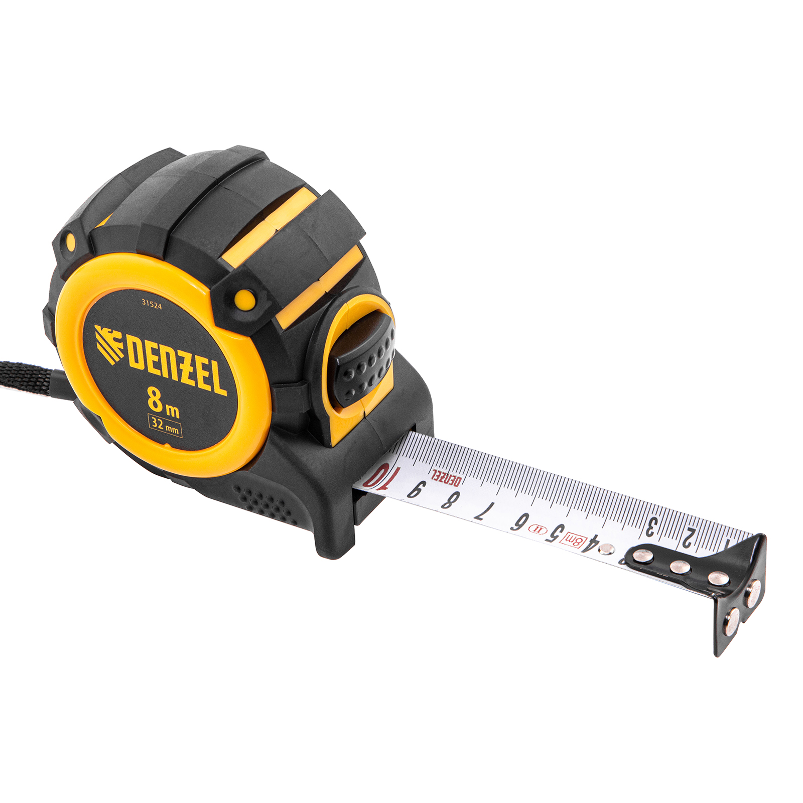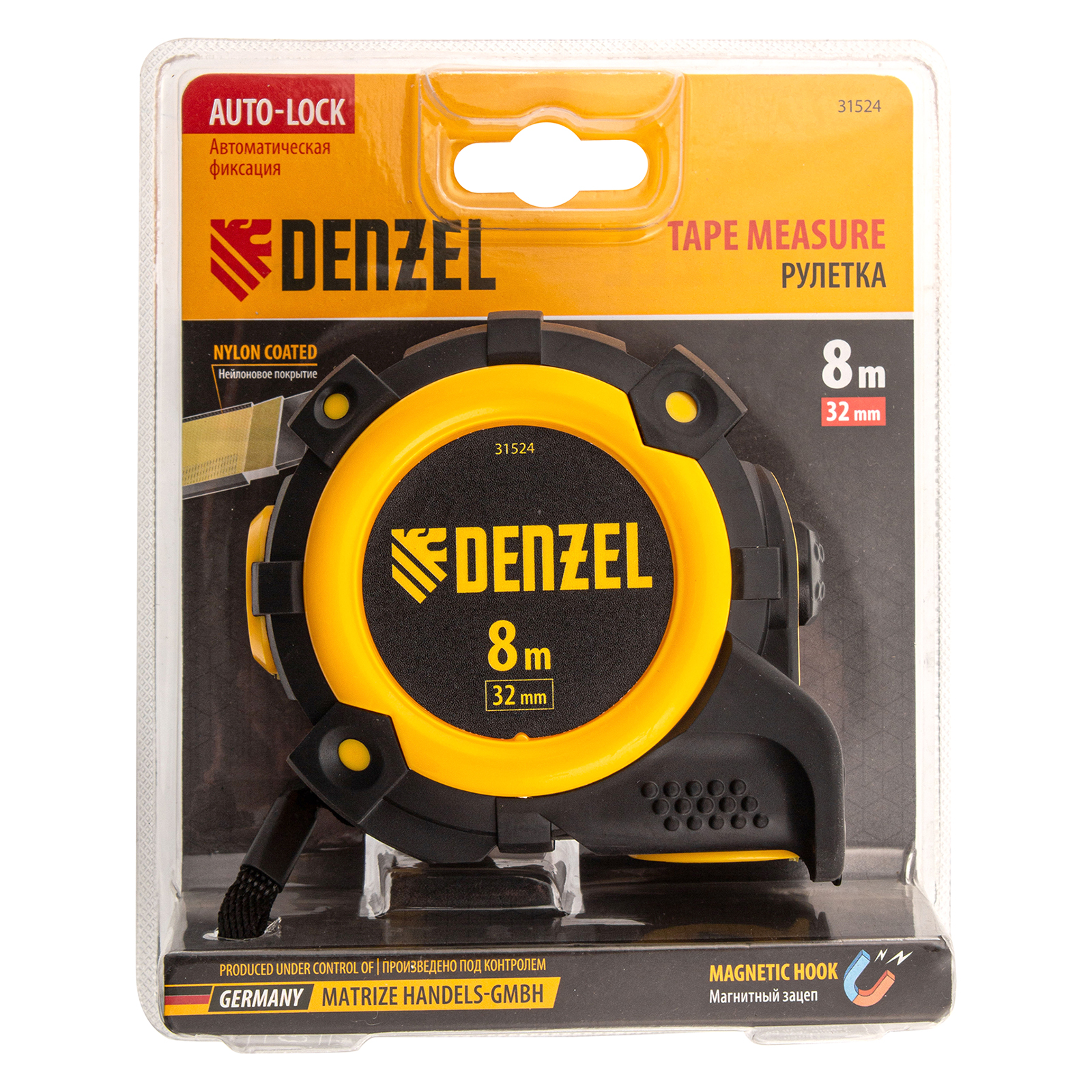 Рулетка 8м х 32мм, автоматич. фиксац., нейлон. покрытие, магнит. зацеп, двухстор. разметка Denzel в Уфе