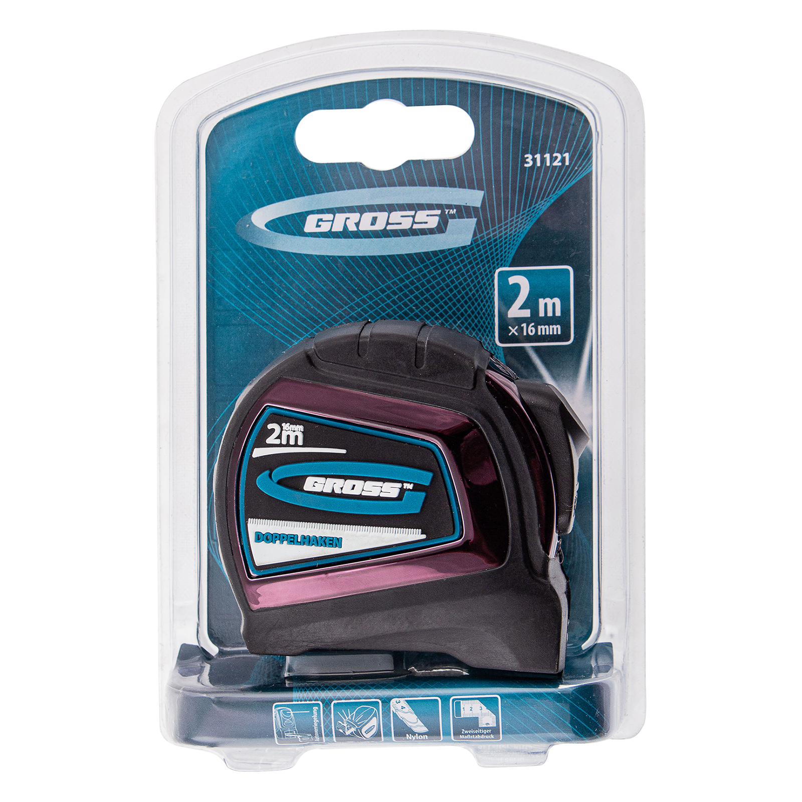 Рулетка "Doppelhaken",2 м x 16 мм,односторонний зацеп,Нейлон,двусторонняя шкала,автоматическая фиксация Gross в Уфе