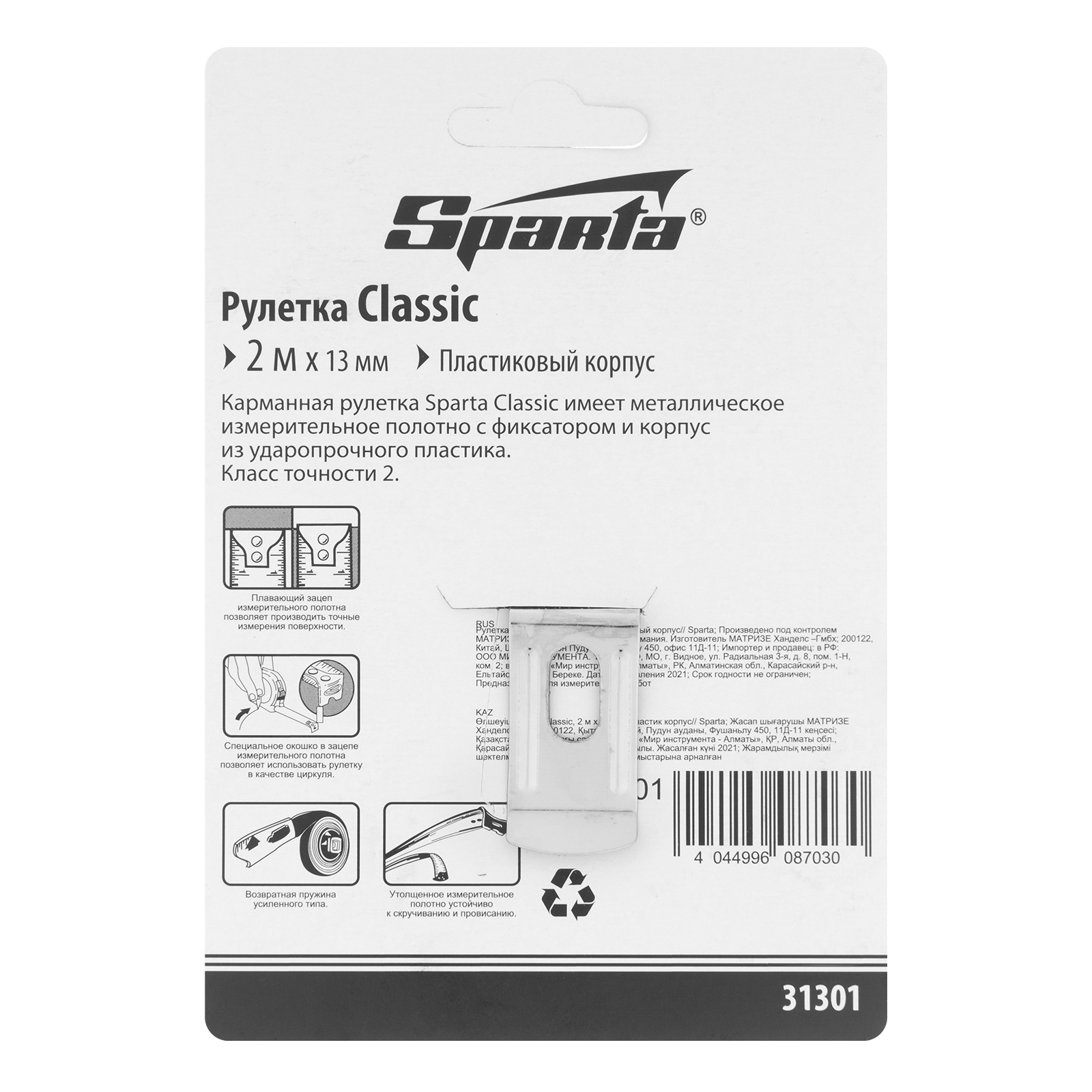 Рулетка Sparta «Classic» 31301 с полотном 2 м х 13 мм, в пластиковом корпусе, станет незаменимым помощником в хозяйстве при измерении длины и ширины деталей, заготовок, материалов, мебели и т.д. Она рассчитана на бытовое использование. За счет специального окошка на зацепе рулетка подходит для применения в качестве циркуля.