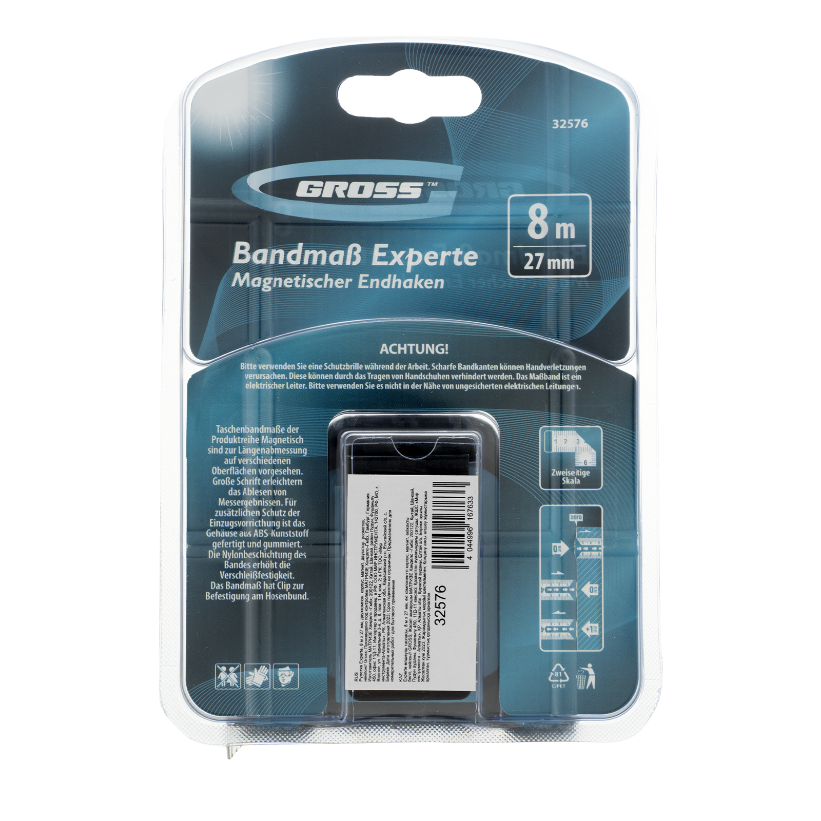 Рулетка Gross «Experte» 32576 с полотном 8 м х 27 мм, в двухкомпонентном корпусе, с двухсторонней разметкой и нейлоновым покрытием ленты, пригодится во время проведения ремонтных и строительных работ. С ее помощью можно измерять заготовки, материалы, конструкции и т.д. Благодаря магнитному зацепу рулетка оптимальна для работы с металлическими поверхностями, а широкое упругое полотно удобно для выполнения измерений в труднодоступных местах.