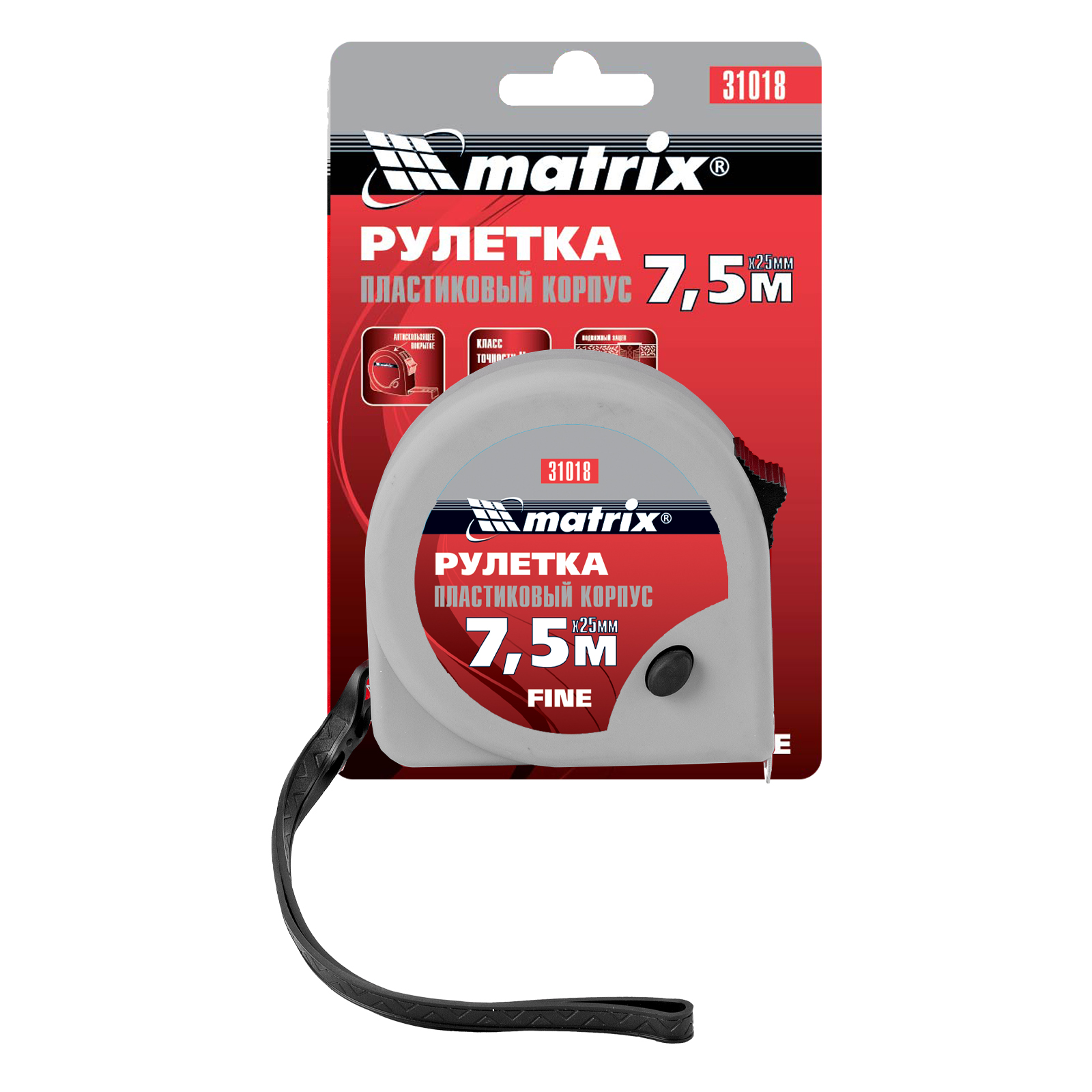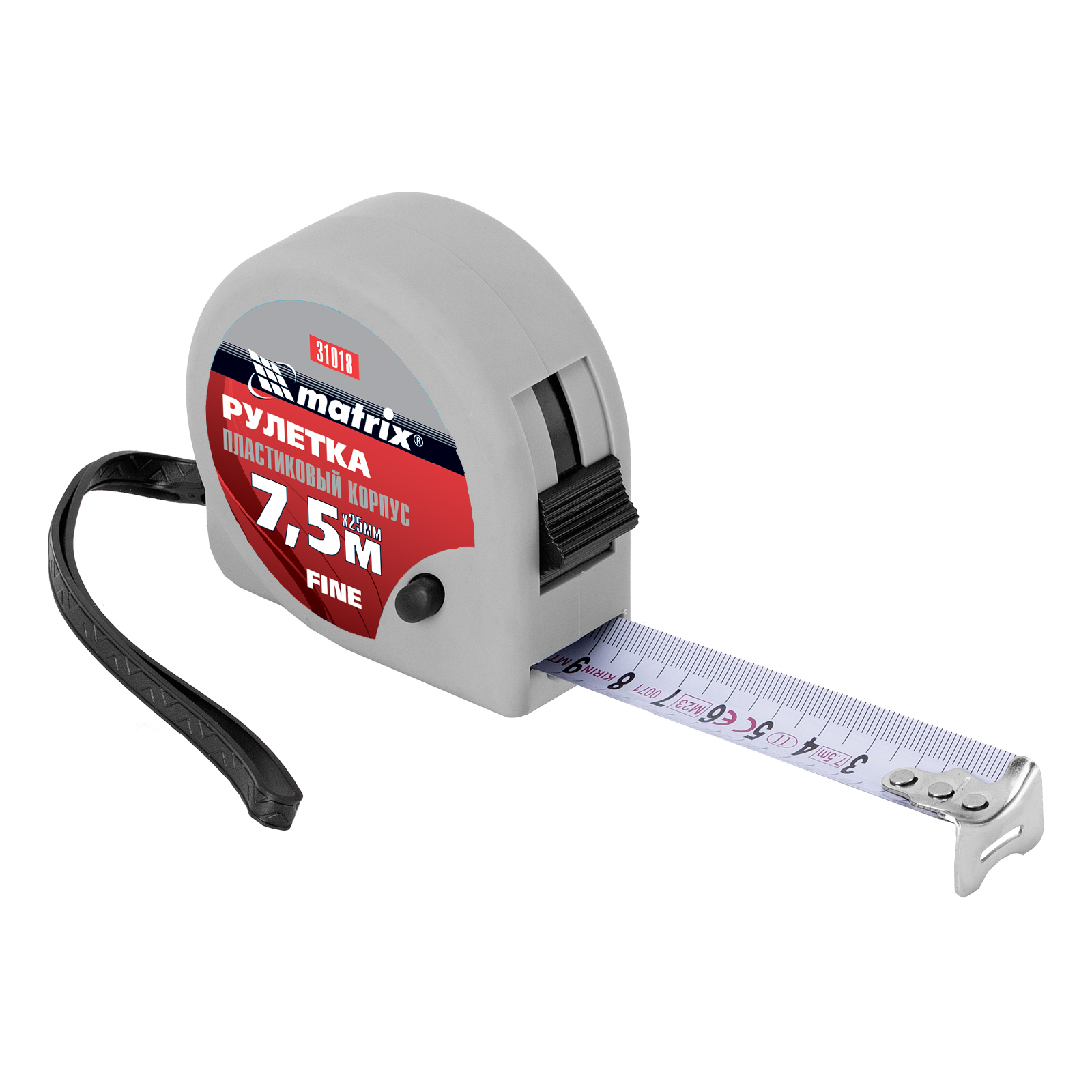 Рулетка Matrix Fine 31018 с лентой длиной 7,5 м и шириной 25 мм, в пластиковом корпусе, используется для замера расстояний и определения размеров различных объектов. Имеет наиболее распространенный класс точности 2, цена деления составляет 1 мм. Стопор и кнопка-пауза для фиксации ленты облегчают проведение измерений. Инструмент применяется как во время строительных работ, так и в быту.