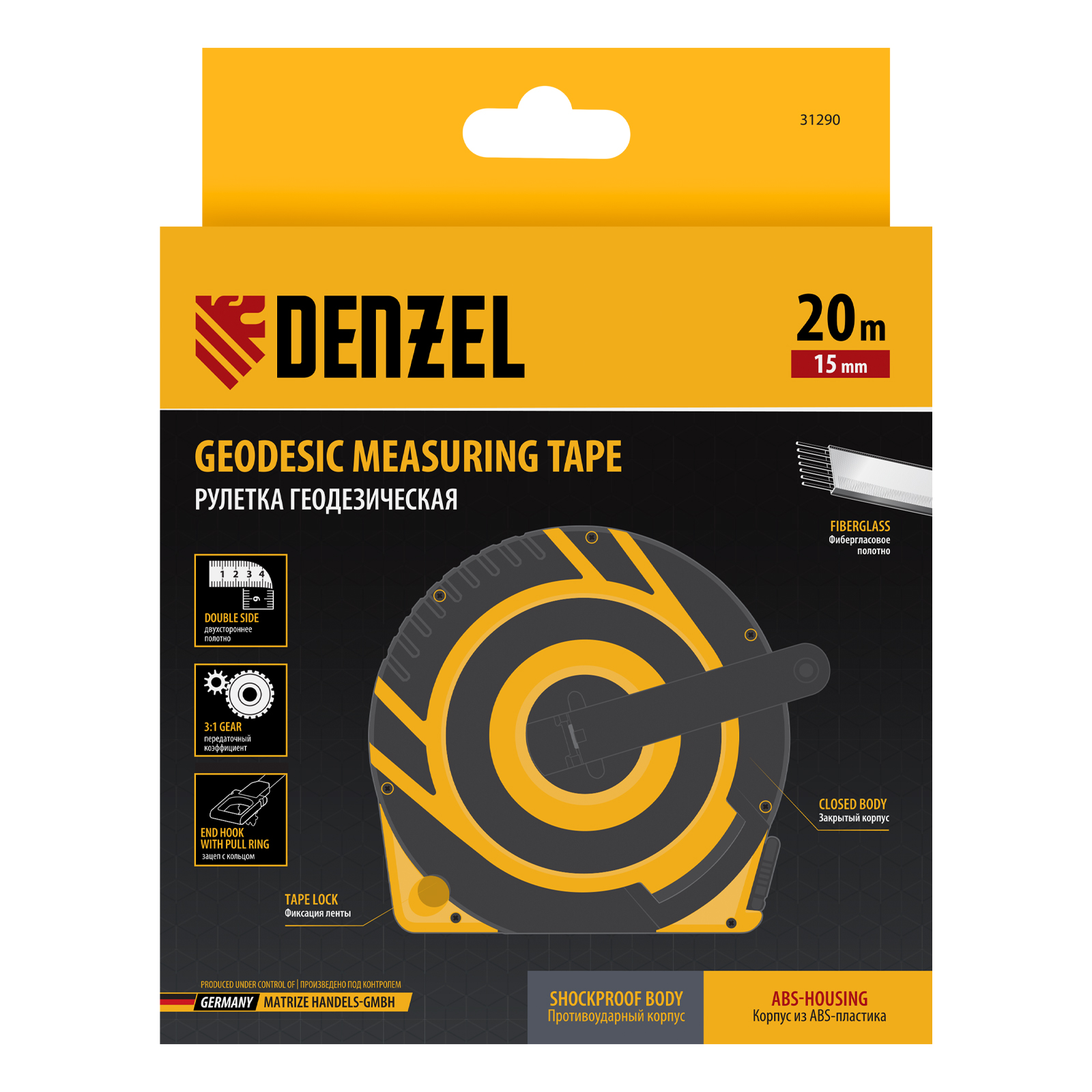 Рулетка геодезическая 20 м х 15 мм, закрытый корпус, фиберглассовая лента Denzel в Уфе