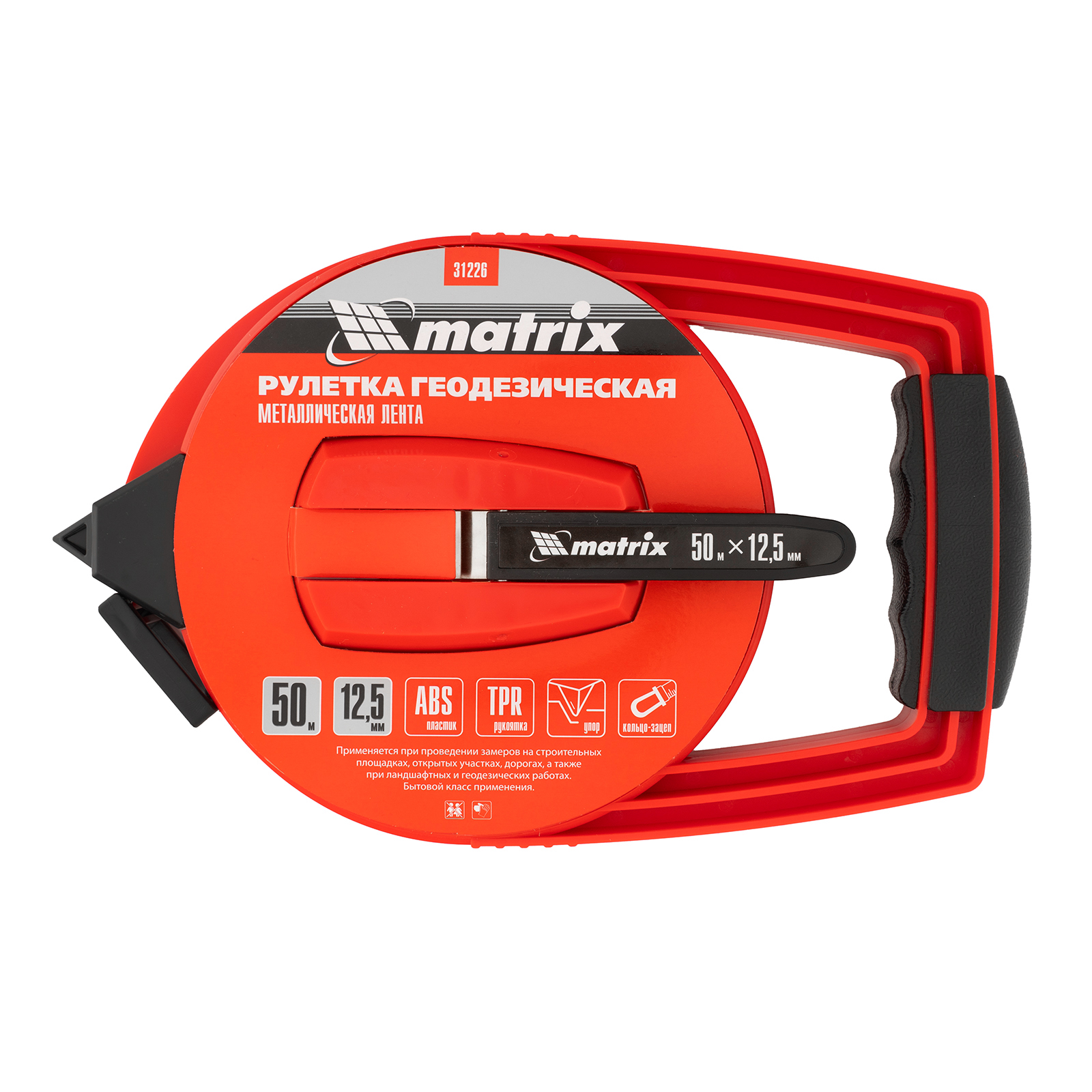 Геодезическая рулетка Matrix 31226 в закрытом корпусе, с металлической лентой размером 50 м х 12,5 мм, применяется для определения расстояний и размеров крупных объектов. Закрытый корпус из ABS-пластика защищает механизм от повреждений. Двухкомпонентная ручка-держатель обеспечивает надежный захват и облегчает работу с рулеткой. Инструмент используется для проведения замеров на открытой местности, дорогах, а также для выполнения ландшафтных работ и картографических обследований.