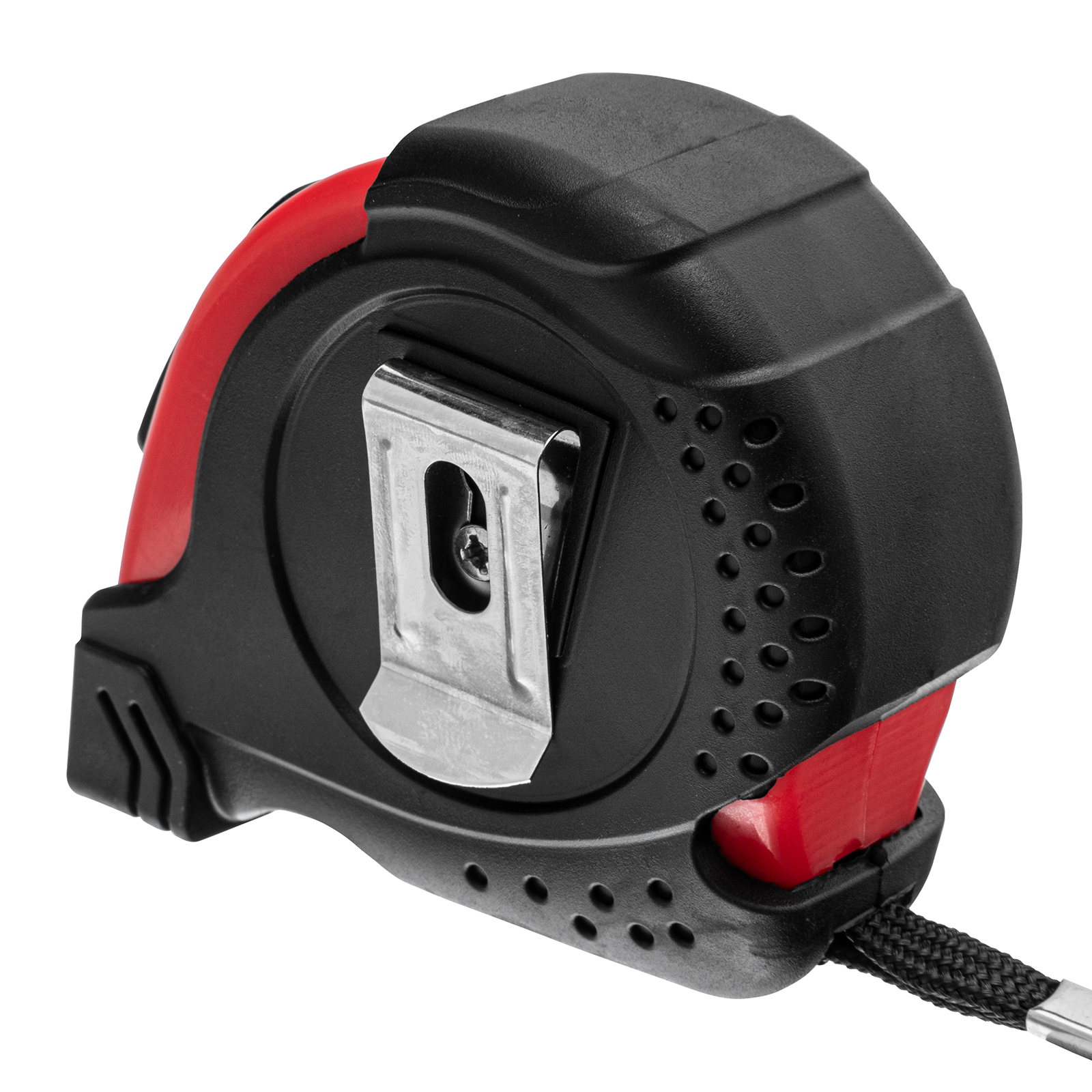 - Дополнительные возможности — шнурок для крепления на запястье уменьшает риск падения рулетки, на боковой поверхности имеется зажим для фиксации рулетки на поясном ремне.