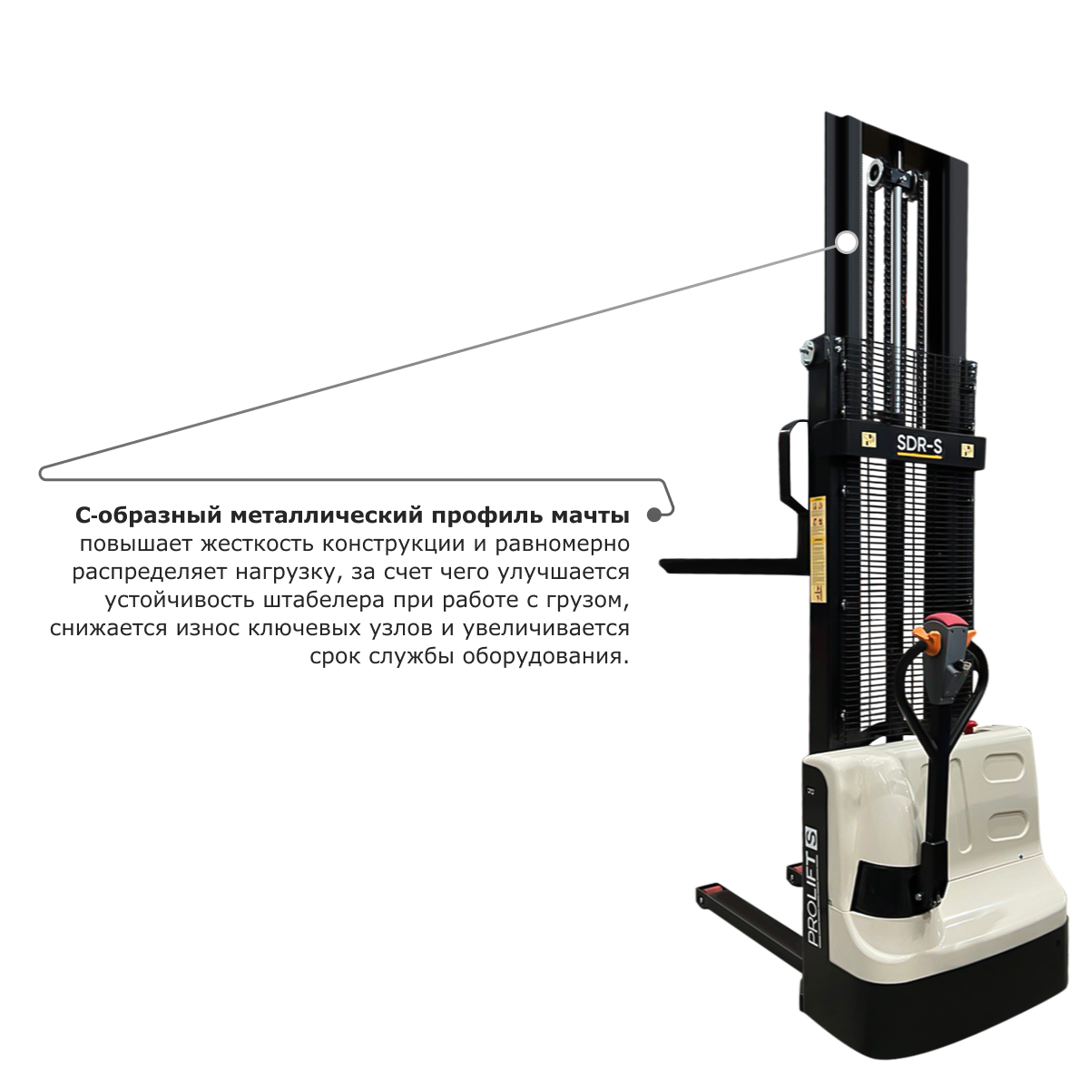 Мачта выполнена из С-образного профиля с дополнительными ребрами жесткости. Благодаря такой конструктивной особенности срок эксплуатации штабелера значительно возрастает. На самоходном штабелере PROLIFT M2 SDR 1516S установлен аккумулятор AGM типа емкостью 85 Ач, рассчитанный на 8 часов интенсивной работы. Встроенный индикатор заряда показывает напряжение АКБ.