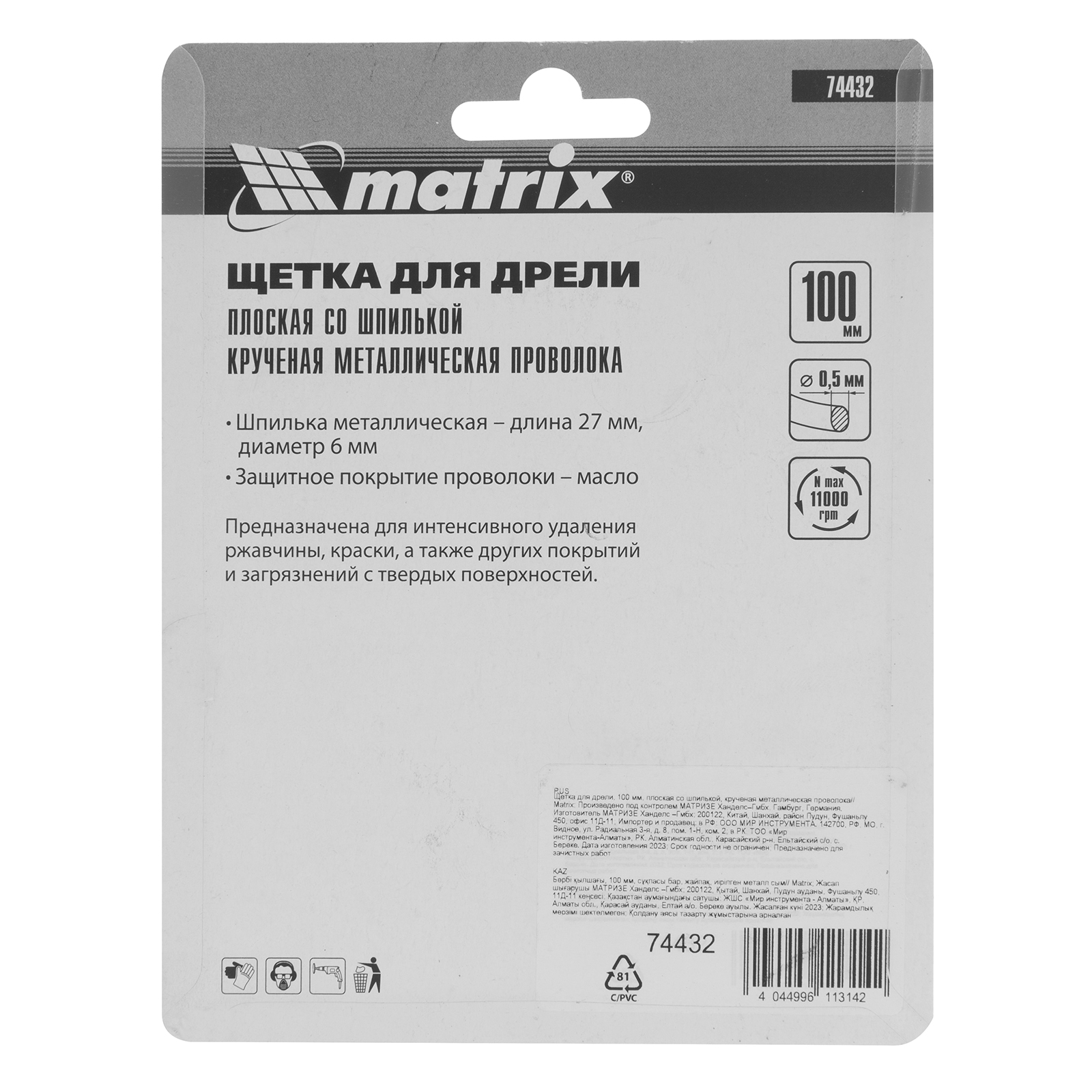 Плоская щетка со шпилькой для дрели Matrix 74432 диаметром 100 мм, с щетиной из крученой металлической проволоки, позволяет быстро очистить металлическую, деревянную или бетонную поверхность от загрязнений, ржавчины, старой краски или лака. Используется для обработки внутренних углов, пазов, изгибов, узких и труднодоступных мест. Подходит для очистки сварных швов. При помощи хвостовика диаметром 6 мм щетку устанавливают в патрон дрели или ПШМ с максимальной частотой вращения до 11000 об/мин. Насадка применяется в строительстве, машиностроении, пригодится также в быту. Во время работы со щеткой следует использовать средства индивидуальной защиты.