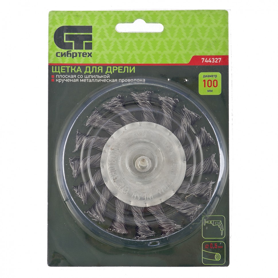 Щетка для дрели, 100 мм, плоская со шпилькой, крученая металлическая проволока Сибртех в Уфе