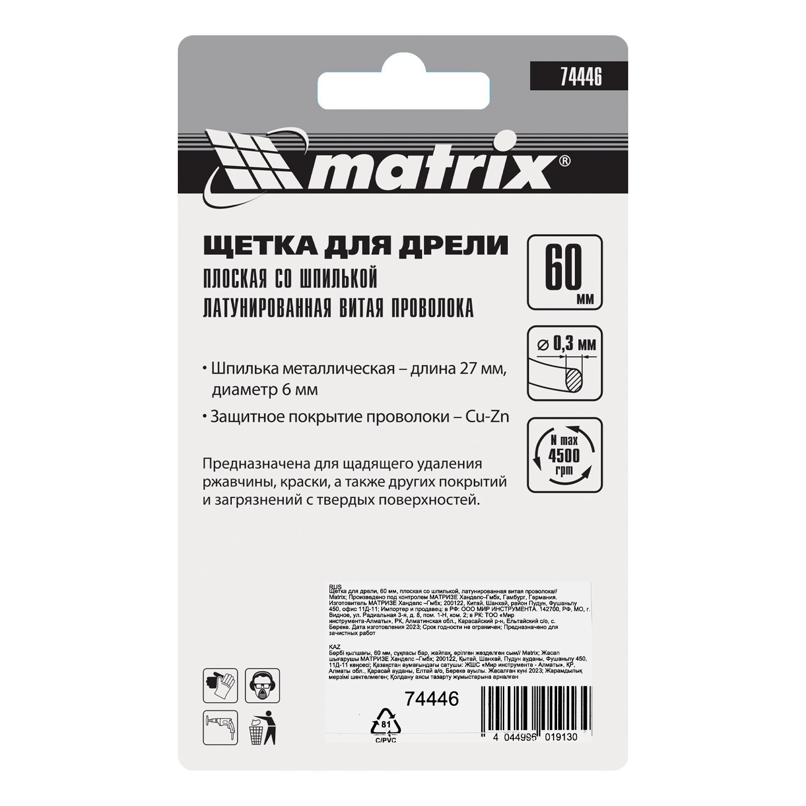 Плоская щетка для дрели Matrix 74446 диаметром 60 мм, со шпилькой и щетиной из латунированной витой проволоки, предназначена для бережной очистки металлических, деревянных, пластиковых поверхностей от загрязнений, старых лакокрасочных материалов и ржавчины. Витая проволока диаметром 0,3 мм проникает в труднодоступные места: пазы, углы, изгибы, узкие участки. Насадку применяют для придания поверхности нужной шероховатости или подчеркивания структуры материала. Хвостовик диаметром 6 мм устанавливается в патрон электродрели, способной работать на рекомендуемой скорости 4500 об/мин. Во время работы следует использовать защитные очки, респиратор, наушники, спецодежду и обувь.