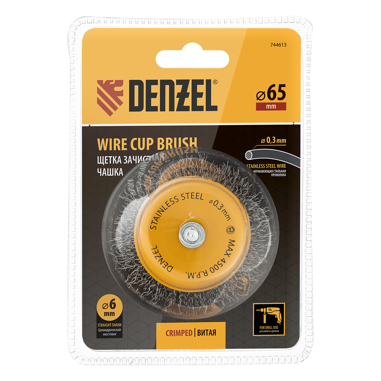 Щетка для дрели, 65 мм, Чашка, со шпилькой , нержавеющая витая проволока Denzel в Уфе