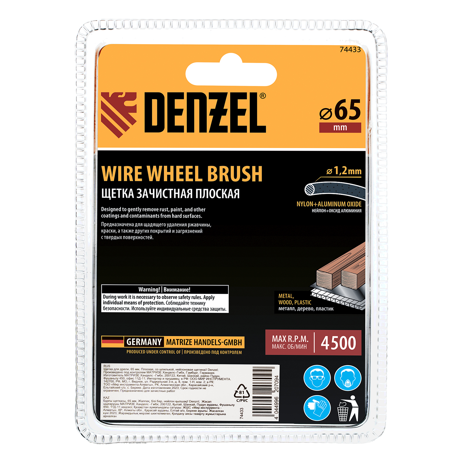 Щетка для дрели, 65 мм, Плоская, со шпилькой, нейлоновая щетина Denzel в Уфе