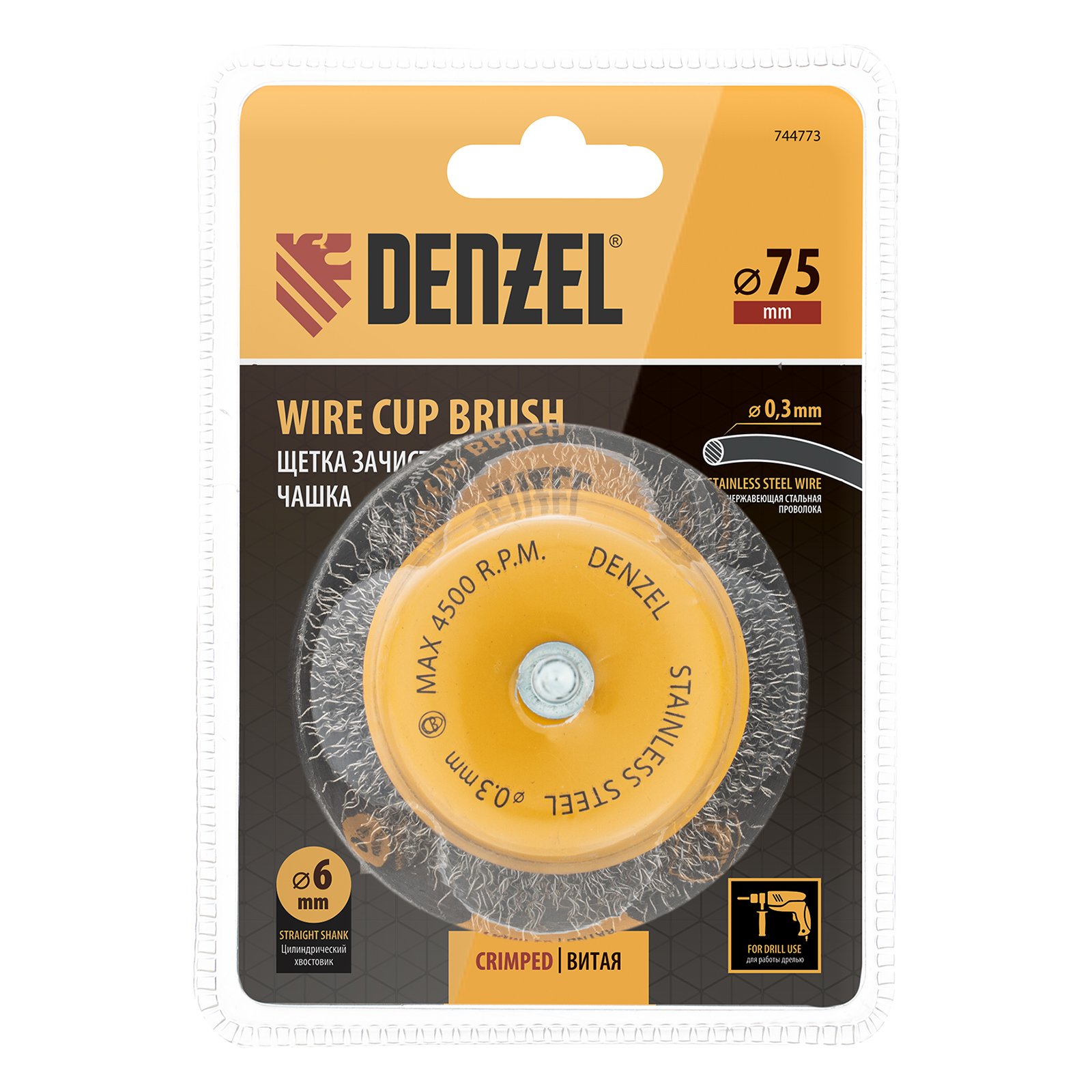Щетка для дрели, 75 мм, Чашка, со шпилькой, нержавеющая витая проволока Denzel в Уфе