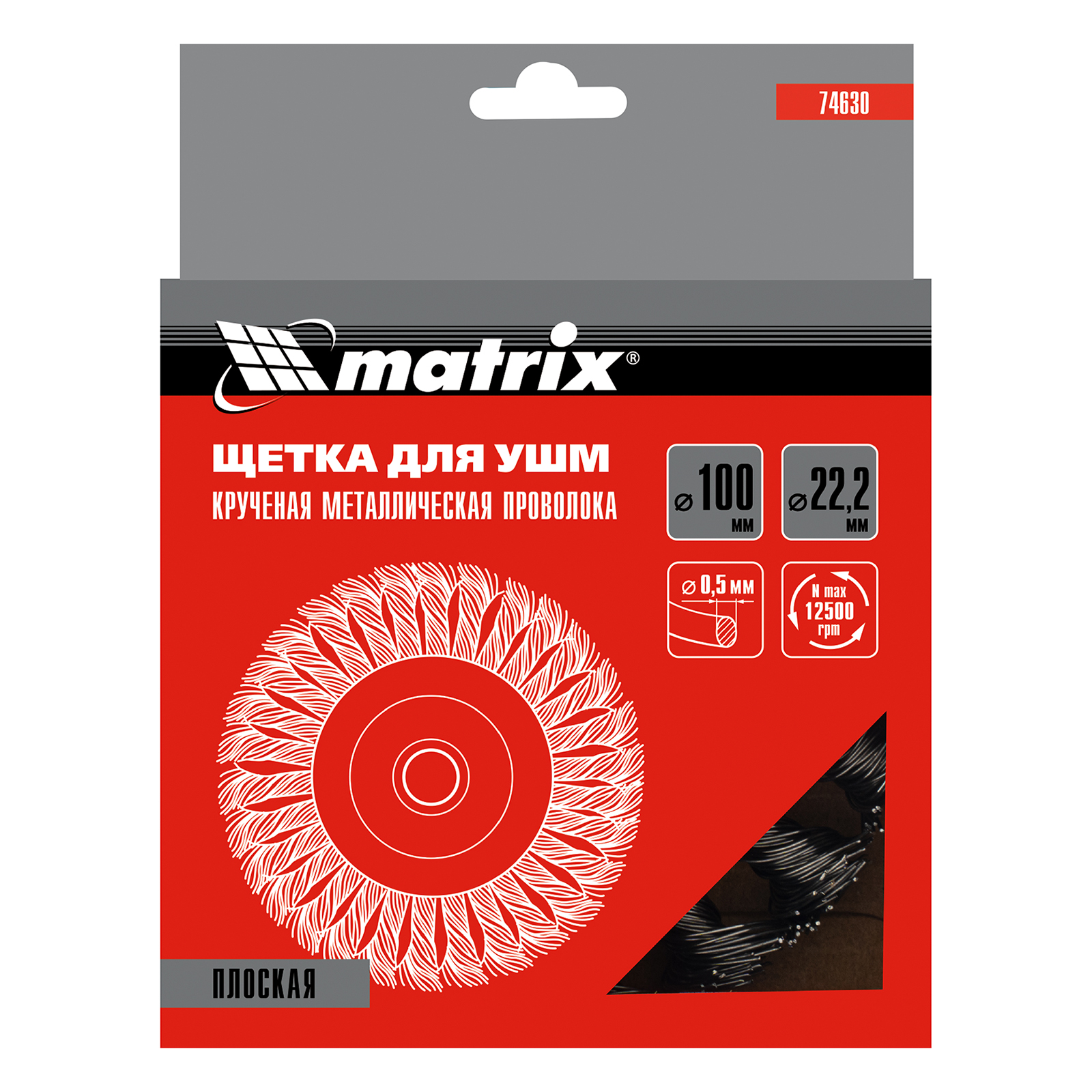Плоская щетка Matrix 74630 диаметром 100 мм и посадкой 22,2 мм, с щетиной из крученой проволоки толщиной 0,5 мм, устанавливается на вал УШМ, поддерживающей скорость вращения не более 12500 об/мин. Эффективно удаляет загрязнения, толстый слой ржавчины и лакокрасочных материалов с поверхностей, поэтому используется для проведения грубой (черновой) обработки. Плоской щеткой удобно очищать труднодоступные места, в том числе углы и изгибы.