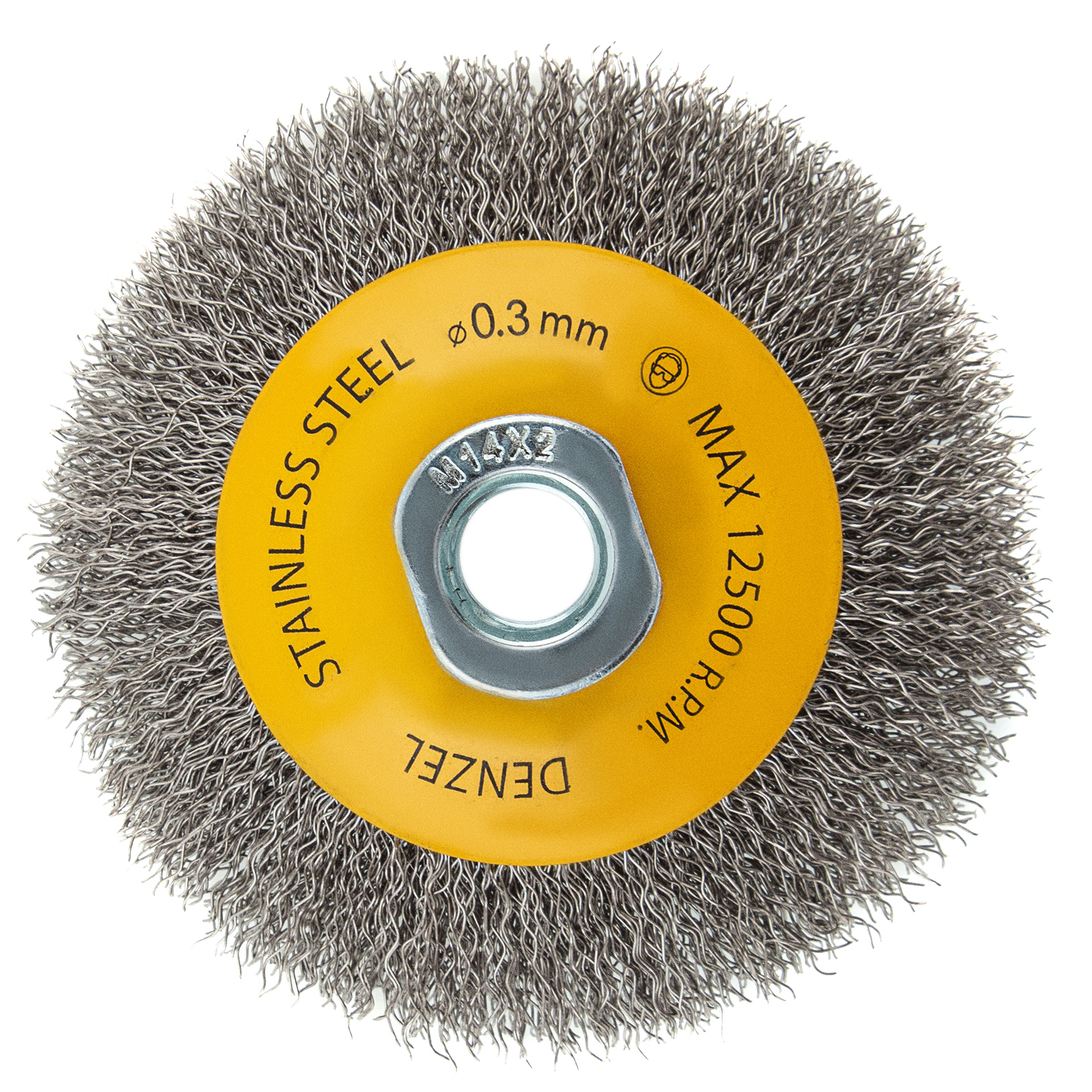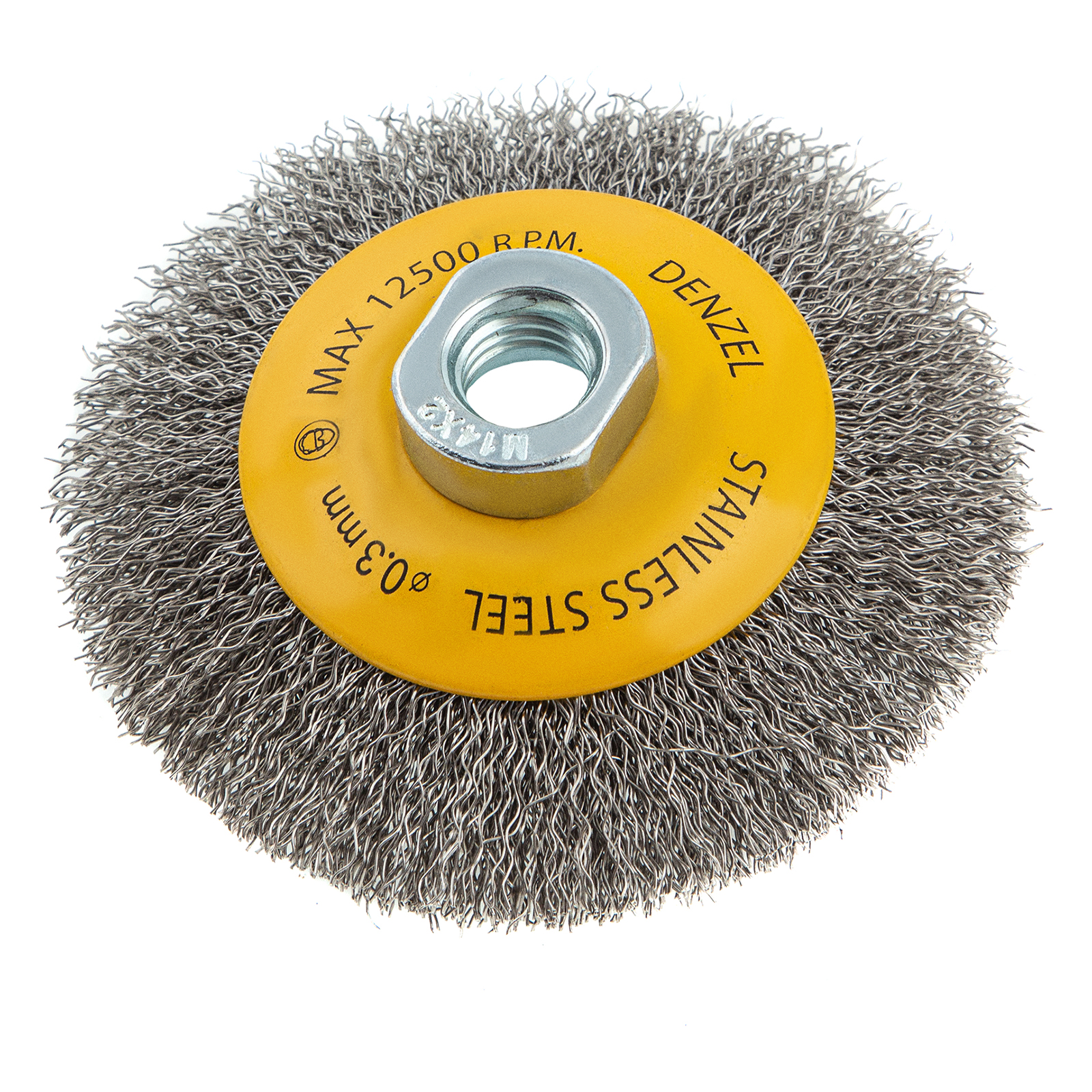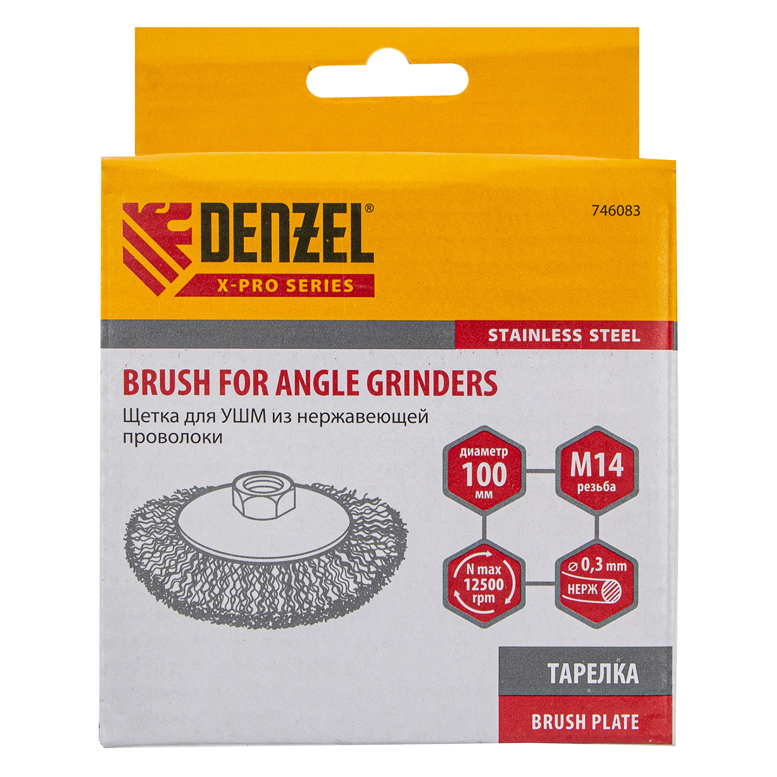 Щетка для УШМ Denzel «Тарелка» 746083 диаметром 100 мм, с присоединительной гайкой M14 и щетиной из витой нержавеющей проволоки диаметром 0,3 мм, используется для щадящей очистки металлических, деревянных или пластиковых поверхностей от незначительных загрязнений и ржавчины, а также остатков лакокрасочных материалов. Поможет придать поверхности шероховатость или матовость. Универсальная насадка подходит для обработки как плоскостей, так и углов, а также других труднодоступных участков. Оптимальна для обработки нержавеющей стали.
