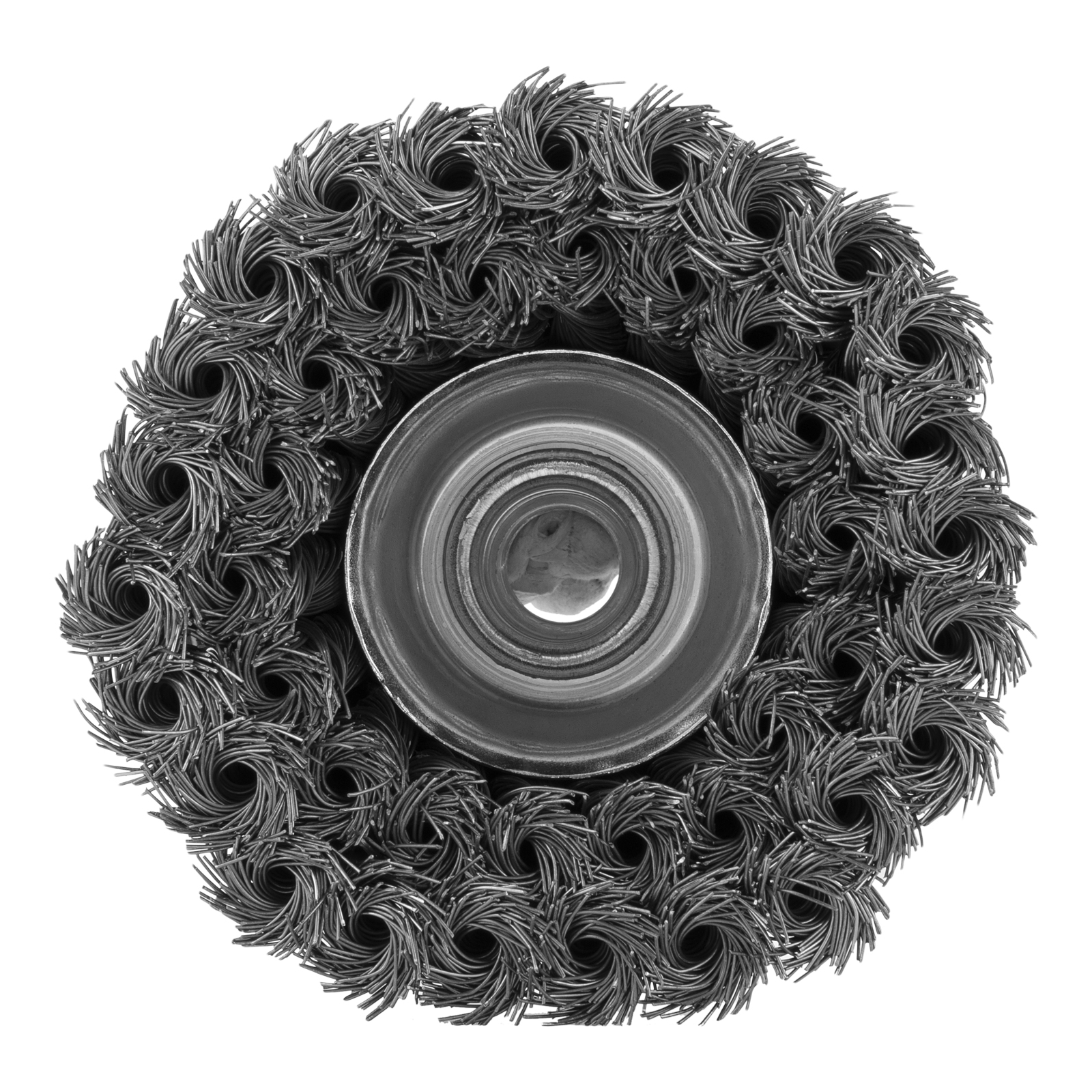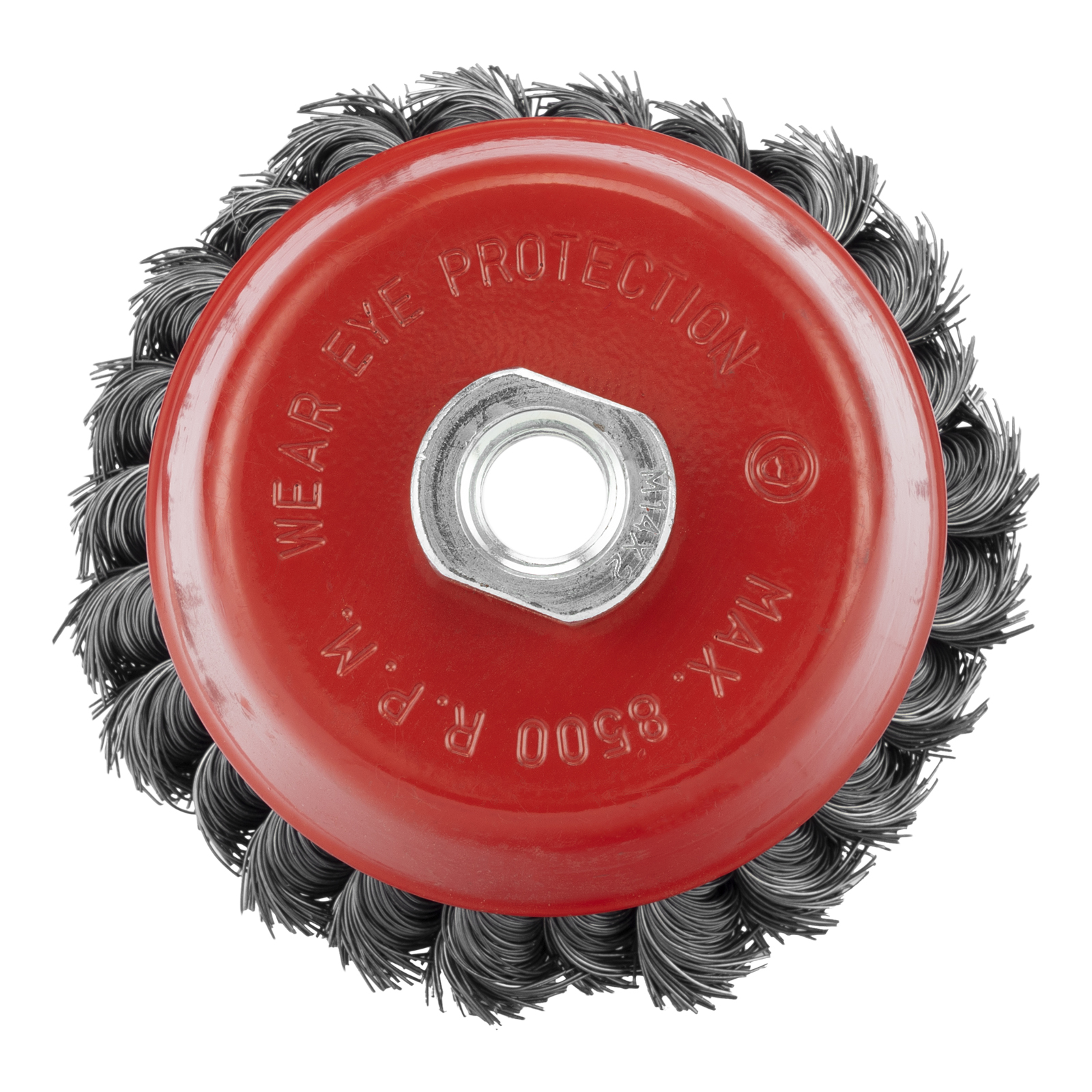 Двухрядная щетка Matrix «Чашка» 74677 диаметром 100 мм, с щетиной из крученой проволоки толщиной 0,35 мм, устанавливается на вал углошлифовальной машины с помощью гайки М14. Рекомендованная максимальная скорость вращения — до 8500 об/мин. Оснастка оптимальна для грубой (черновой) обработки: снятия старого слоя лакокрасочного покрытия и ржавчины, удаления загрязнений, зачистки сварных швов. Эффективно справляется с зачисткой больших поверхностей, подходит для выполнения работ повышенной сложности.