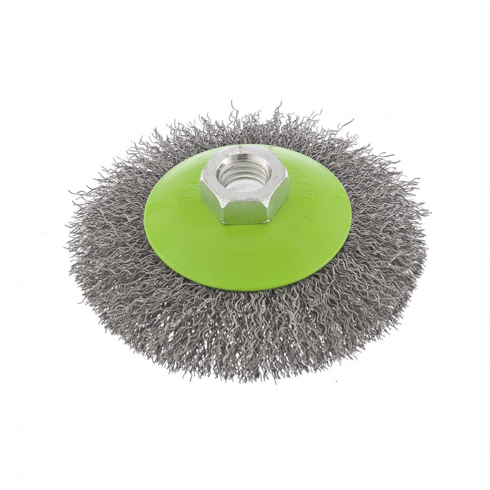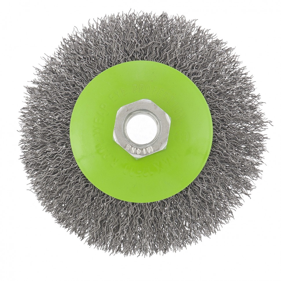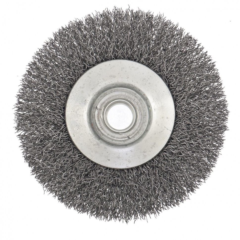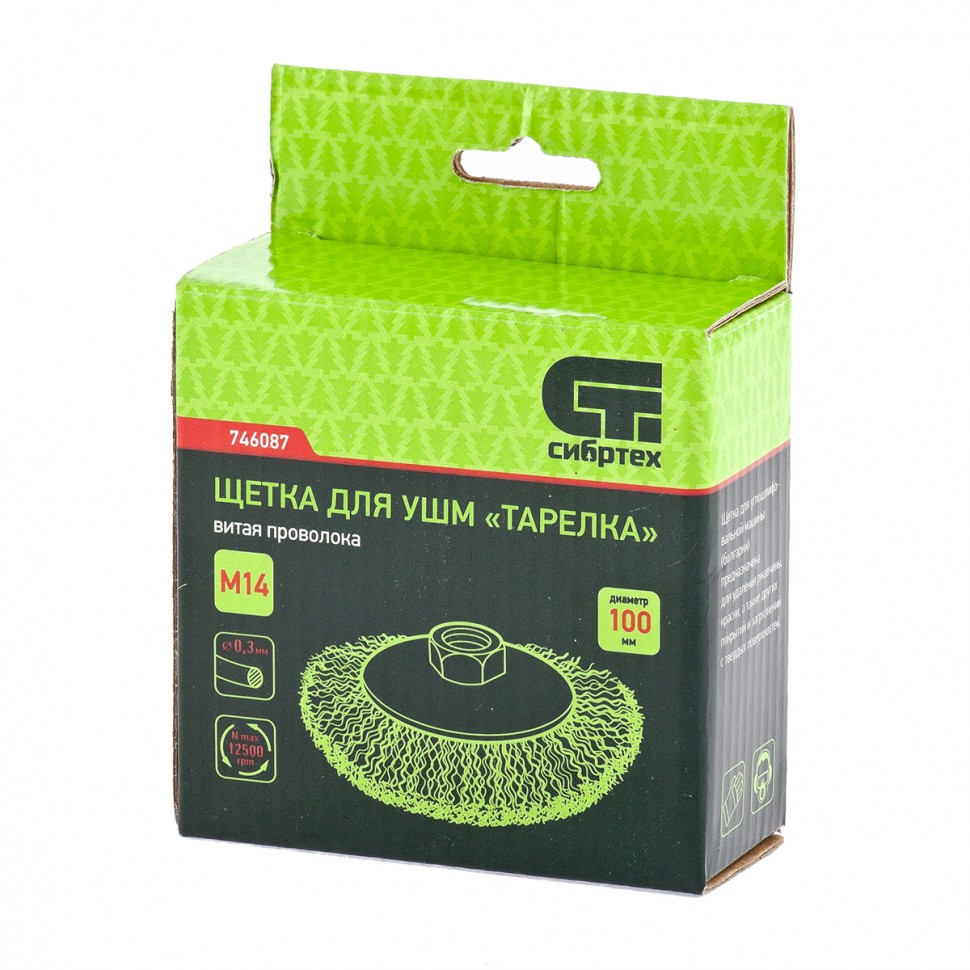 Щетка для УШМ «Тарелка» Сибртех 746087, М14, 100 мм, с щетиной из витой проволоки толщиной 0,3 мм, применяется для очистки металлических, деревянных и пластиковых поверхностей от ржавчины, старых лакокрасочных покрытий и загрязнений. Очищает как плоскости, так и труднодоступные места, поэтому оптимальна для обработки изделий сложной формы. Подходит для придания материалу шероховатости и матовости. Щетка устанавливается на вал углошлифовальной машины и выдерживает вращение со скоростью до 12500 об/мин, что обеспечивает высокую производительность оснастки. Во время работы следует использовать средства индивидуальной защиты. Щетка пригодится для проведения ремонта и решения бытовых задач.