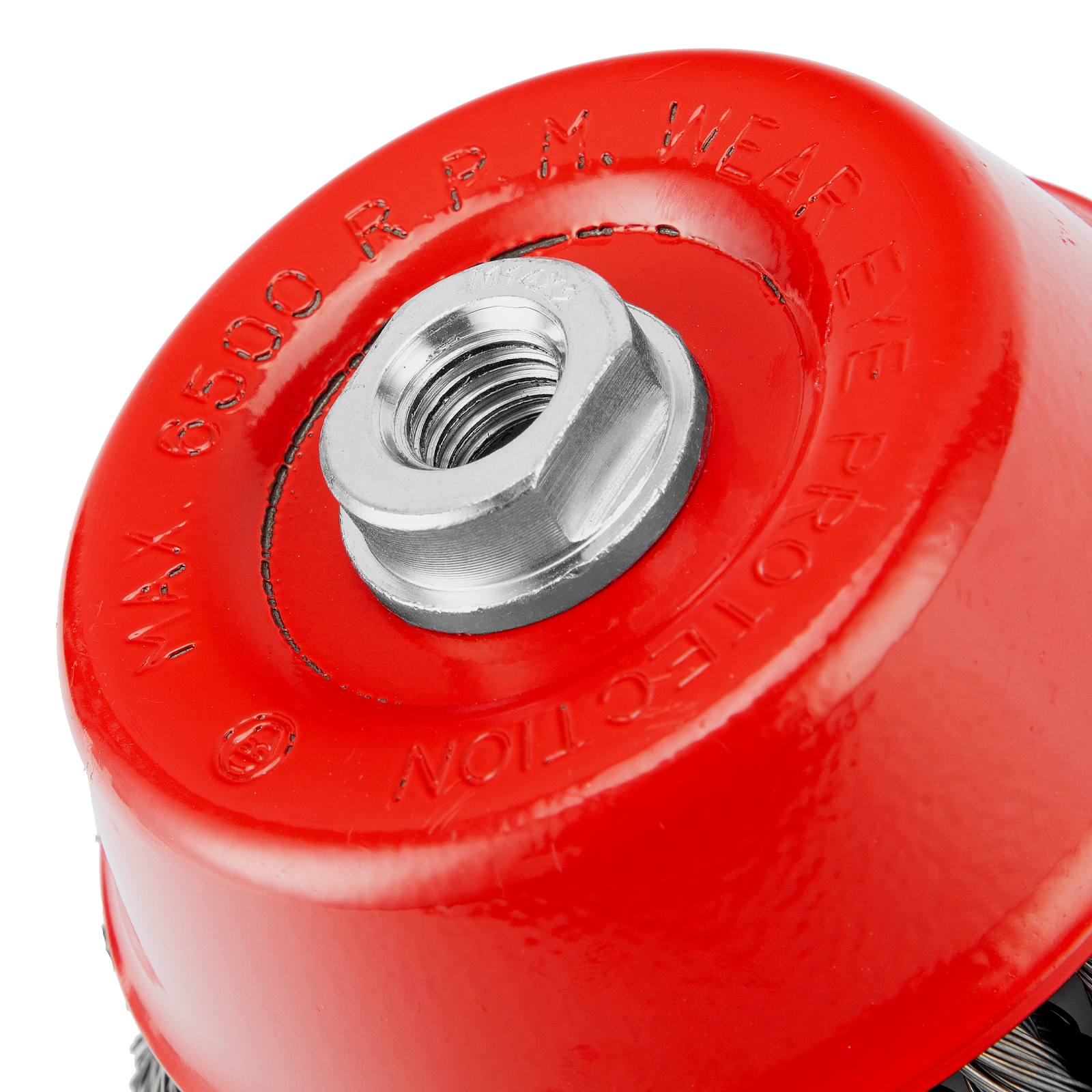 Двухрядная щетка Matrix «Чашка» 74683 диаметром 125 мм, с щетиной из крученой проволоки толщиной 0,5 мм, устанавливается на вал углошлифовальной машины с помощью гайки М14. Рекомендованная максимальная скорость вращения — до 6500 об/мин. Оснастка оптимальна для грубой (черновой) обработки: снятия старого слоя лакокрасочного покрытия и ржавчины, удаления загрязнений, зачистки сварных швов. Эффективно справляется с зачисткой больших поверхностей, подходит для выполнения работ повышенной сложности.