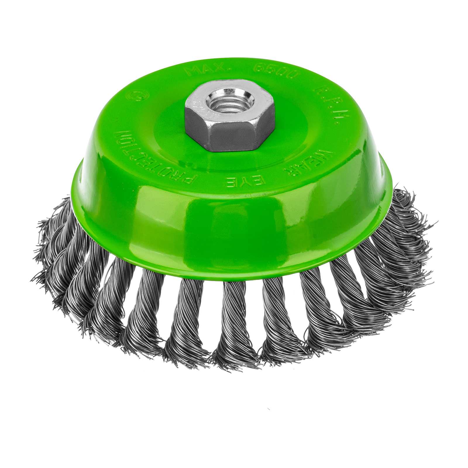 Щетка Сибртех «Чашка» 746277 диаметром 125 мм, с присоединительной резьбой М14, с щетиной из крученой проволоки диаметром 0,5 мм, устанавливается на УШМ, поддерживающую работу со скоростью 6500 об/мин. Изделие предназначено для грубой (черновой) обработки поверхностей и подходит для удаления загрязнений, снятия толстого слоя ржавчины, ЛКМ, зачистки сварных швов.