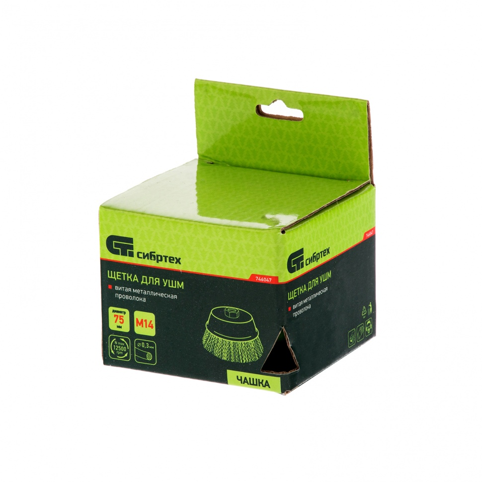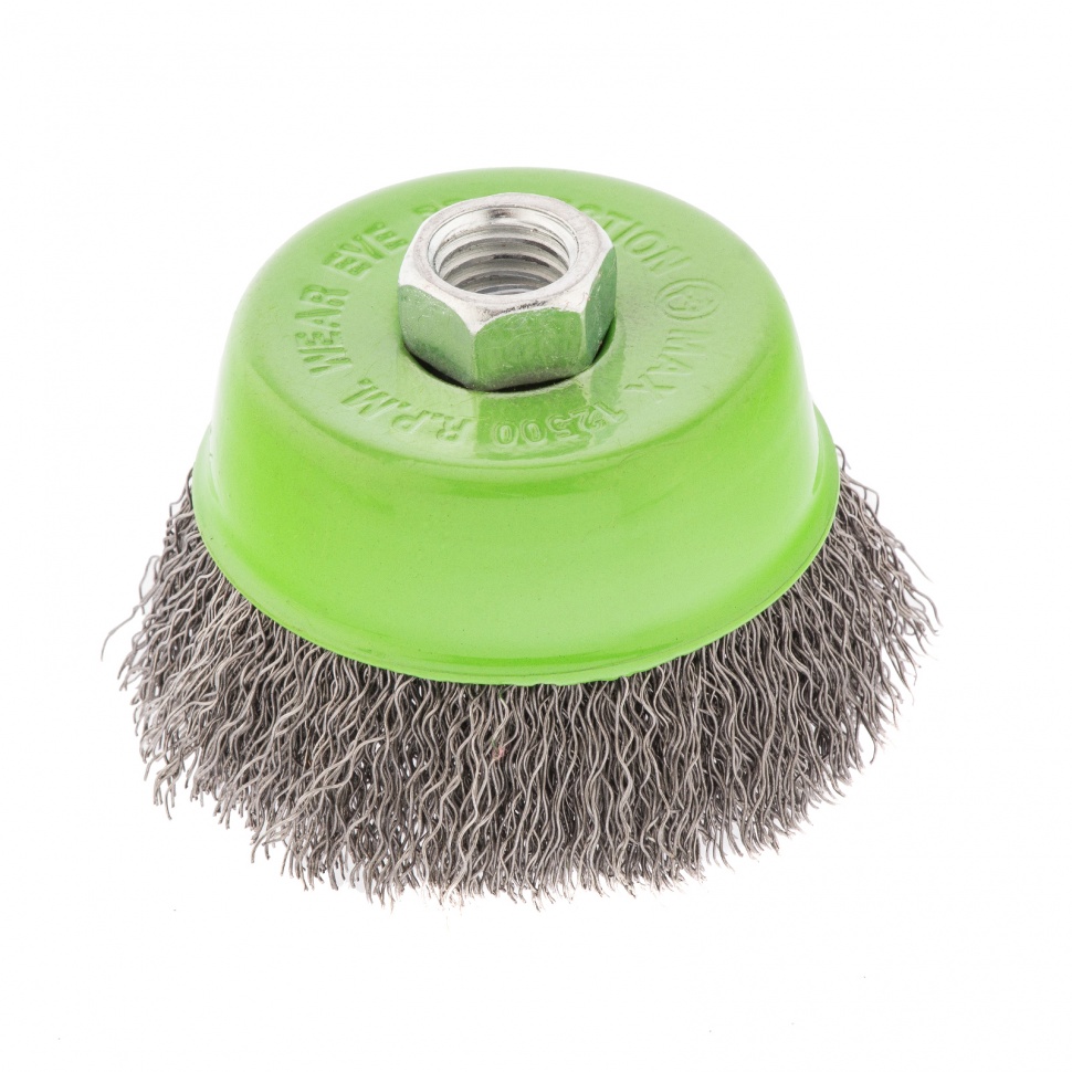 Щетка для УШМ Сибртех «чашка» 746047, М14, диаметром 75 мм, с щетиной из витой проволоки 0,3 мм, предназначена для постепенного снятия тонкого слоя материала с металлических, деревянных и пластиковых поверхностей. Удаляет ржавчину, загрязнения, а также остатки краски и других покрытий. Подходит для обработки участков значительной площади. Щетку устанавливают на вал углошлифовальной машины (УШМ), рекомендуемая максимальная скорость вращения 12500 об/мин. Работать с оснасткой следует в спецодежде.