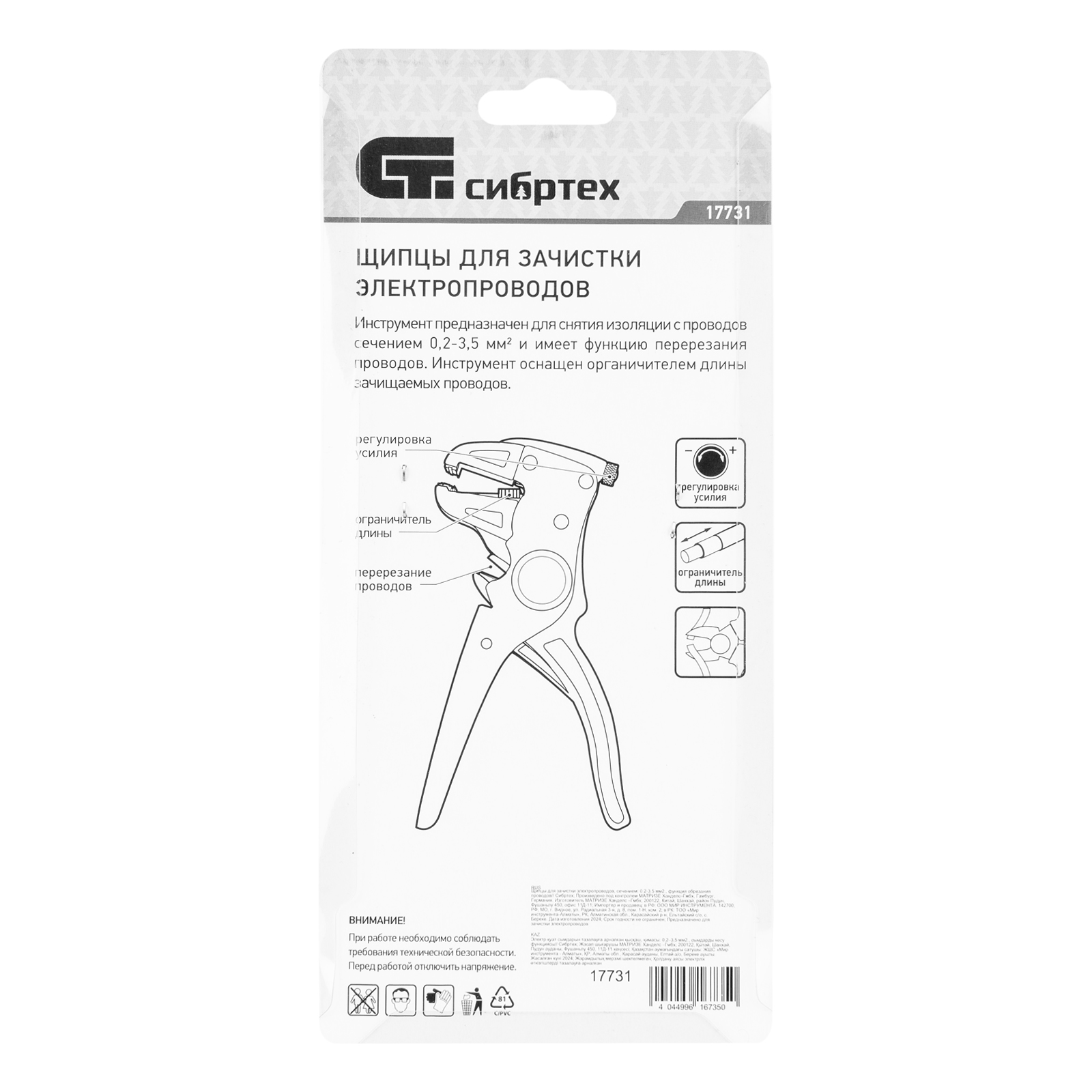 Щипцы Сибртех 17731 рассчитаны на зачистку и снятие изоляции с электропроводов сечением 0,2-3,5 мм2, а также они оснащены кусачками для обрезания кабеля. Инструмент станет незаменимым помощником в квартире, гараже, на даче, производстве, строительной площадке во время выполнения электромонтажных работ.