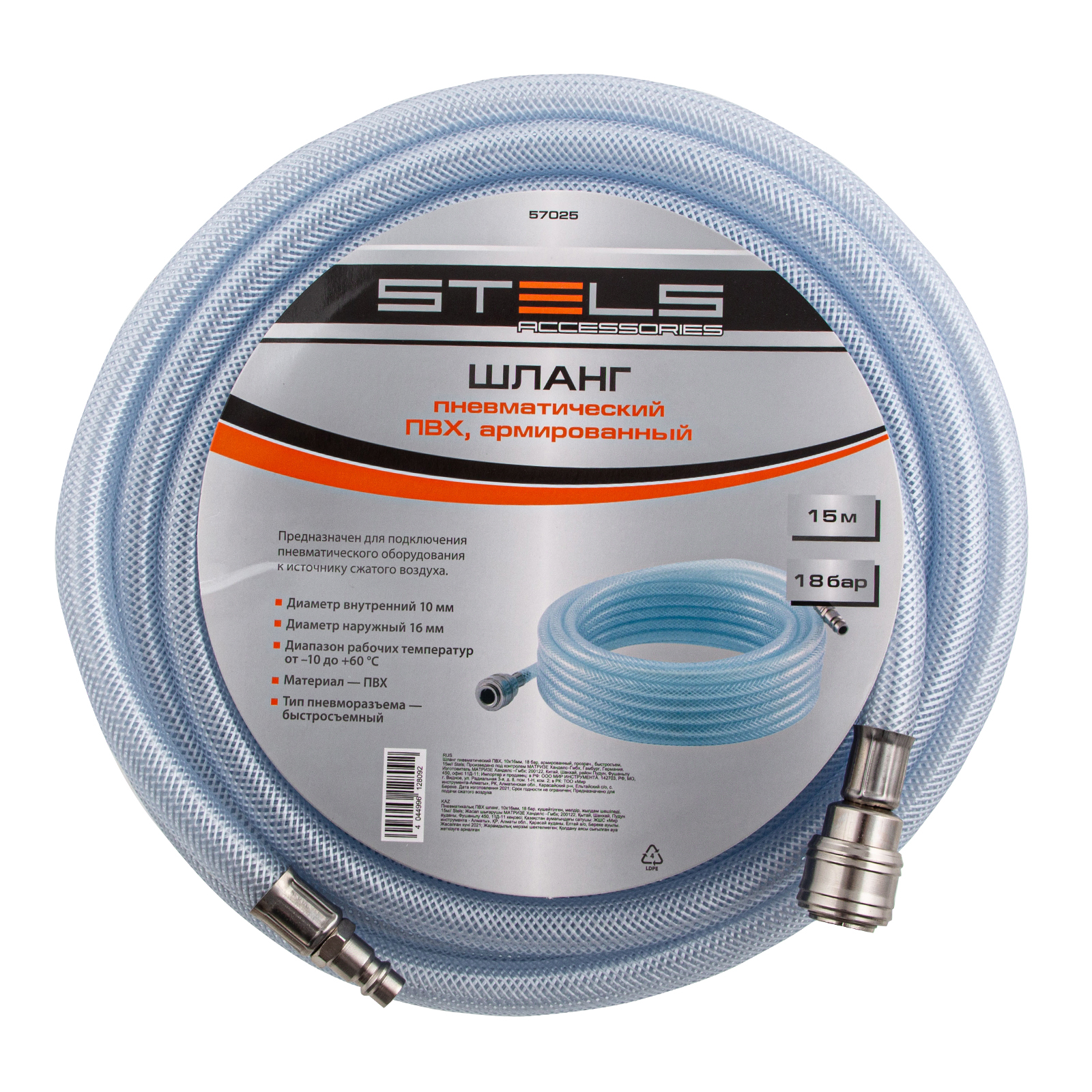 Шланг пневматический ПВХ, 10 x 16 мм, 18 бар, армированный, прозрачный, быстросъемное соединение, 15 м Stels в Уфе