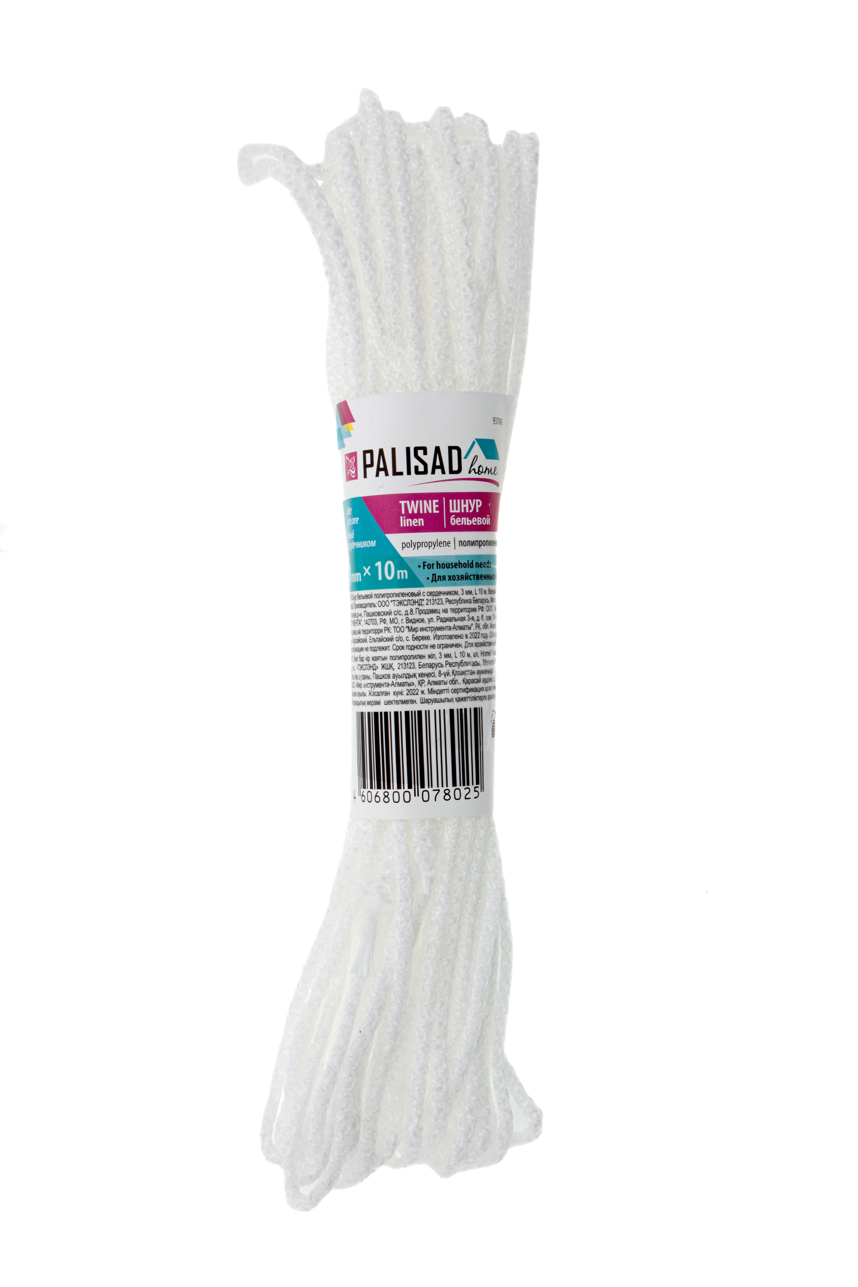 Белый полипропиленовый бельевой шнур Palisad Home 937045 с сердечником, диаметром 3 мм и длиной 10 м, используется для сушки белья, а также в качестве хозяйственной веревки в быту, на рыбалке или в походе. От обычной бельевой веревки для сушки он отличается сердечником из полипропилена, увеличивающим стойкость к нагрузкам. Шнур с полипропиленовой оплеткой выдерживает разрывную нагрузку до 30 кгс, устойчив к растяжению и не провисает под весом мокрых вещей.
