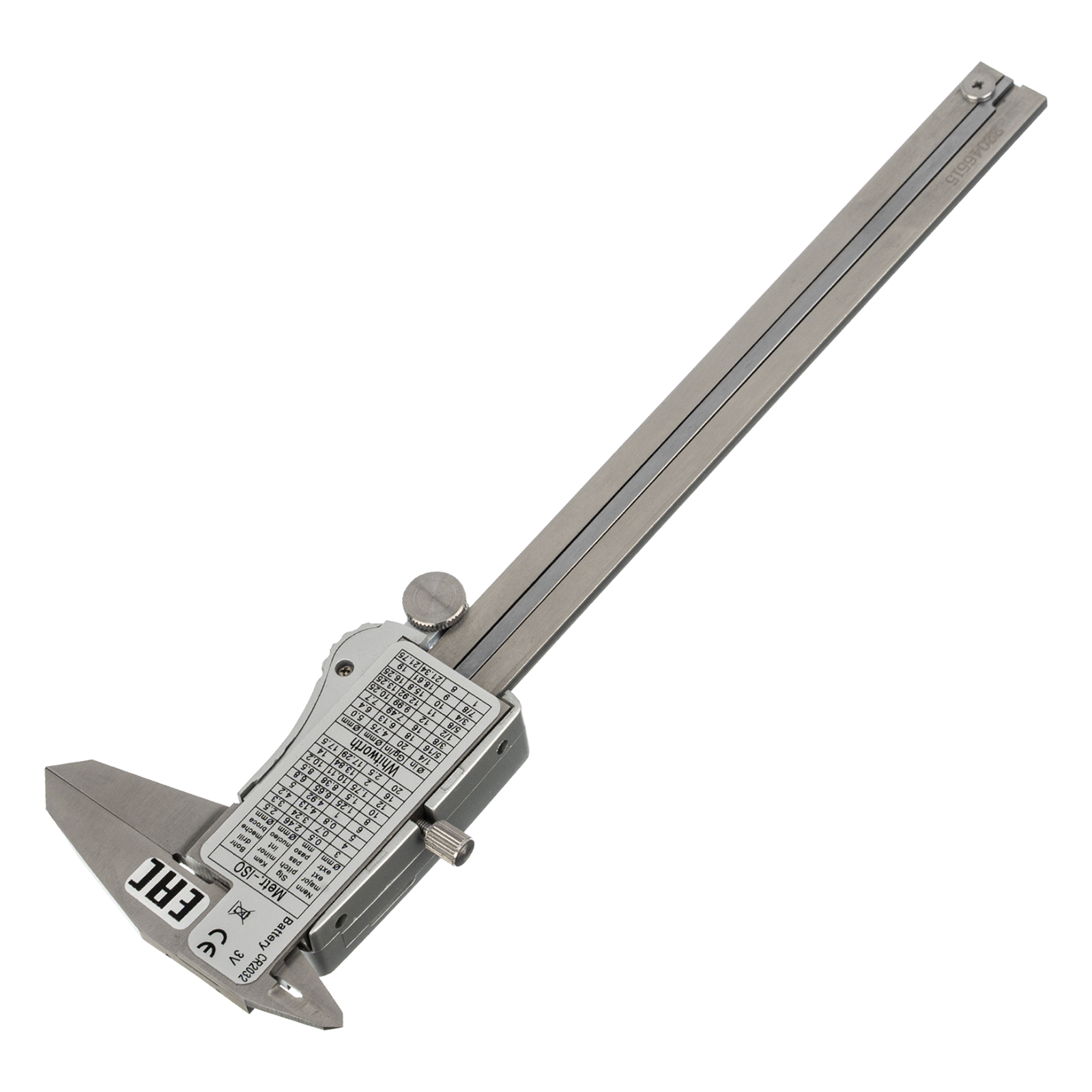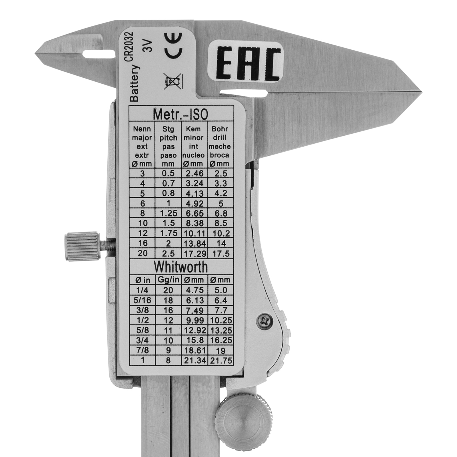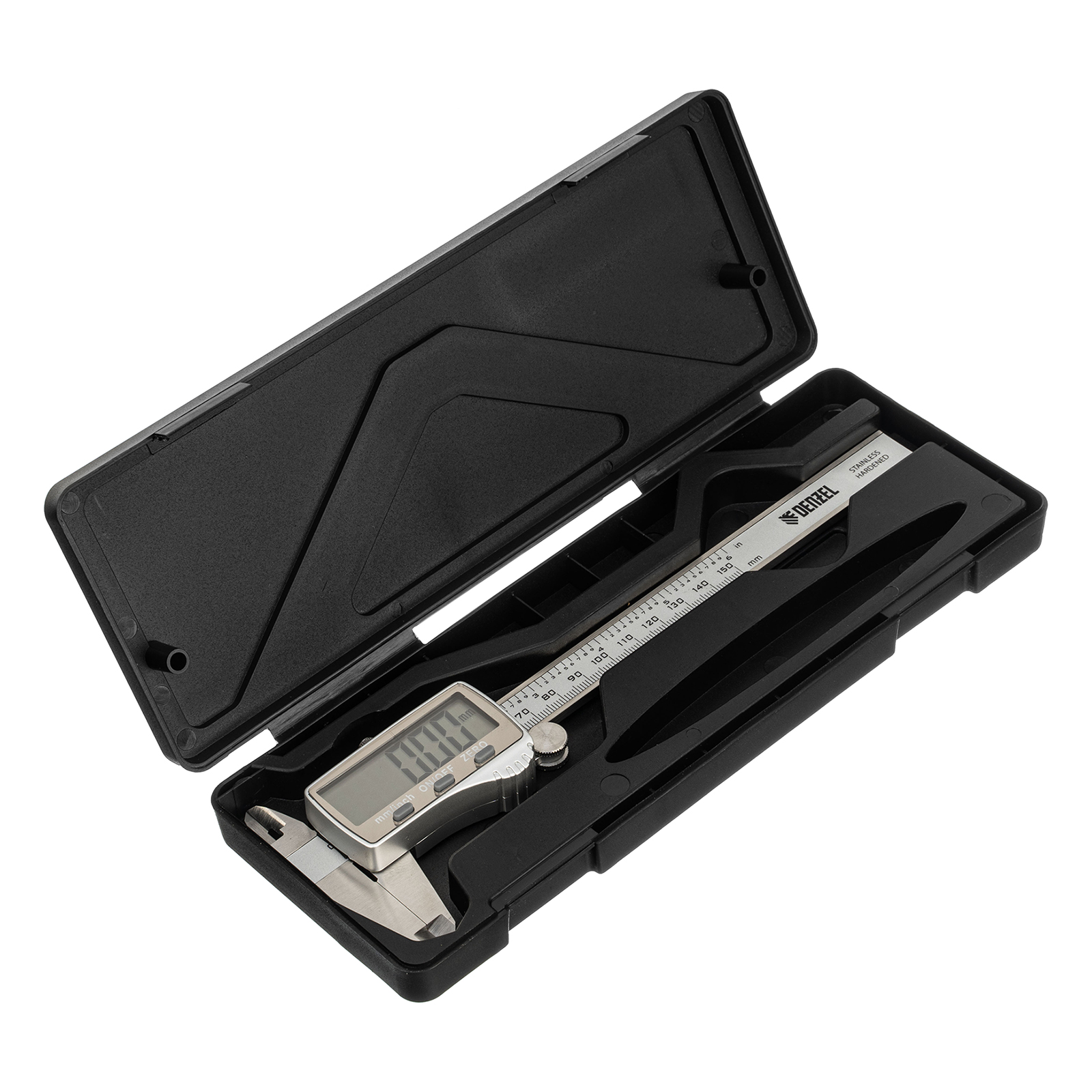 Электронный штангенциркуль Denzel 31614 со шкалой длиной 150 мм, с большим дисплеем и глубиномером, позволяет определять внутренние и внешние размеры различных деталей. Цена деления составляет 0,01 мм. Штангенциркуль позволяет получать результаты высокой точности: погрешность составляет ±0,02 мм при измерении размеров до 100 мм, и ±0,03 мм — до 150 мм. Двустороннее положение губок облегчает проведение работ. Инструмент пригодится на производстве, в мастерской, гараже, а также будет полезен в быту.