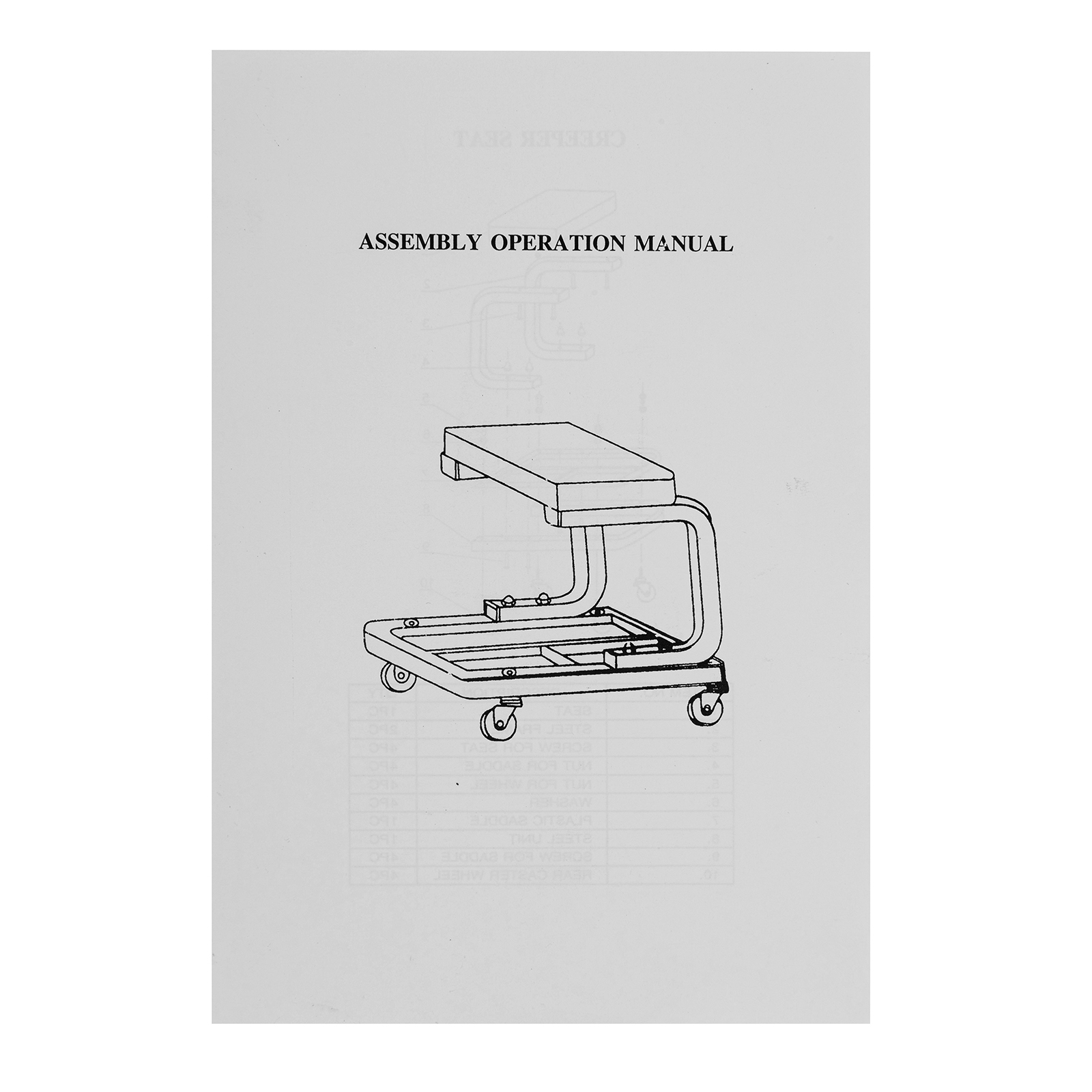 Сиденье - 1 штСтальной каркас - 1 штВинт - 1 штГайка для сиденья - 1 штГайка для колес - 1 штШайба - 1 штПластмассовый поддон - 1 штРама - 1 штВинт - 1 штКолеса - 1 штПластины - 1 шт |
