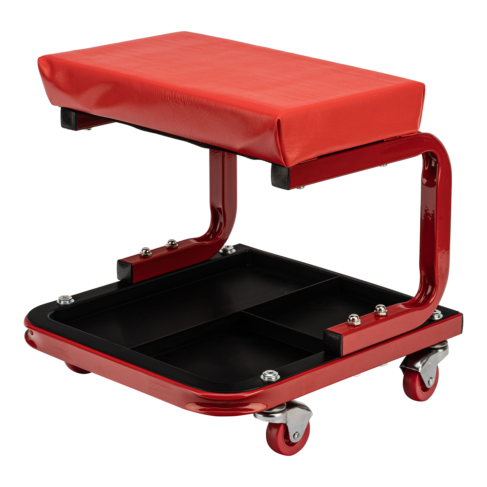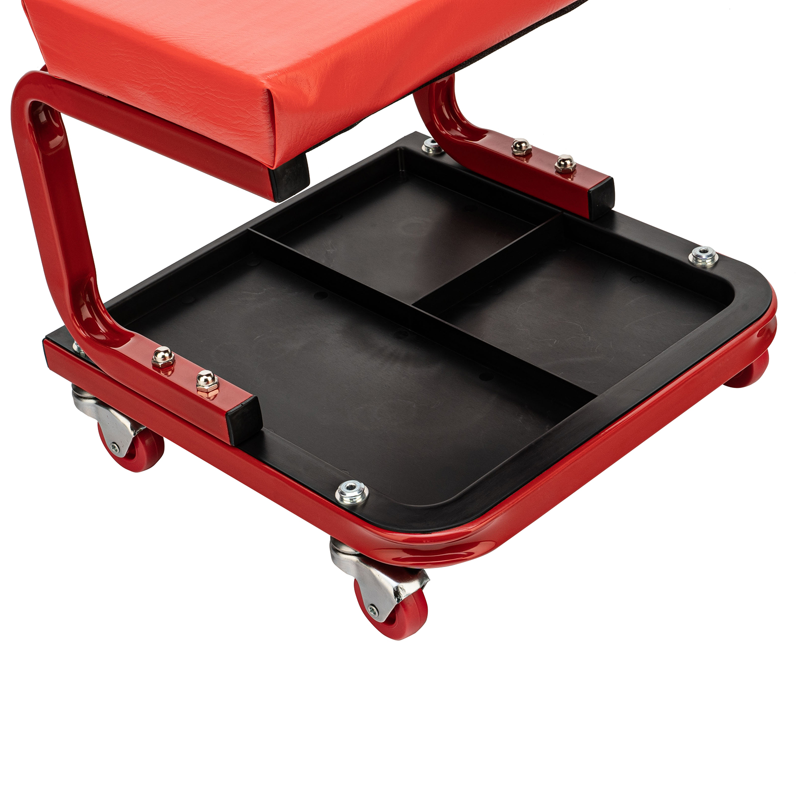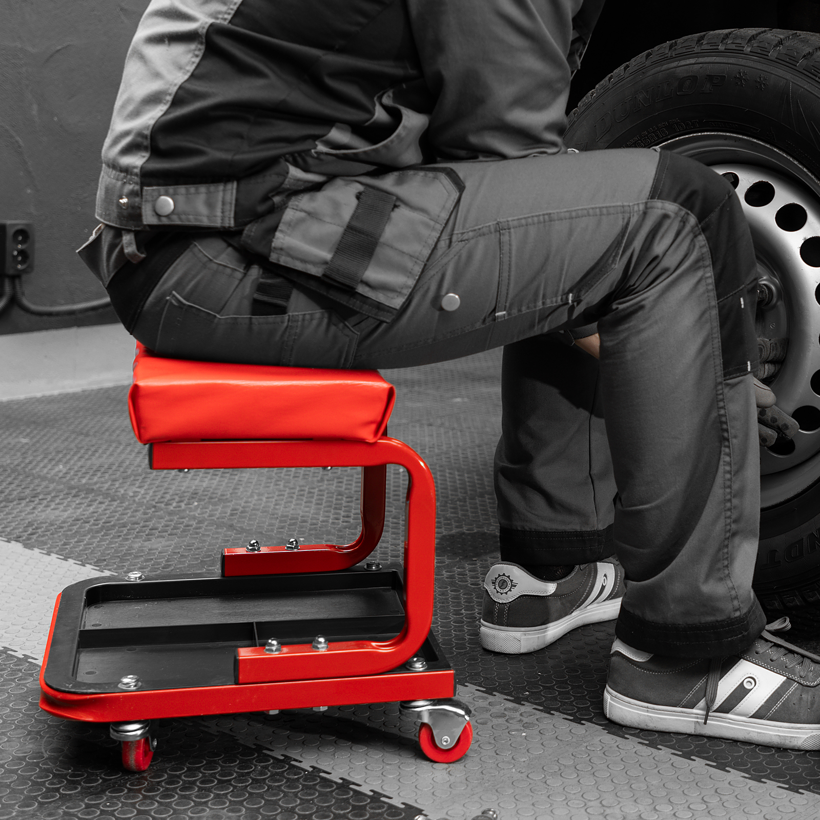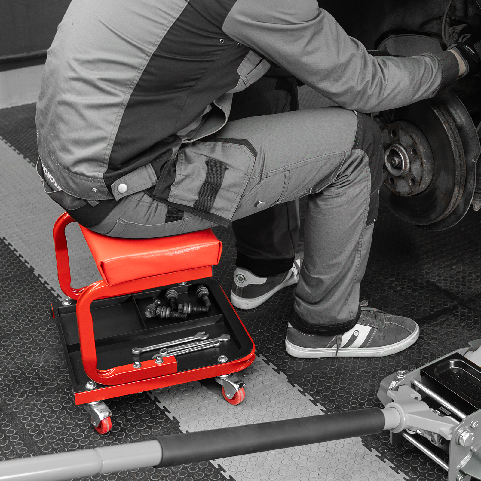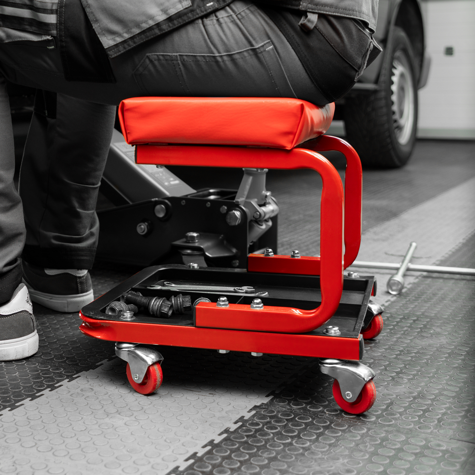 - На сиденье предусмотрены 4 колеса с углом поворота на 360°, поэтому можно с удобством перемещаться по гаражу.