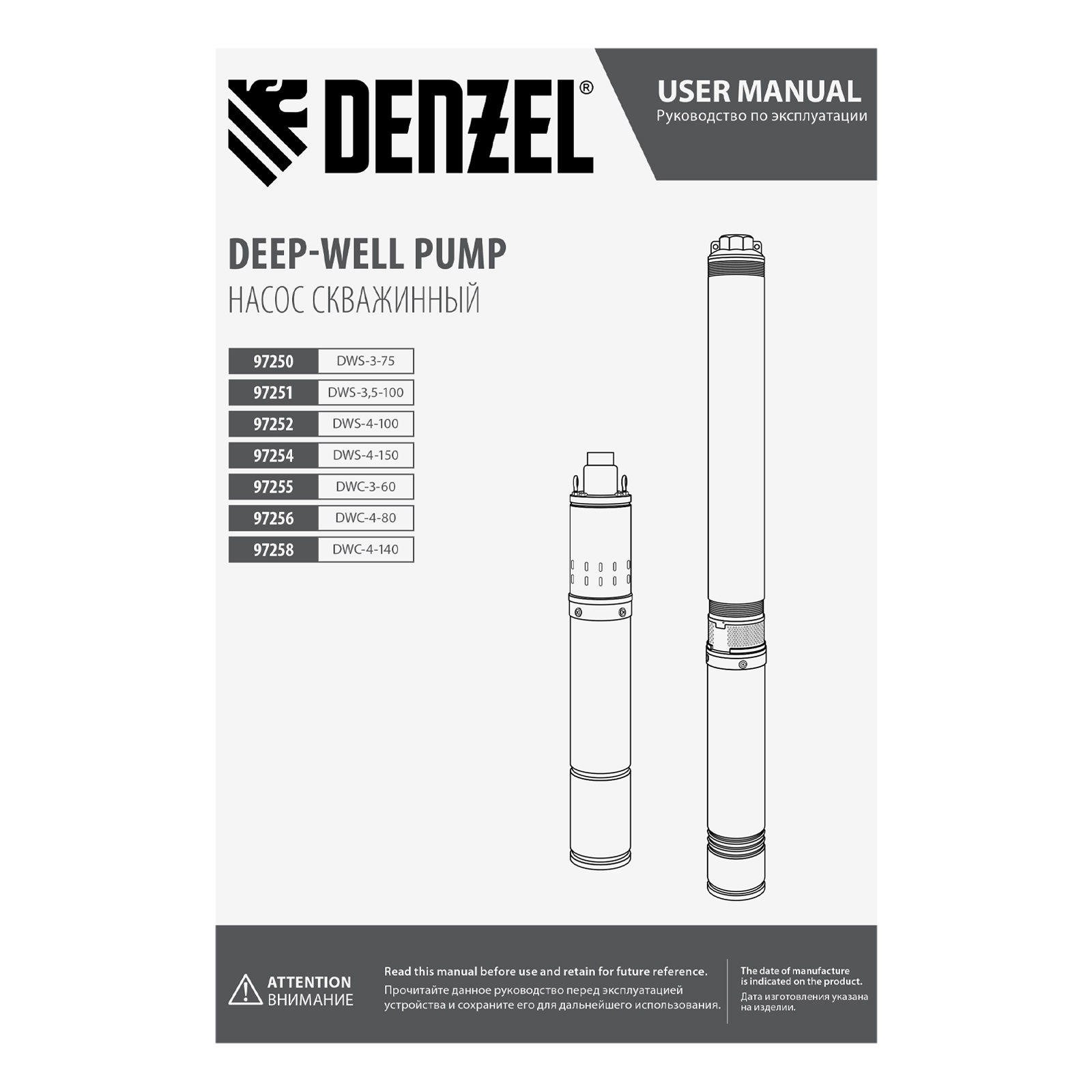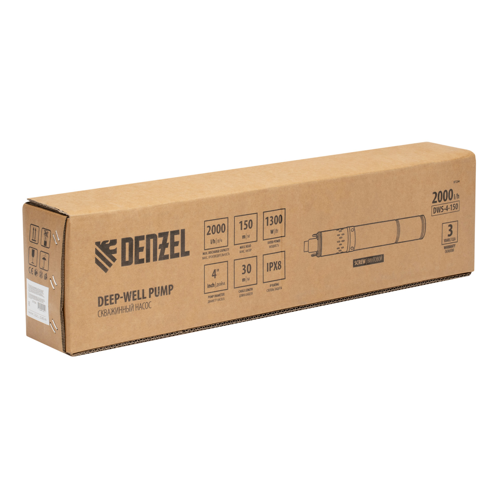 Скважинный насос Denzel DWS-4-150 97254 производительностью 2000 л/ч, диаметром 4″ и мощностью 1300 Вт обеспечивает напор до 150 м. Предназначен для подачи чистой воды из скважин, колодцев, систем водоснабжения, различных накопителей и пресных водоемов с глубины до 27 м (с наращиванием кабеля — до 80 м). Винтовая насосная часть обеспечивает напор, достаточный не только для полива приусадебных участков, но и для организации бытового водоснабжения.