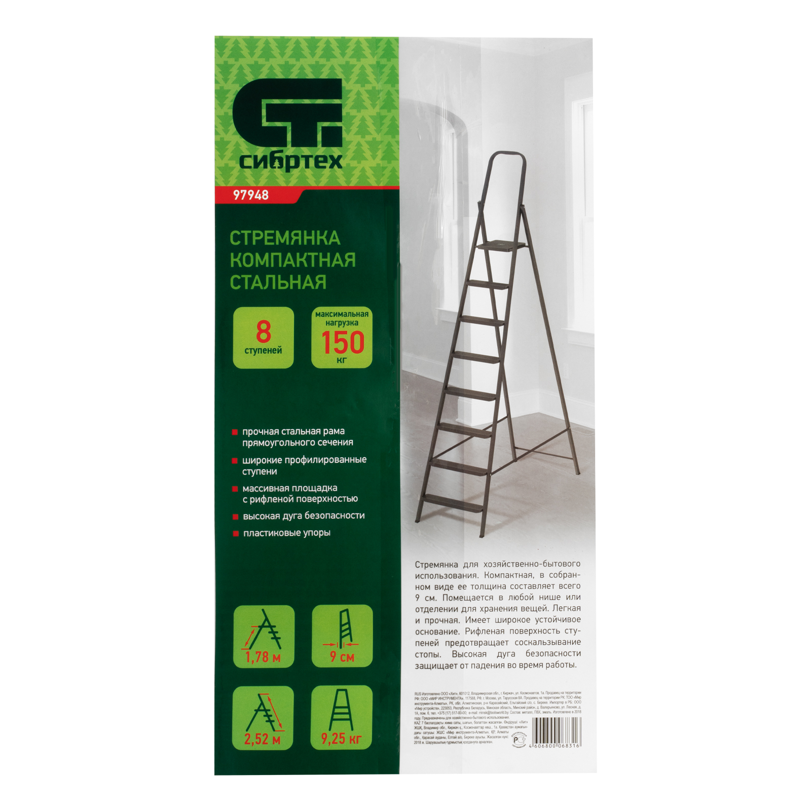 Стремянка компактная стальная Сибртех 97948 с 8 ступенями служит для проведения работ на высоте, превышающей человеческий рост. Стальные профилированные рама и ступени рассчитаны на нагрузку до 150 кг. Площадка находится на высоте 179 см от опорной поверхности, рабочая высота стремянки составляет 379 см (при среднем росте пользователя 170 см). Использовать стремянку можно дома, на даче или в гараже, а также во время строительства и ремонта.