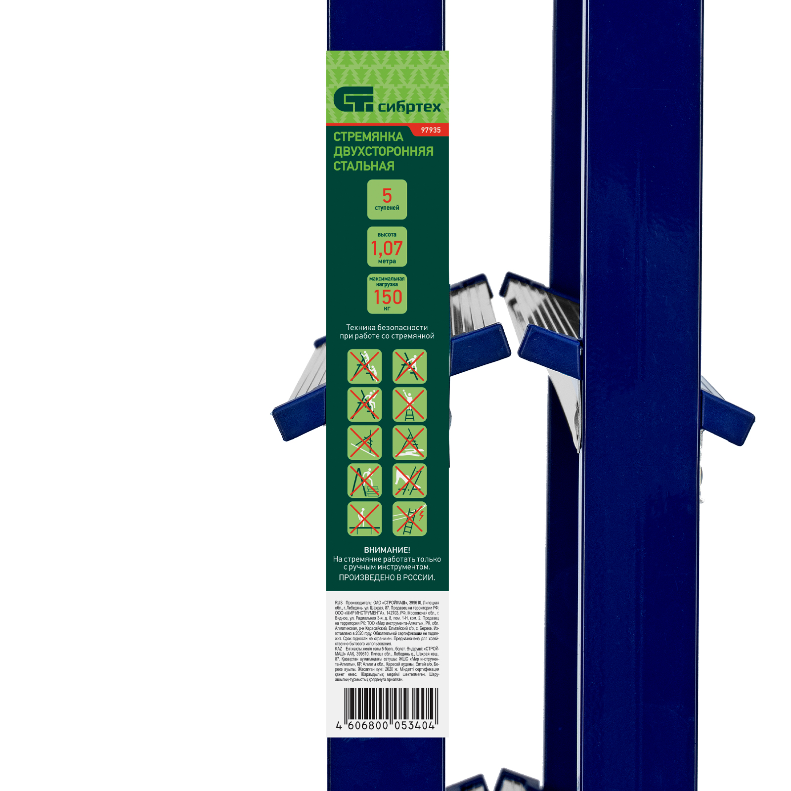 Стремянка двусторонняя стальная Сибртех 97935 с 5 ступенями используется строителями, работниками коммунальных служб, а также полезна в быту. Незаменима, если нужно выполнить монтажные или отделочные работы на высоте, провести уборку, а также достать нужные предметы с антресолей или верхней полки шкафа. На широких ступенях комфортно стоять. Площадка находится на высоте 100,4 см от опорной поверхности, рабочая высота стремянки составляет 300,4 см (при среднем росте пользователя 170 см). Стальная рама прямоугольного сечения выдерживает нагрузку до 150 кг.