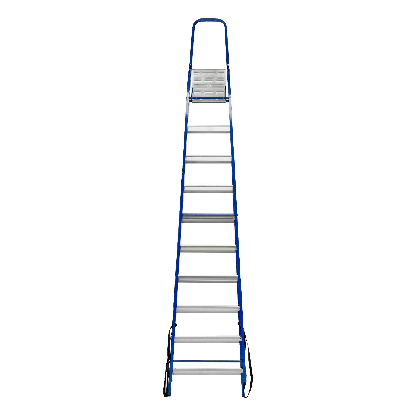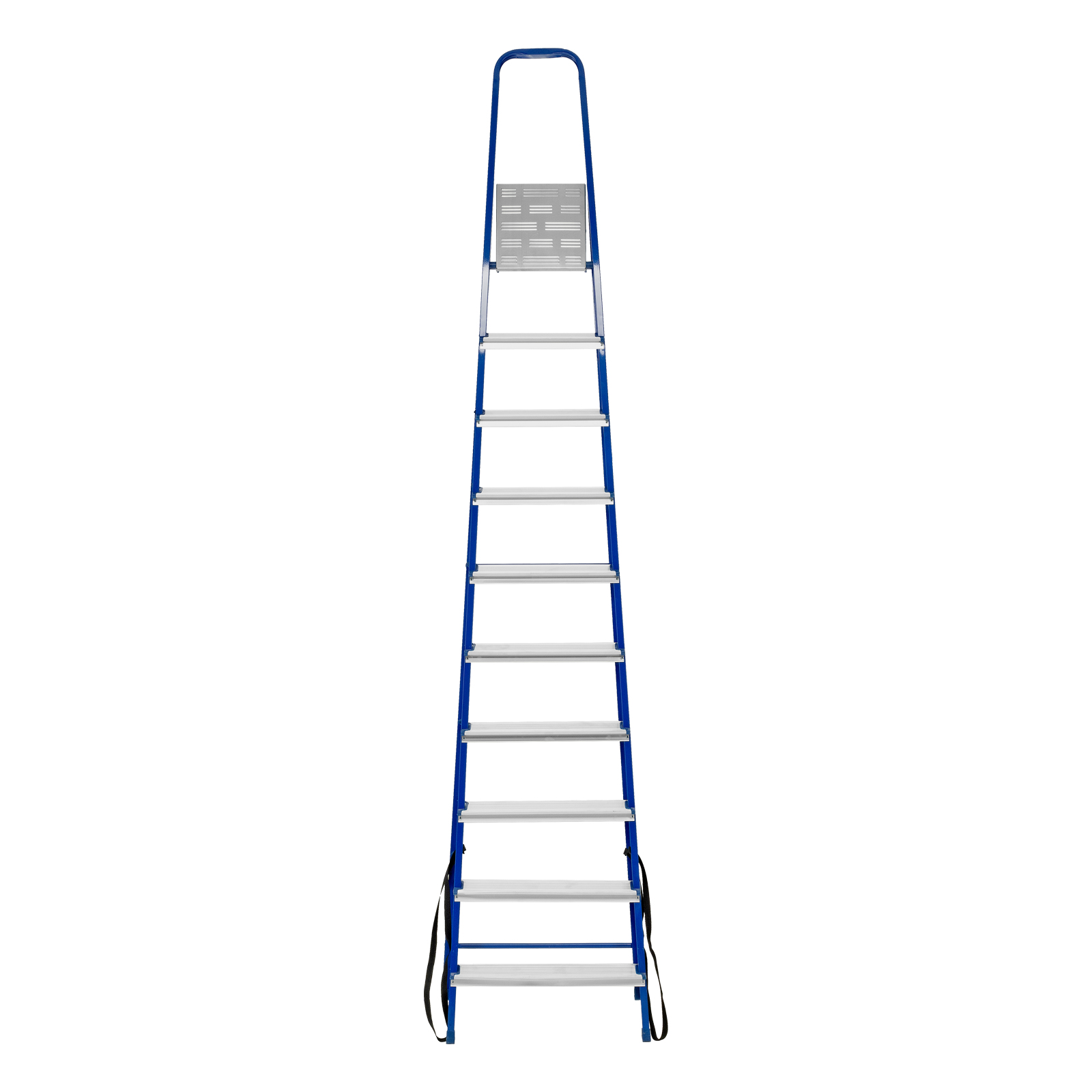 - Надежность — рама изготовлена из профилированной стали, стальная верхняя площадка с зацепами прочно фиксирует стремянку в рабочем положении, страховочные ленты придают дополнительную прочность конструкции.