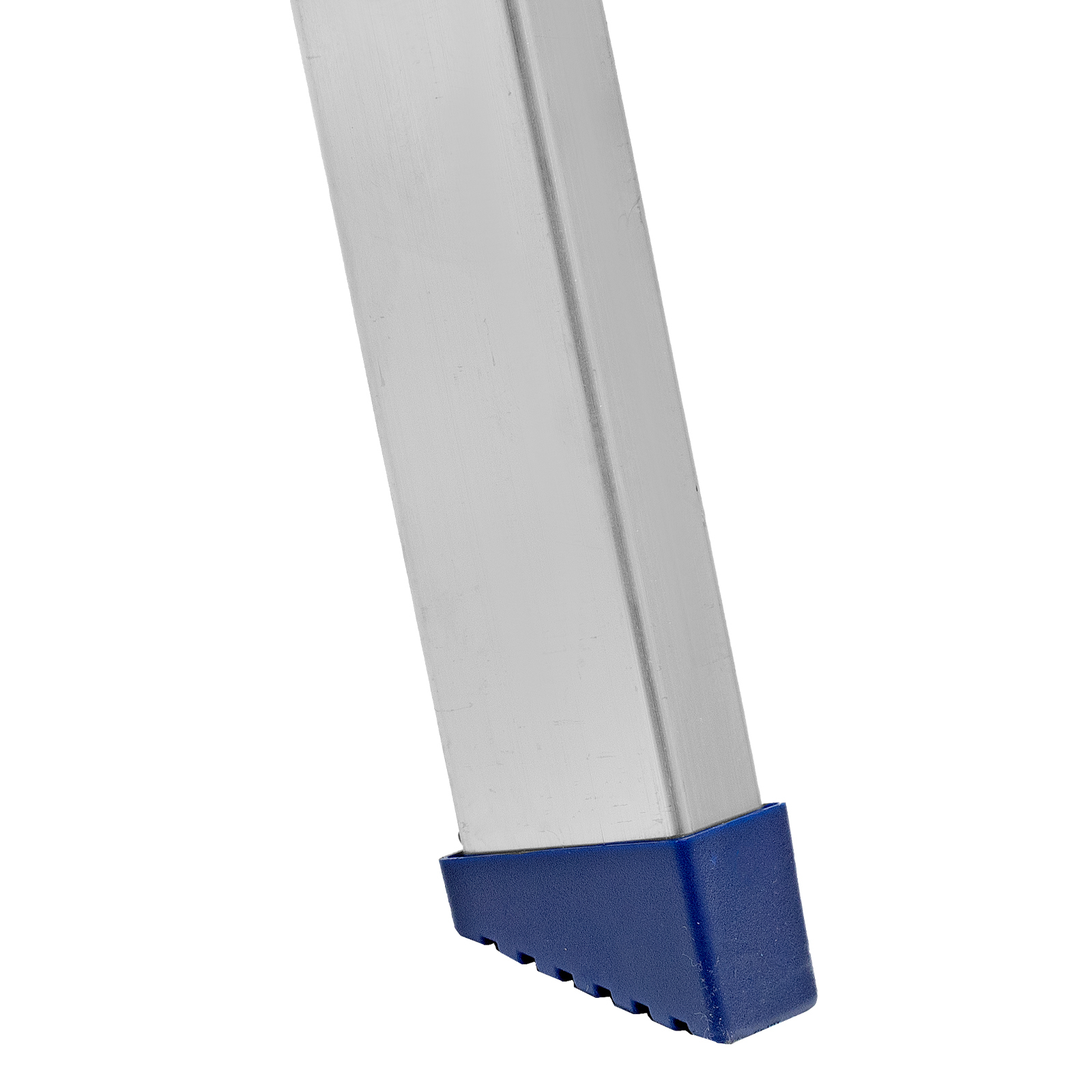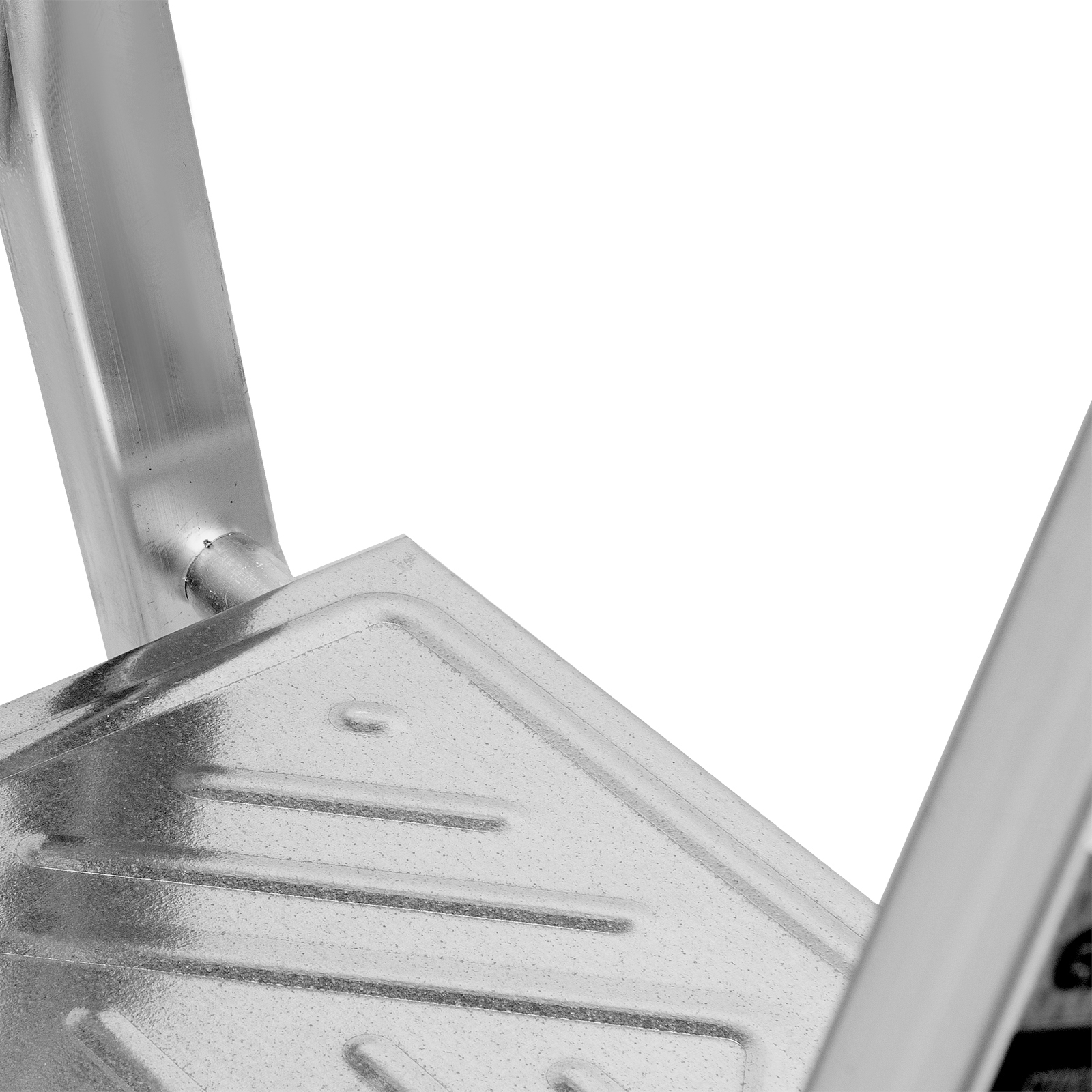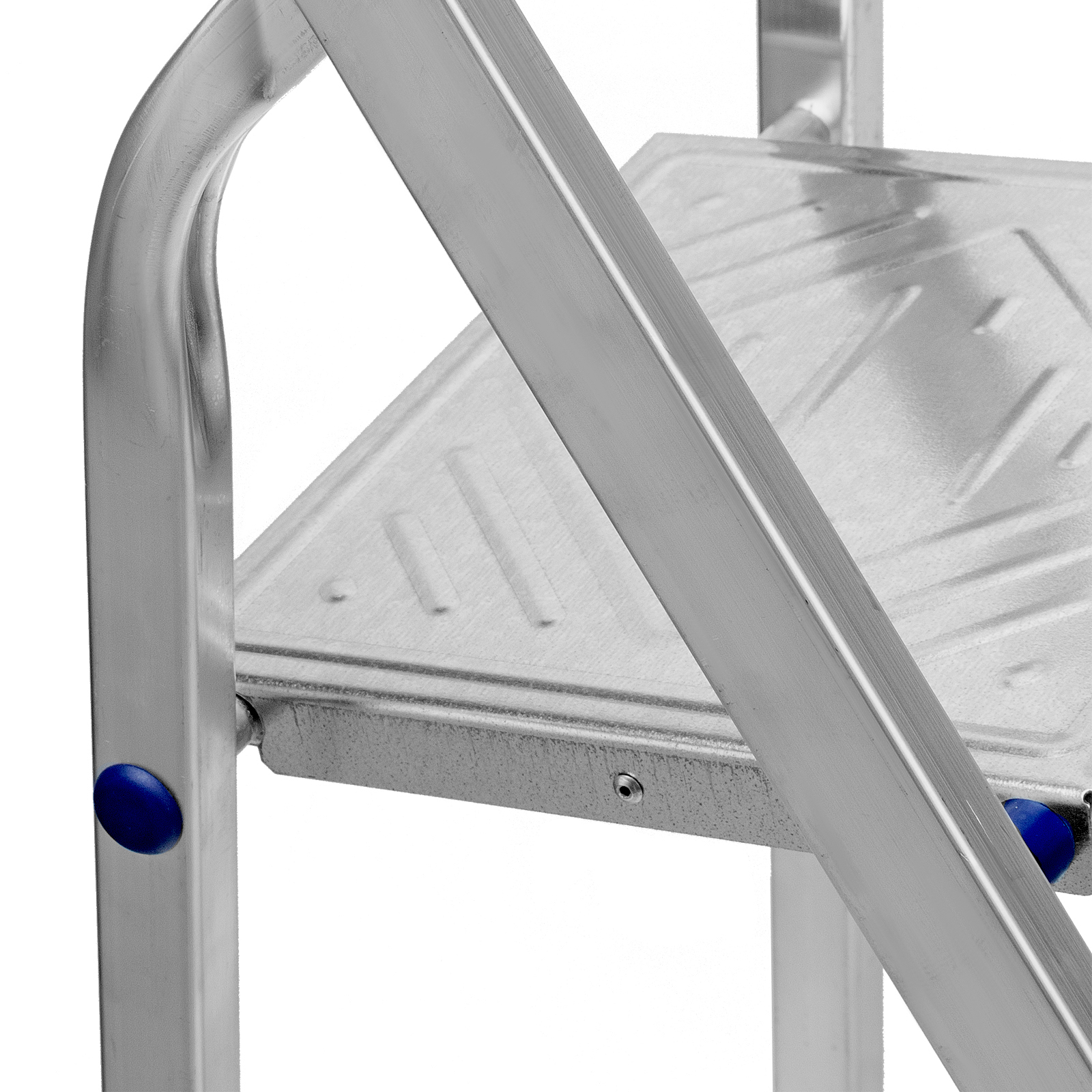 - Надежность — рама из прямоугольного алюминиевого профиля выдерживает нагрузку до 150 кг, широкие ступени закреплены заклепками.