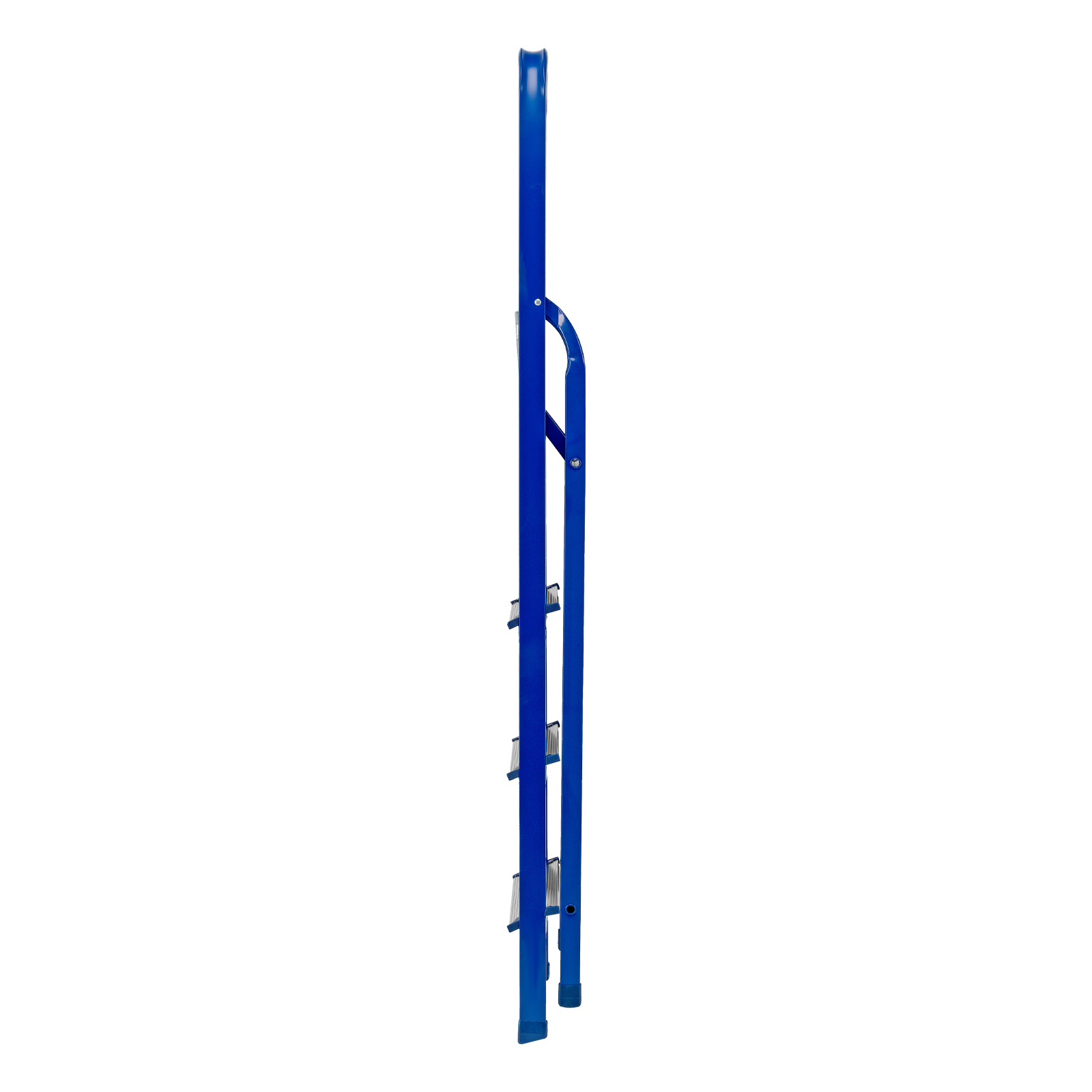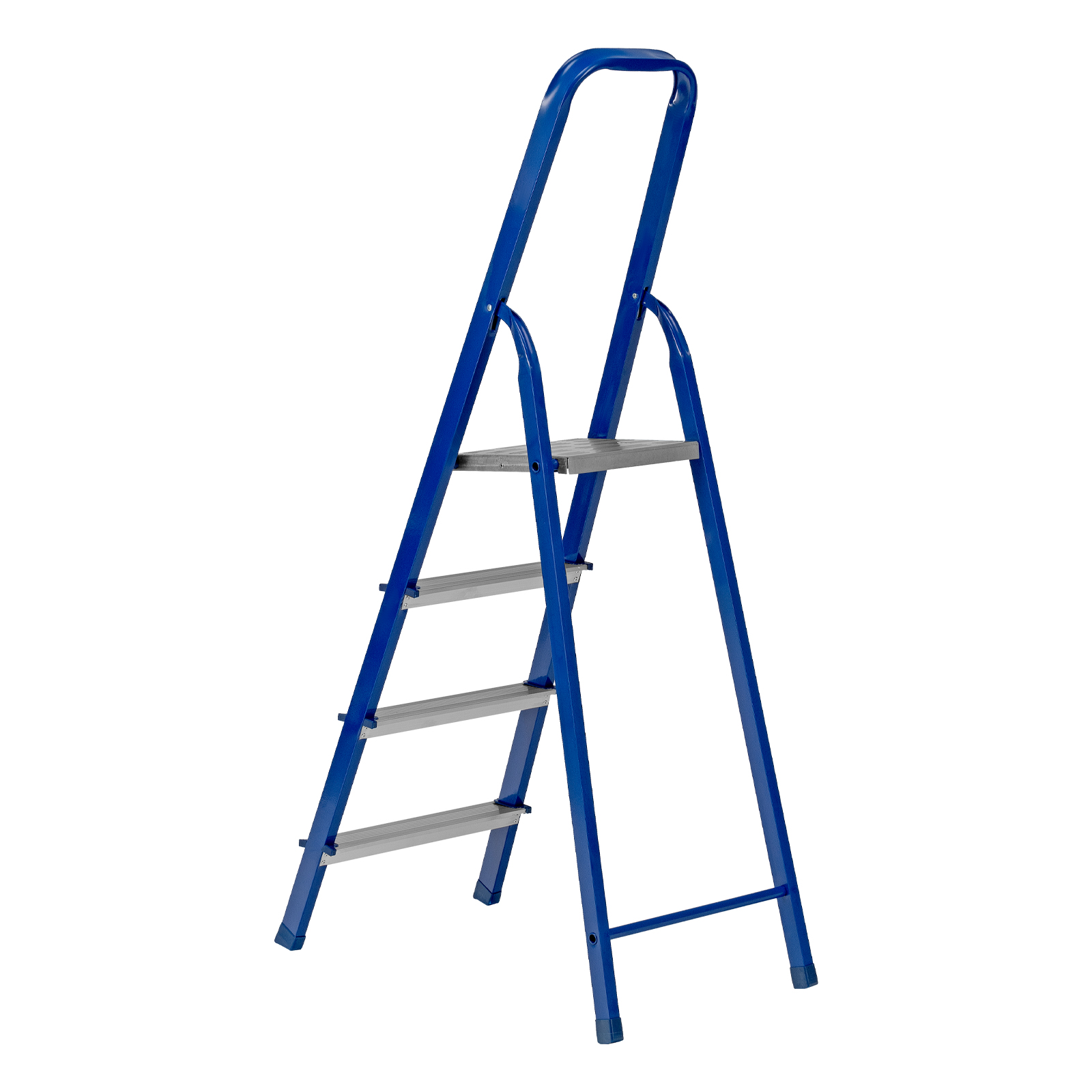 - Надежная конструкция — рама изготовлена из профилированной стали, стальная верхняя площадка с зацепами прочно фиксирует стремянку в рабочем положении.