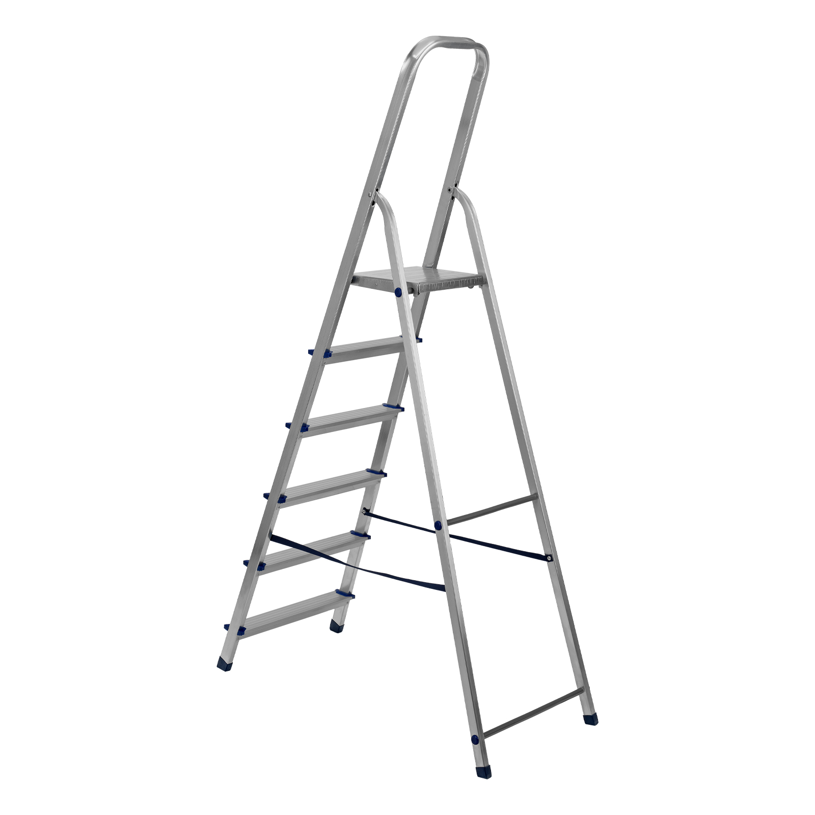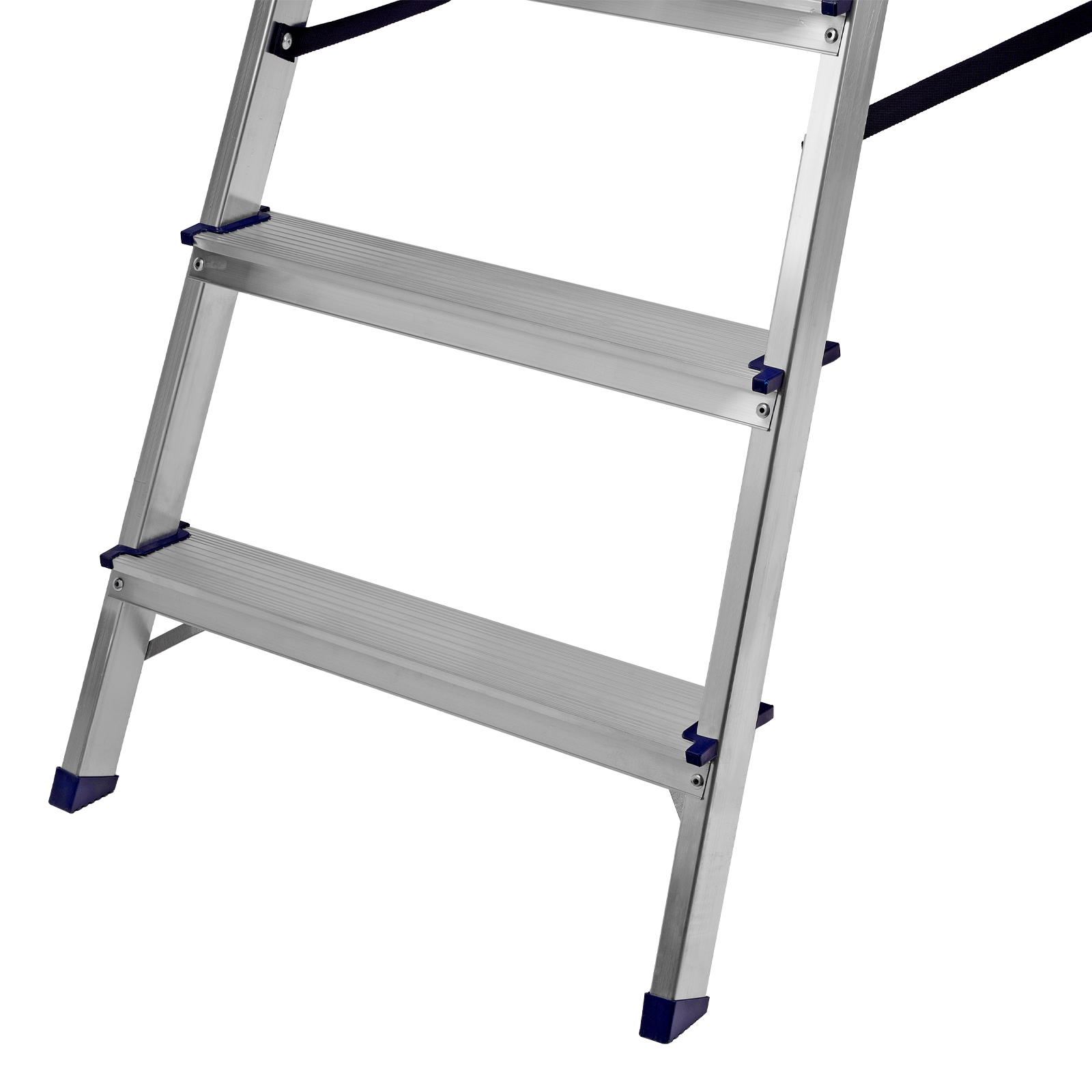 - Надежность — рама из прямоугольного алюминиевого профиля выдерживает нагрузку до 150 кг, широкие ступени закреплены заклепками, страховочные стяжки повышают прочность конструкции.