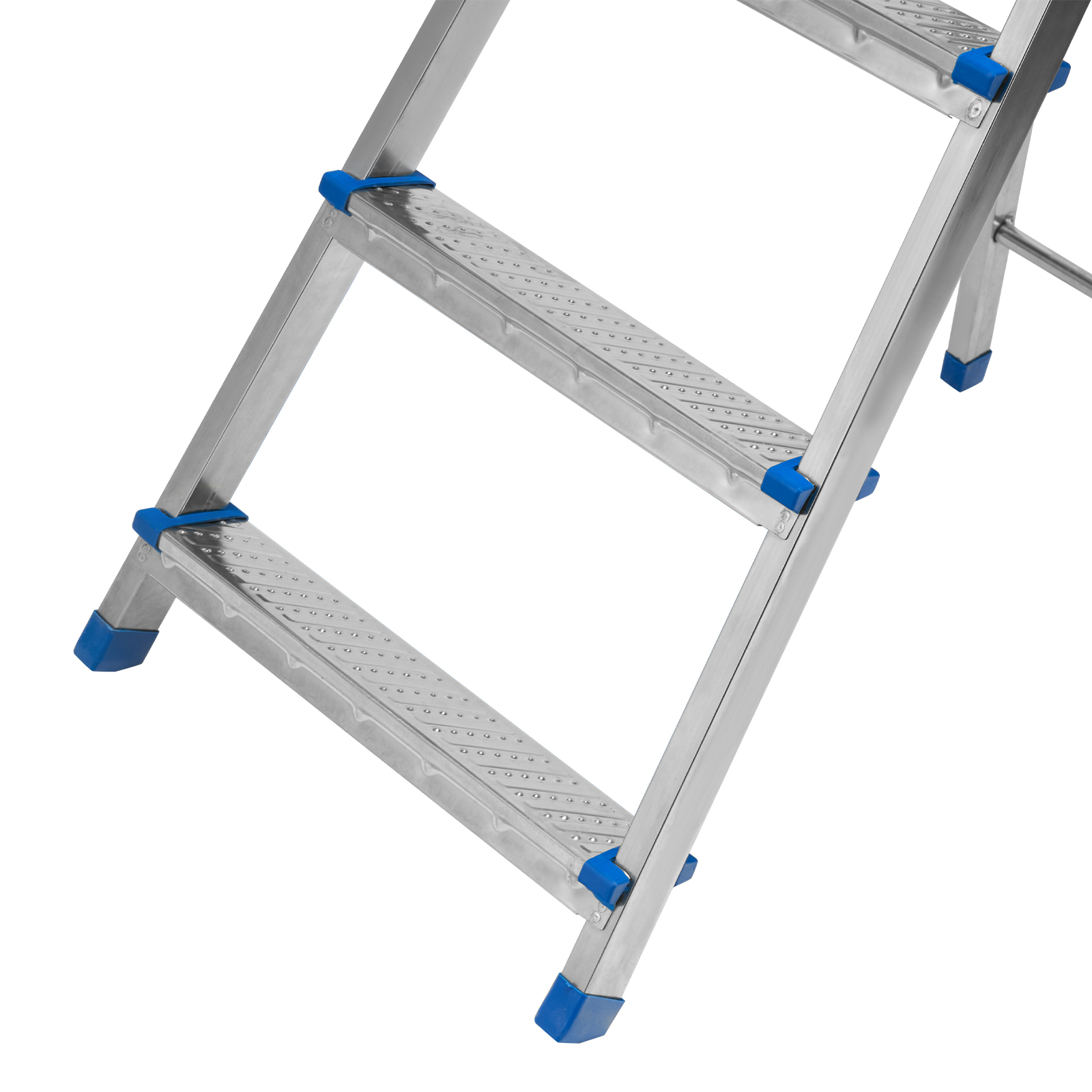- Простая установка — на верхней площадке предусмотрены специальные зацепы для фиксации стремянки в разложенном состоянии.