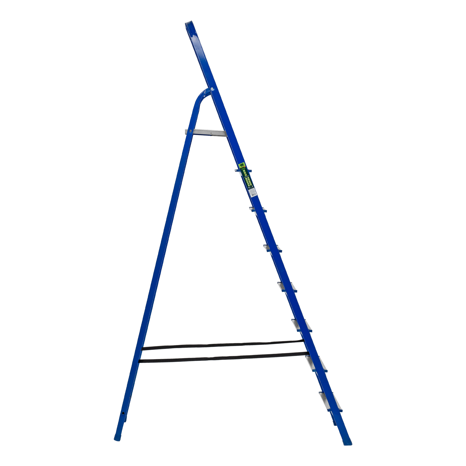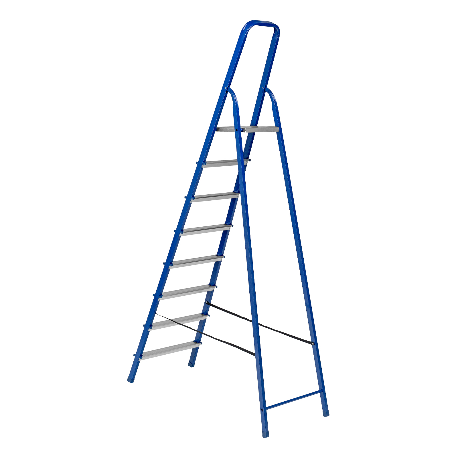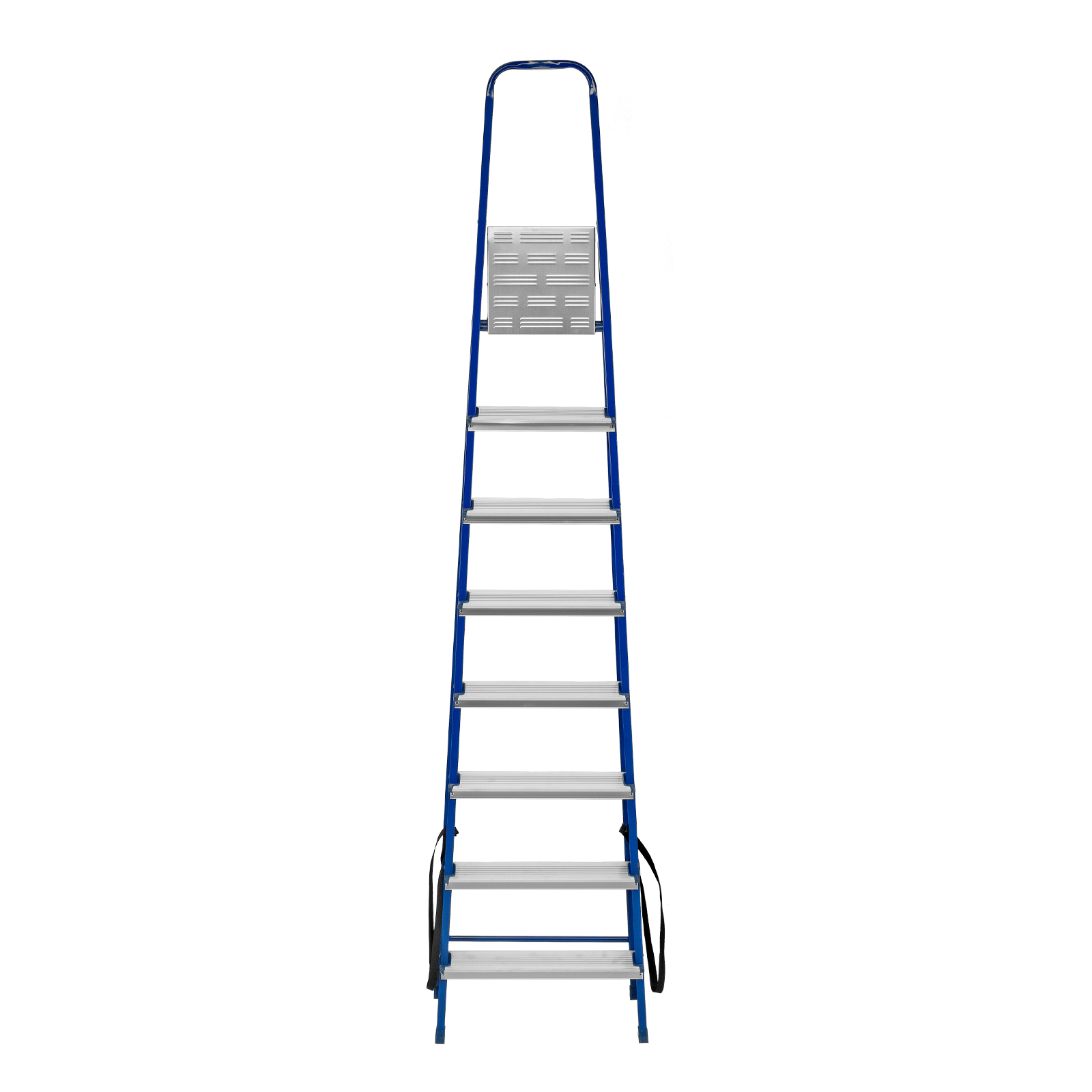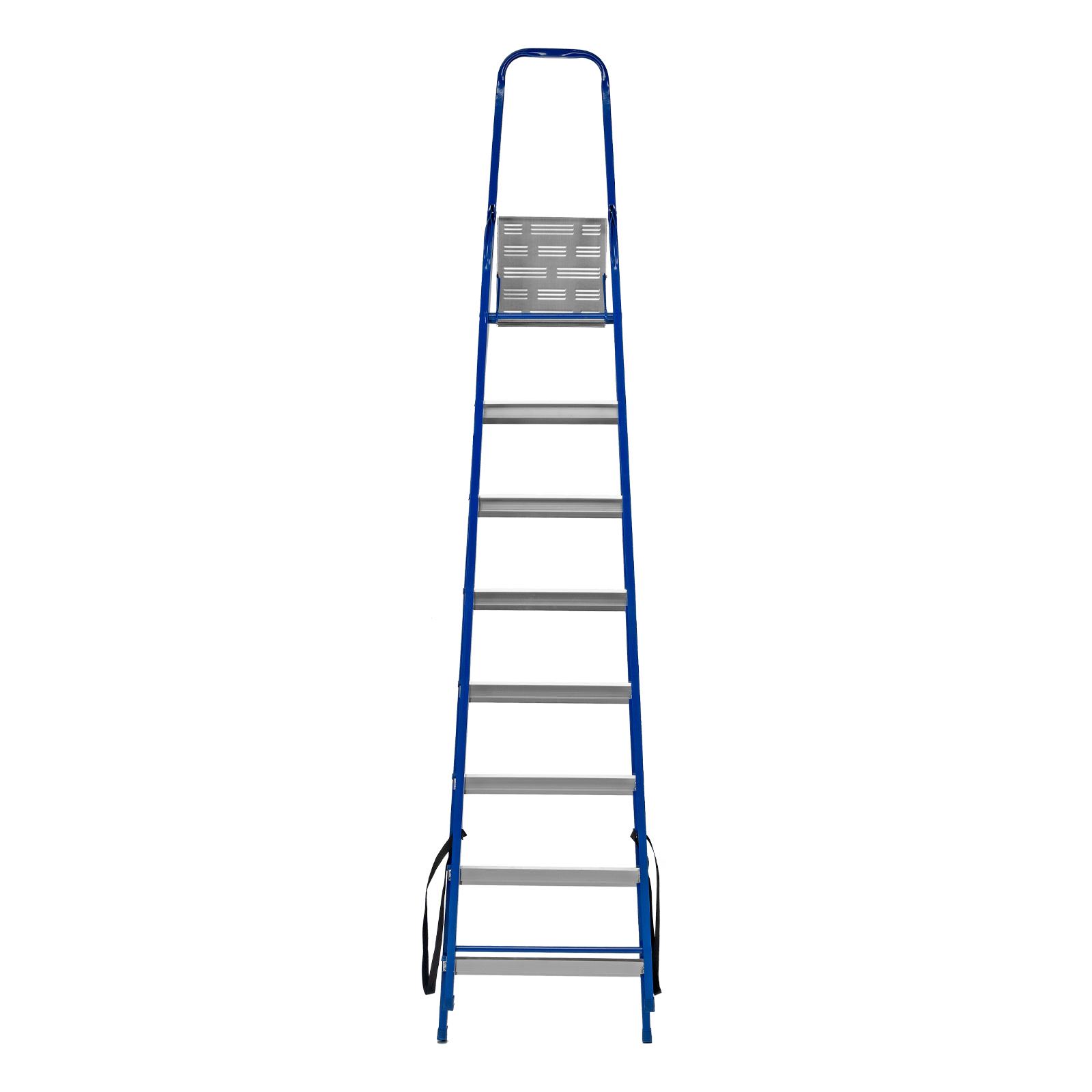 - Надежность — рама изготовлена из профилированной стали, стальная верхняя площадка с зацепами прочно фиксирует стремянку в рабочем положении, страховочные ленты придают дополнительную прочность конструкции.