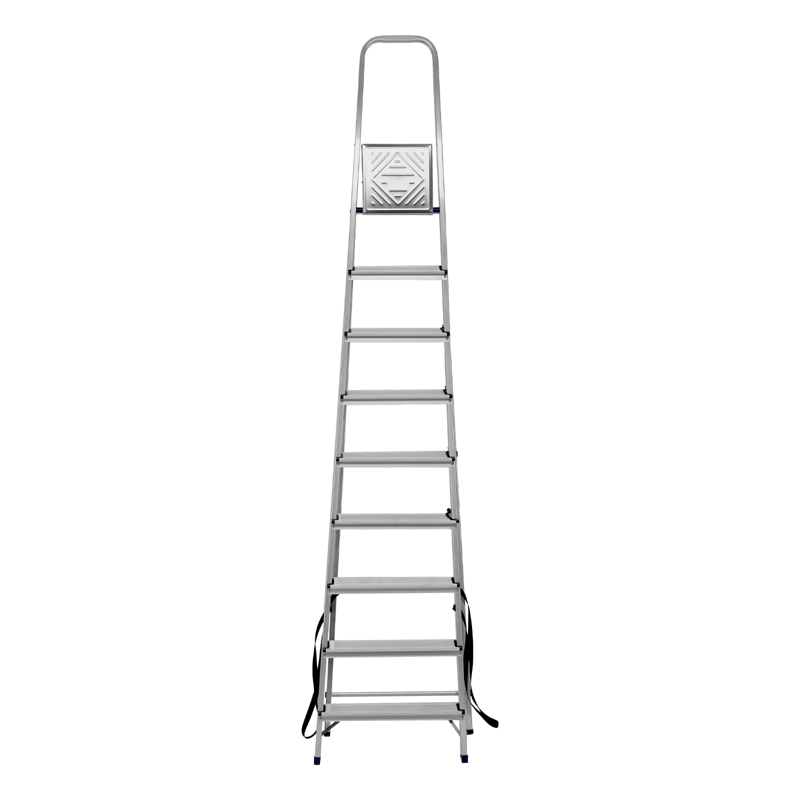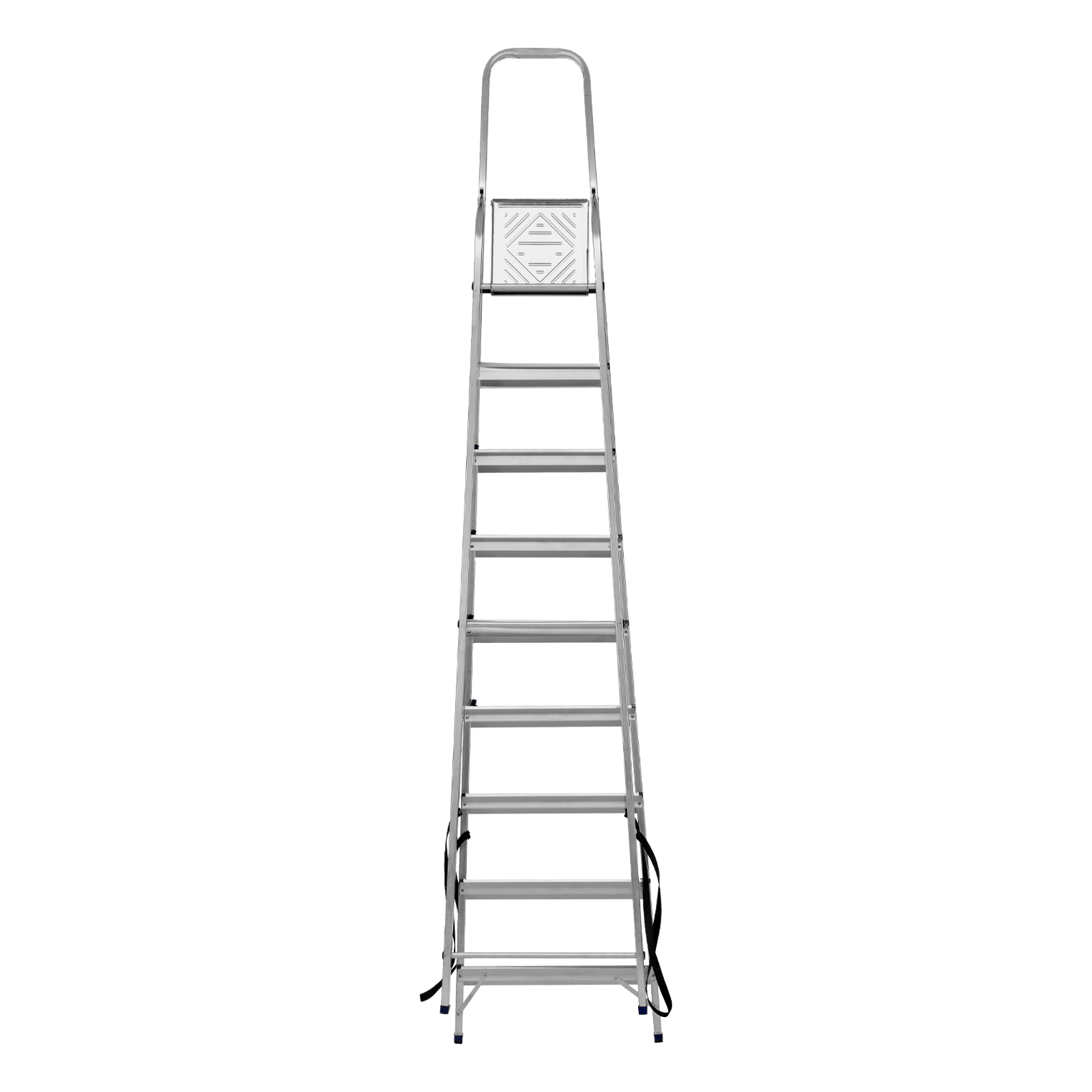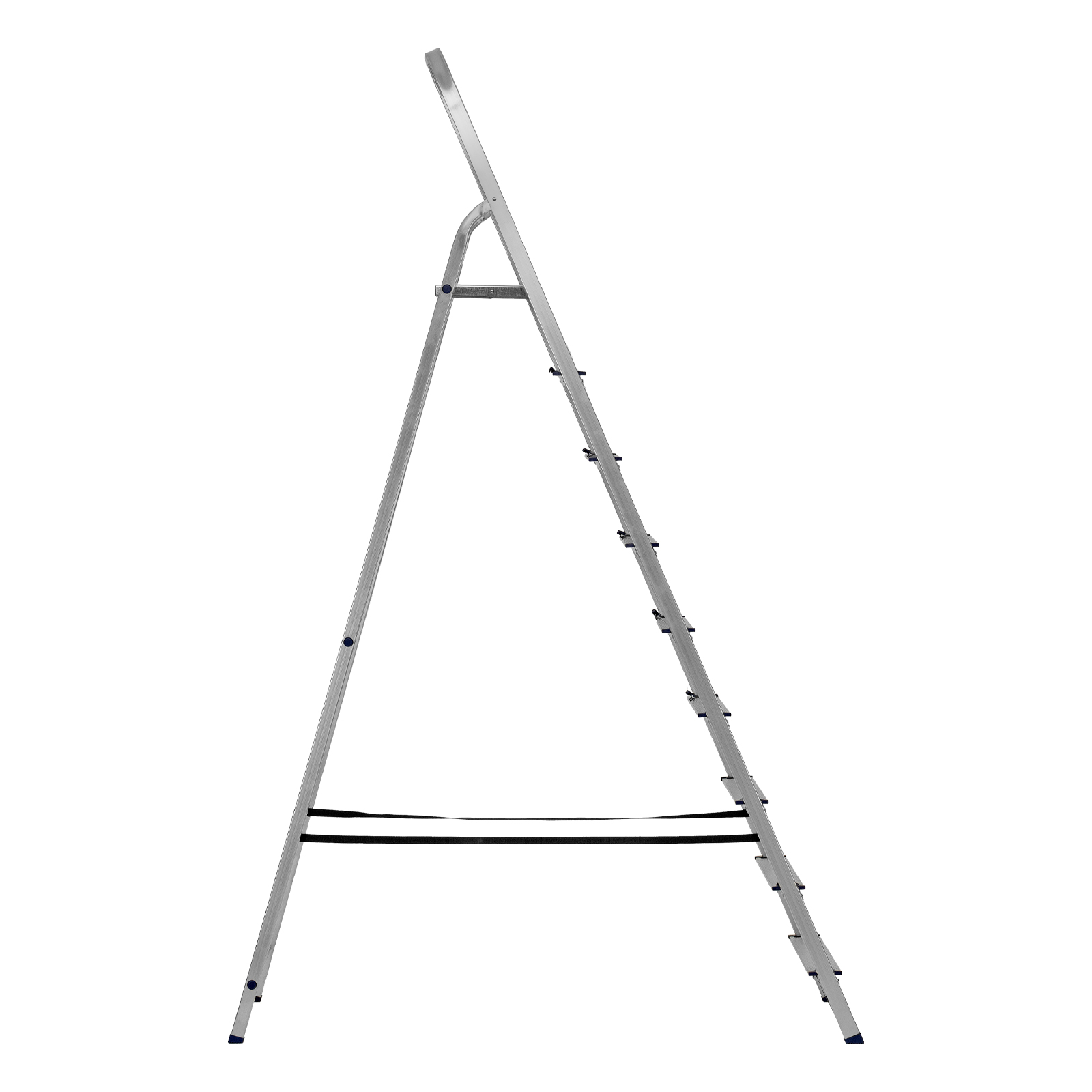 - Надежность — рама из прямоугольного алюминиевого профиля выдерживает нагрузку до 150 кг, широкие ступени закреплены заклепками, страховочные стяжки повышают прочность конструкции.