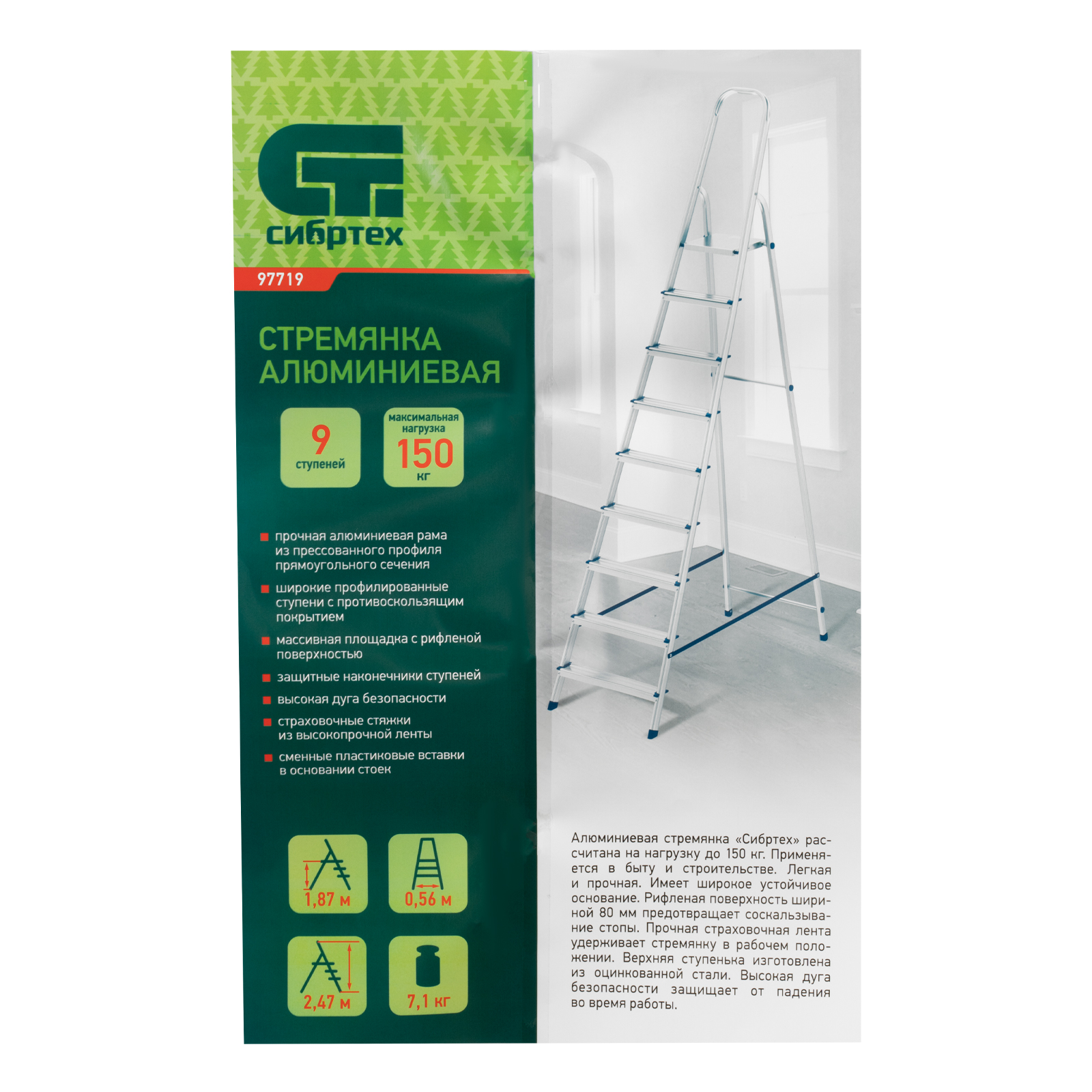 Стремянка алюминиевая Сибртех 97719 с 9 ступенями предназначена для выполнения работ на высоте, превышающей человеческий рост. Высокая дуга безопасности обеспечивает устойчивое положение пользователя. Площадка находится на высоте 186,9 см от опорной поверхности, рабочая высота стремянки составляет 386,9 см (при среднем росте пользователя 170 см). Стремянка пригодится во время строительных и ремонтных работ, будет полезна на даче или в гараже.