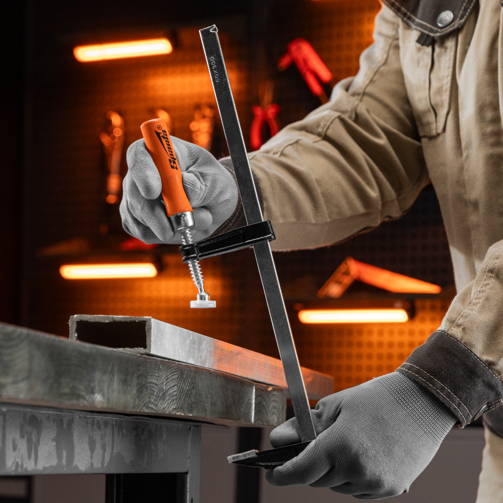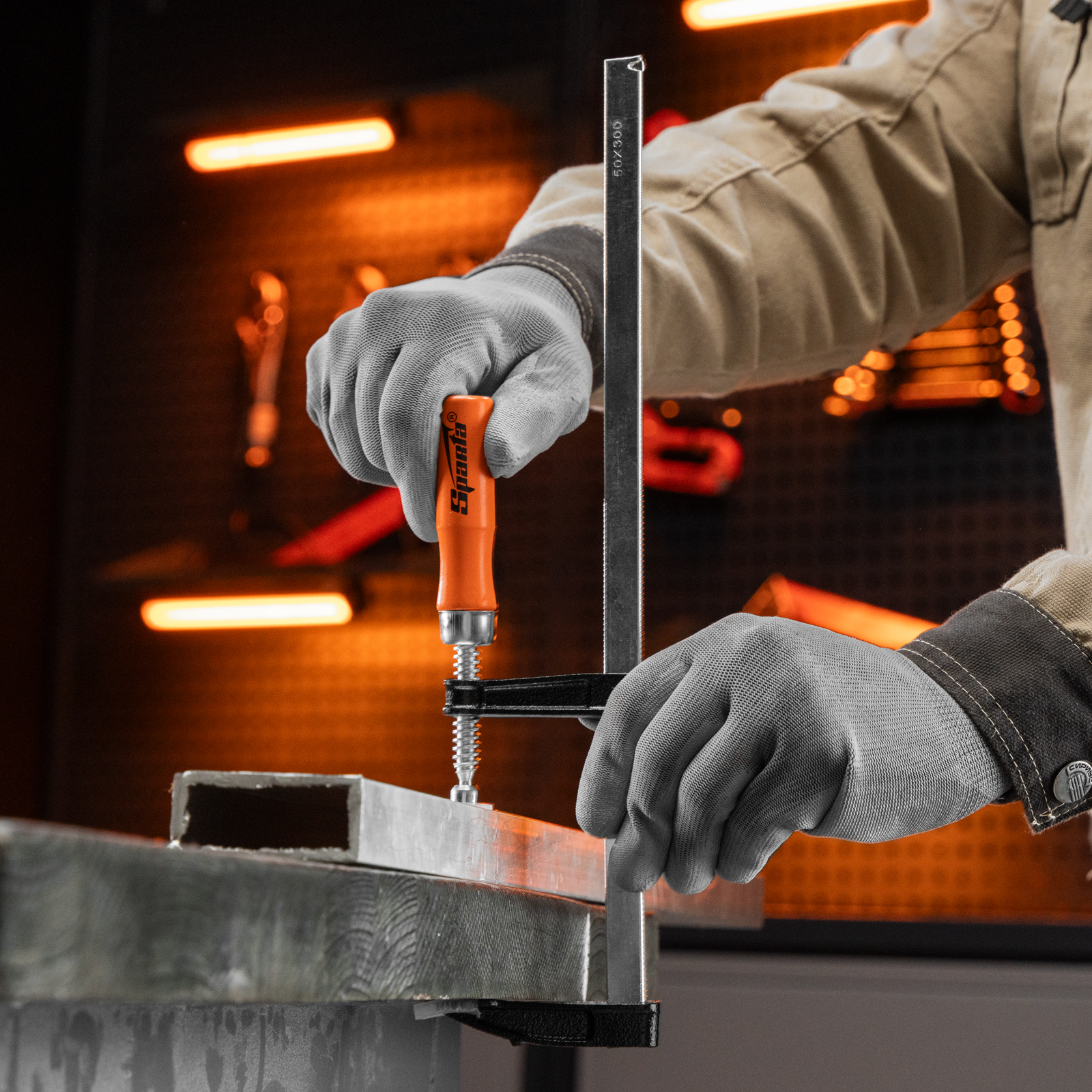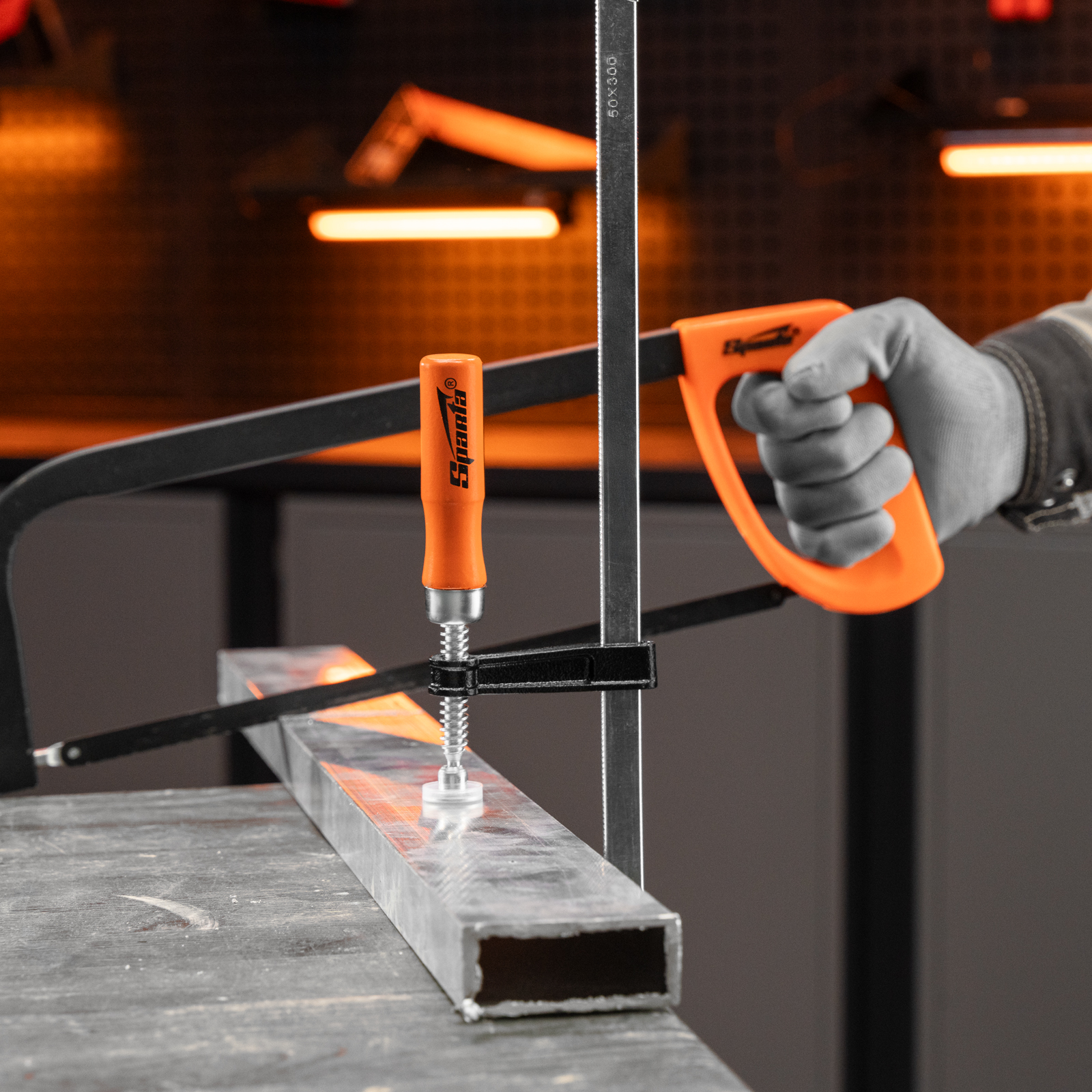 F-образная струбцина Sparta 204325 длиной 350 мм и величиной зажима 300 х 50 мм позволяет фиксировать заготовки из металла, древесины и других материалов для их соединения или обработки. Используется в столярном и слесарном деле. Деталь помещают между губками, одна из которых подвижна и служит для регулировки величины захвата. Винтовой зажим позволяет фиксировать заготовку со значительным усилием. Элементы конструкции выдерживают высокую температуру, поэтому струбцина подходит для проведения сварочных работ, при этом пластиковые накладки необходимо снять.