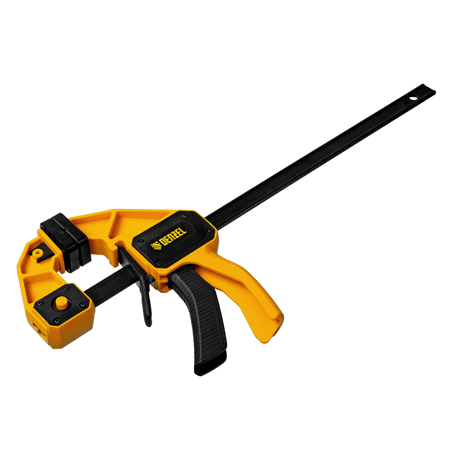- Комфортное использование — струбцина весит всего 620 г, обрезиненная кнопка фиксации обеспечивает удобный захват.