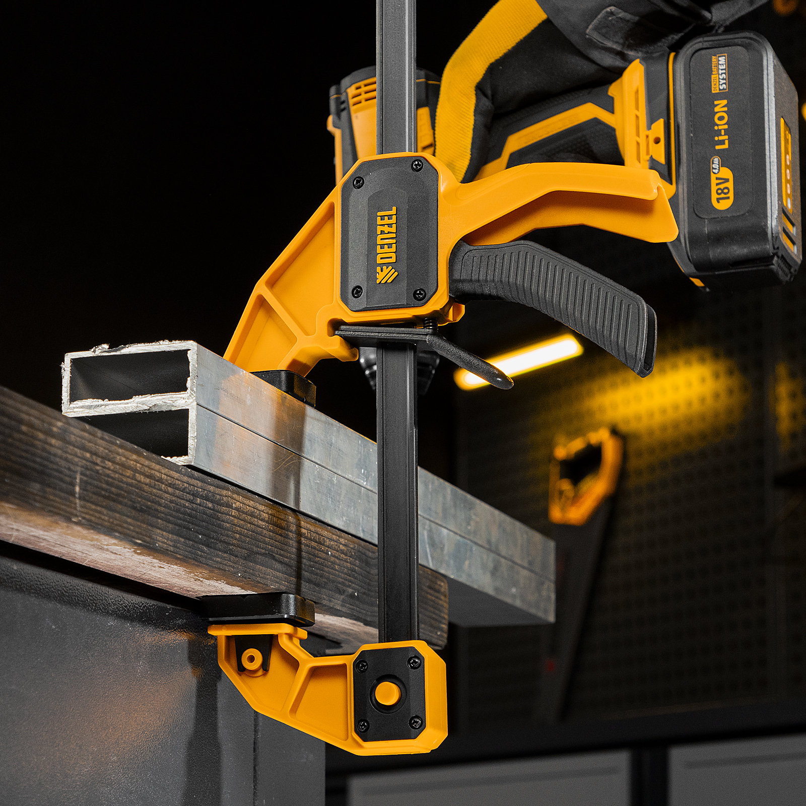 - Комфортное использование — струбцина весит всего 710 г, обрезиненная кнопка фиксации обеспечивает удобный захват.