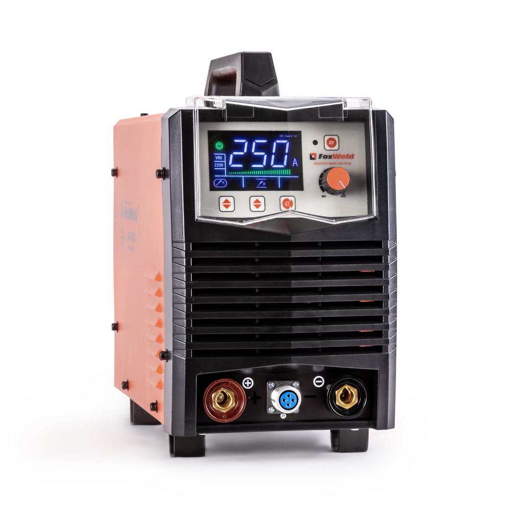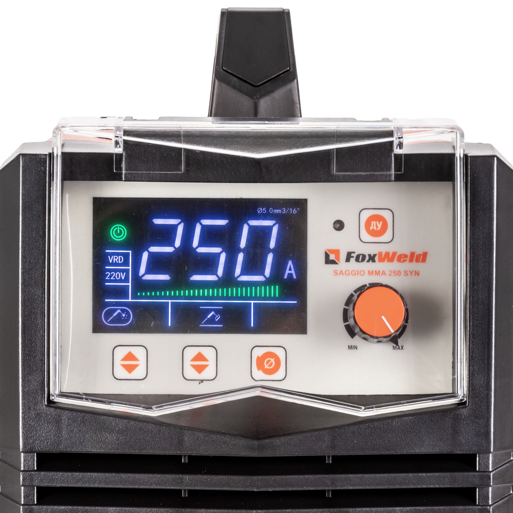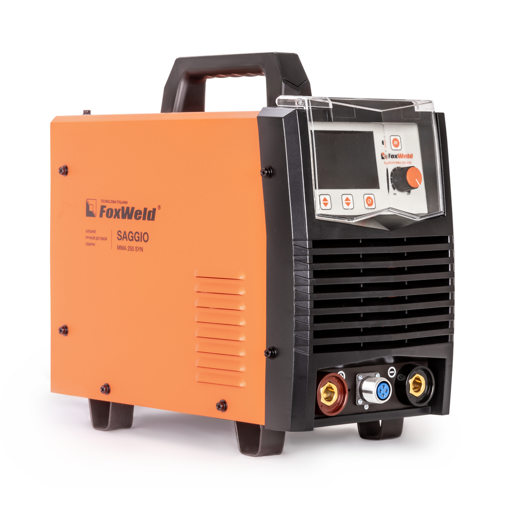 Сварочный аппарат SAGGIO ММА 250 SYN с синергетическим режимом управления предназначен для ручной дуговой сварки (ММА) любыми типами электродов и выполнен по новейшей IGBT технологии, позволяющей добиться минимального веса и габаритов. SAGGIO ММА 250 SYN отличается надёжностью, хорошими техническими характеристиками, имеет программно-установленные функции AntiSticking (антизалипание), регулируемые Нot Start (горячий старт) и Arc Force (форсаж дуги), и устойчиво работает при понижении напряжения сети, что делает аппарат более универсальным и практичным. Синергетическая система управления позволяет легко и быстро настроить аппарат по диаметру сварочного электрода. Дополнительный режим TIG LIFT позволяет проводить аргонодуговую сварку на постоянном токе изделий из черной и нержавеющей стали, меди, титана, чугуна. Данный вид сварки характеризуется отсутствием брызг и более презентабельным внешним видом сварного шва. Для проведения аргонодуговой сварки необходимо дополнительно приобрести горелку с вентилем, баллон с газом и присадочную проволоку.МНОГОФУНКЦИОНАЛЬНОСТЬ 2-В-1: Помимо ручной дуговой сварки (MMA), вторым режимом работы аппарата SAGGIO ММА 250 SYN является сварка вольфрамовым электродом TIG LIFT, что позволяет проводить аргонодуговую сварку на постоянном токе изделий из черной и нержавеющей стали, меди, титана, чугуна. Данный вид сварки характеризуется отсутствием брызг и более презентабельным внешним видом сварного шва. Для проведения аргонодуговой сварки необходимо дополнительно приобрести горелку с вентилем (артикул 2586).СИНЕРГЕТИЧЕСКИЙ РЕЖИМ УПРАВЛЕНИЯ: Режим синергетики позволяет сэкономить время и получить качественное сварное соединение даже новичку, так как основные параметры подбираются автоматически с возможностью тонкой ручной подстройки сварочного процесса. Синергетику можно отключить для работы в ручном режиме.ИНФОРМАТИВНАЯ ПАНЕЛЬ УПРАВЛЕНИЯ: Удобная настройка режимов сварки с помощью информативной панели управления и LCD экрана. В аппарате большое количество функций и опций, которые настраиваются с помощью специальных кнопок. На цифровом дисплее отображаются действующие значения сварочного тока и напряжения в процессе сварки и параметры сварки в режиме настройки.СНИЖЕНИЕ НАПРЯЖЕНИЯ ХОЛОСТОГО ХОДА: Функция VRD (снижение напряжения холостого хода) повышает безопасность и исключает риск поражения сварщика электрическим током. Сварочный процесс становится более безопасным в замкнутых пространствах и при сварке в условиях повышенной влажности.РАЗЪЁМ ДУ: Инвертор имеет возможность подключения пульта дистанционного управления, что позволяет регулировать сварочный ток непосредственно вблизи проведения сварочных работ даже при большой длине сварочных кабелей.ПРЕИМУЩЕСТВА:Профессиональная реализация всех трёх сервисных функционалов: Antisticking (Антизалипание), регулируемые Hot Start (Горячий старт) и Arc Force (Форсаж дуги)Большой экран с чётким отражением параметров сваркиБайонеты профессионального уровня размером 35-50Мощный и производительный вентиляторРежим TIG LIFTИнвертор на транзисторах IGBTВоздушное охлаждениеРабота при пониженном напряженииФУНКЦИОНАЛЬНЫЕ ОСОБЕННОСТИ:РЕЖИМ MMA: Работает с входным напряжением от 150 до 270 вольт;Может работать с диаметром покрытого электрода до 5 мм;Выставляется ток сварки от 20 до 250 ампер;Аппар