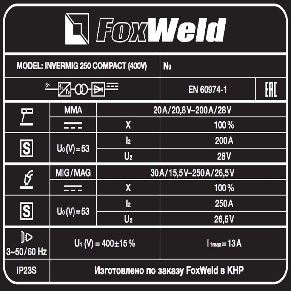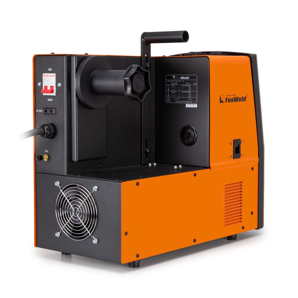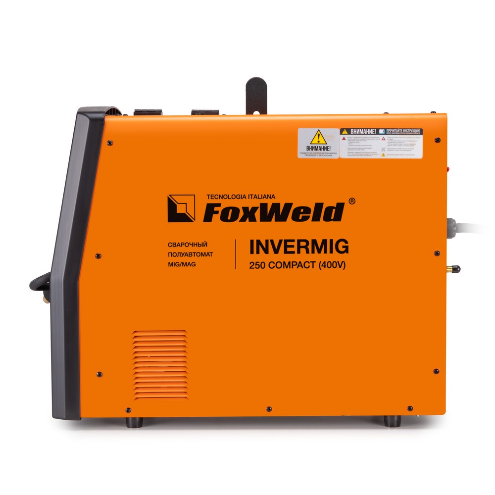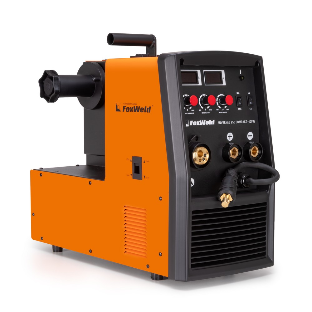Сварочный полуавтомат Foxweld Invermig 250 Compact (400V) позволяет производить сварку постоянным током, используя инверторную технологию преобразования и управления сварочным током. Благодаря трёхфазному питанию от 400 вольт даже при максимальном сварочном токе вся нагрузка равномерно распределяется на 3 линии производственной площадки, не перегружая и не перегревая какую-то одну из них. Invermig 250 Compact (400V) позволяет проводить следующие виды работ: полуавтоматическую сварку сплошной проволокой в среде защитного газа MIG/MAG и порошковой проволокой без использования защитного газа, а также ручную дуговую сварку MMA на постоянном токе штучными электродами. Регулировка индуктивности в режиме полуавтоматической сварки даёт возможность вести процесс сварки с минимальным разбрызгиванием металла и приспосабливать процесс к любому типу работ. Invermig 250 Compact (400V) — это идеальный аппарат для проведения авторемонтных и монтажных работ, а также в отраслях по производству различных стальных конструкций.РАБОТА БЕЗ ОСТАНОВКИ: Параметр ПВ 100% на максимальном токе при КПД 85% обеспечивает бесперебойную устойчивую работу сварочного аппарата в течении всего рабочего дня. Это позволяет производить безостановочный сварочный процесс и выполнять работы, которые требуют больших временных затрат, что повышает скорость и производительность.СВАРКА БЕЗ ЗАЩИТНОГО ГАЗА: Сварочный аппарат позволяет использовать самозащитную сварочную проволоку при полуавтоматической сварке. Самозащитная порошковая проволока даёт возможность проводить сварочные работы без газа, что упрощает процесс сварки даже для неопытного пользователя. Нет необходимости в применении защитного газа, тяжёлых и громоздких газовых баллонов.РЕГУЛИРОВКА ИНДУКТИВНОСТИ: С помощью ручной настройки индуктивности можно дополнительно регулировать сварочную дугу для формирования нужного сварного шва. Регулировка индуктивности позволяет вести процесс сварки с минимальным разбрызгиванием металла и приспосабливать процесс к любому типу работ.РАБОТА ПРИ ПОНИЖЕННОМ НАПРЯЖЕНИИ: Аппарат работает от трёхфазной сети 400 В при перепадах напряжения от 360 до 400 В. Минимальное напряжение в 360 вольт позволяет работать сварочному аппарату в электросетях с пониженным напряжением, что часто наблюдается в сельской местности.ПРЕИМУЩЕСТВА:Сварка без защитного газа порошковой проволокойРабота от трёхфазной сети при напряжении от 360 ВВ верхней части передней панели аппарата расположены органы индикации и управленияДва цифровых дисплея для отображения параметров сварочного тока и напряженияСветодиод сигнализирует, если сработает термозащита при перегревеДва тумблера: один выставляет режим сварки, второй регулирует скорость подачи проволоки в зависимости от её диаметраКнопка подачи (заправки) проволоки в отсеке для катушек без траты защитного газаРучки плавной регулировки отвечают за параметры индуктивности, тока и напряжения сваркиМощный и эффективный вентилятор активно охлаждает воздушным потоком нагревающиеся элементы источника питания, находящиеся внутри корпусаСварочное устройство имеет класс защиты не IP21S, как у большинства моделей, а IP23SФУНКЦИОНАЛЬНЫЕ ОСОБЕННОСТИ:РЕЖИМ MIG/MAG: Диаметр сварочной проволоки: 0,8 / 1,0 / 1,2 мм;Диапазон регулировки сварочного тока 30 - 250 А;Возможность сварки без газа само