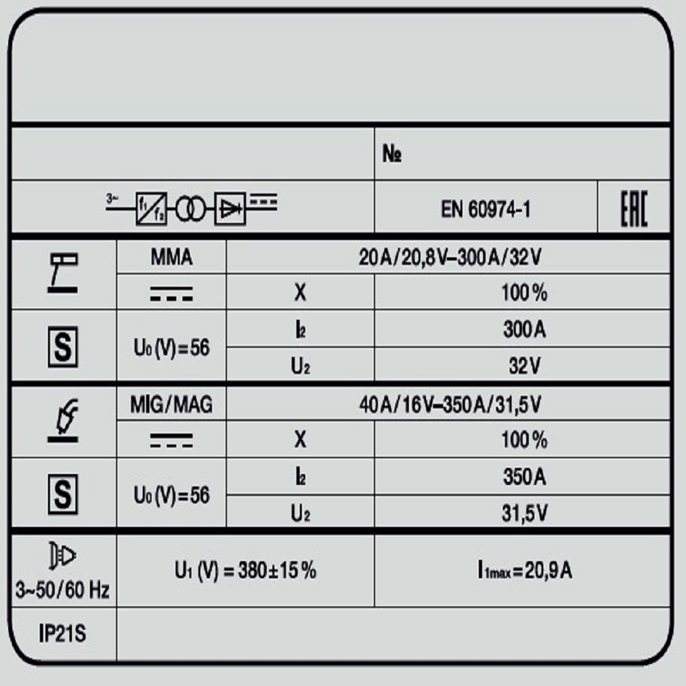 Сварочный полуавтомат FOXWELD INVERMIG 351 PWE — профессиональный промышленный трёхфазный инвертор, позволяющий производить сварку изделий из низкоуглеродистой и легированной стали. Аппарат позволяет проводить полуавтоматическую сварку сплошной проволокой в среде защитного газа MIG/MAG и порошковой проволокой без использования защитного газа, а также ручную дуговую сварку (MMA) штучными электродами. Регулировка индуктивности позволяет вести процесс сварки с минимальным разбрызгиванием металла и приспосабливать процесс к любому типу работ. Конструктивное исполнение сварочного аппарата позволяет промышленному предприятию получить готовый, полноценный сварочный пост благодаря комплекту транспортировочных колёс и раме с платформой для установки газового баллона. На верхней части корпуса сварочного аппарата расположена площадка со специальным прорезиненным покрытием для размещения и хранения инструментов, необходимых сварщику в процессе работы. INVERMIG 351 PWE предназначен для проведения авторемонтных работ, а также в отраслях по производству различных стальных конструкций.РАБОТА БЕЗ ОСТАНОВКИ: ПВ 100% на максимальном токе при КПД 85% обеспечивает бесперебойную устойчивую работу на протяжении всего трудового дня. На задней панели расположена розетка 36 В для подключения подогревателя газа, который необходим для защиты обледенения редуктора во время продолжительной работы.РЕГУЛИРОВКА ИНДУКТИВНОСТИ: С помощью ручной настройки индуктивности можно дополнительно регулировать сварочную дугу для формирования нужного сварного шва. Регулировка индуктивности позволяет вести процесс сварки с минимальным разбрызгиванием металла и приспосабливать процесс к любому типу работ.СВАРКА БЕЗ ЗАЩИТНОГО ГАЗА: Сварочный аппарат позволяет использовать самозащитную сварочную проволоку при полуавтоматической сварке. Самозащитная порошковая проволока даёт возможность проводить сварочные работы без газа, что упрощает процесс сварки даже для неопытного пользователя. Нет необходимости в применении защитного газа, тяжёлых и громоздких газовых баллонов.2 ЦИФРОВЫХ ДИСПЛЕЯ: На панели управления аппарата расположены 2 цифровых дисплея, отображающие значение тока и напряжения во время сварочного процесса, а также индикаторы сети и аварийной сигнализации термозащиты. 4 ручки позволяют регулировать силу сварочного тока в обоих режимах сварки, сварочное напряжение и индуктивность. С помощью кнопок можно менять режимы сварки и включать функцию протяжки проволоки.РАСШИРЕННАЯ КОМПЛЕКТАЦИЯ: Сварочная горелка, щиток сварщика, щётка, газовый шланг, регулятор расхода газа с подогревателем на 36 В, комплекты роликов и кабелей, тележка под баллон с транспортировочными колёсами – в комплекте есть всё для того, чтобы быстро приступить к работе.ПРЕИМУЩЕСТВА:4-роликовый механизм протяжки обеспечивает уверенную подачу даже мягкой проволоки (Al, Cu) и позволяет использовать горелки со шлангом длиной до 5 мВозможность сварки без газа самозащитной проволокойПолностью ручное управление, без влияния возможных погрешностей синергетикиТрёхфазное питание позволяет выдавать большую мощность аппаратам, с равномерной нагрузкой всех трёх линий электросетиПродолжительность работы при максимальном сварочном токе составляет 100% (ПВ 100%)Удобное и простое управление и