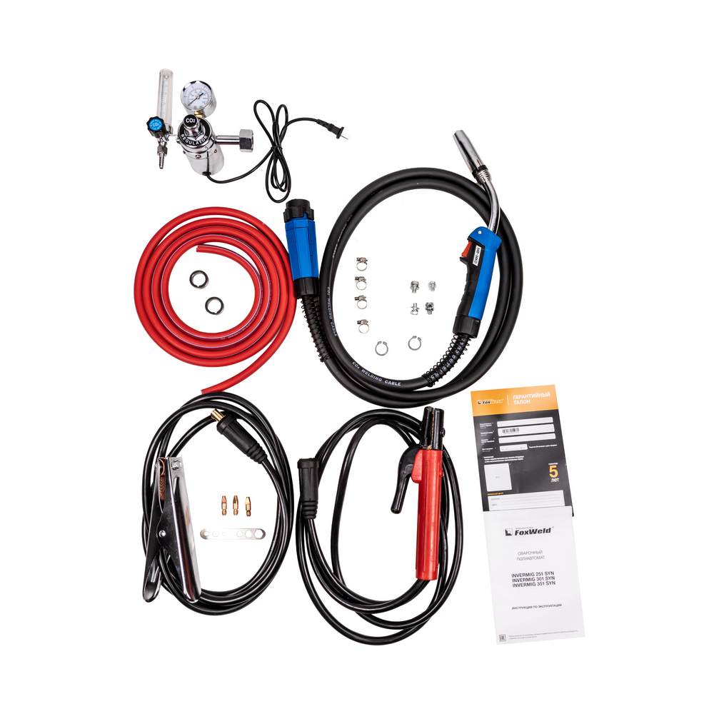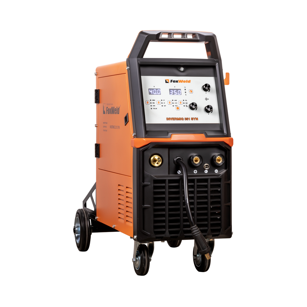 FOXWELD INVERMIG 351 SYN — промышленный многофункциональный трёхфазный синергетический инвертор, позволяющий производить сварку изделий из низкоуглеродистой и легированной стали и алюминия. Аппарат выполнен в едином корпусе со встроенным мощным 4-роликовым механизмом подачи проволоки, рассчитанным для использования катушек D200 (5кг) и D300 (15 кг). 2 цифровых дисплея на панели управления, мощная ручка на корпусе, платформа на колёсах для перемещения с местом для установки баллона с газом – в аппарате есть всё для проведения сварочных работ в сервисных металлоцентрах и при монтаже различных металлоконструкций.РАБОТА БЕЗ ОСТАНОВКИ: ПВ 100% на максимальном токе при КПД 85% обеспечивает бесперебойную устойчивую работу на протяжении всего трудового дня. На задней панели расположена розетка 36 В для подключения подогревателя газа, который необходим для защиты обледенения редуктора во время продолжительной работы.МНОГОФУНКЦИОНАЛЬНОСТЬ 3-В-1: Благодаря своей многофункциональности, аппарат позволяет проводить следующие процессы сварки: полуавтоматическую сварку сплошной проволокой в среде защитных газов с ручным режимом настройки параметров сварки, с синергетическим управлением параметрами сварки (MIG/MAG), полуавтоматическую сварку самозащитной проволокой без использования защитного газа, ручную дуговую сварку штучным электродом с покрытием (ММА), аргонодуговую сварку на постоянном токе с возбуждением дуги касанием вольфрамового электрода (TIG LIFT).СИНЕРГЕТИЧЕСКИЙ РЕЖИМ УПРАВЛЕНИЯ: Полностью синергетическое управление "одной кнопкой". Режим синергетики позволяет сэкономить время и получить качественное сварное соединение даже новичку, так как основные сварочные параметры подбираются автоматически. С помощью синергетического режима управления можно легко и быстро настроить аппарат под любую задачу. Преимущества синергетики: простота в настройке даже неквалифицированным персоналом, быстрая установка сварочных параметров, высокая производительность, гарантированное получение качественного сварного соединения. Синергетику можно отключить для работы в ручном режиме.4-РОЛИКОВЫЙ МЕХАНИЗМ ПОДАЧИ: 4-роликовый механизм подачи с 4-мя ведущими роликами подаёт проволоку в область сварки без проскальзывания и рывков при использовании длинных сварочных горелок, что обеспечивает меньшее давление и деформацию сварочной проволоки. Механизм подачи с 4-мя ведущими роликами отлично подходит для сварочной порошковой проволоки, проволоки, сделанной из алюминия, и даёт дополнительные преимущества при производстве и в монтажных условиях. Подача проволоки осуществляется с высокой точностью и надёжностью, что влияет на производительность, качество сварочного шва и время использования сварочного аппарата.ФУНКЦИЯ VRD: Функция VRD (снижение напряжения холостого хода) повышает безопасность и исключает риск поражения сварщика электрическим током. Сварочный процесс становится более безопасным в замкнутых пространствах и при сварке в условиях повышенной влажности.ПРЕИМУЩЕСТВА:Синергетический режим управленияАргонодуговая сварка (TIG LIFT) на постоянном токеСварка без газа самозащитной проволокойСинергетический режим управленияРежим работы горелки 2Т / 4Т / Special 4TФункции Hot Start (Горячий Старт), AntiSticking (Антизалипание) и Arc Force (Форсаж Дуги)Функция VRD (сниж
